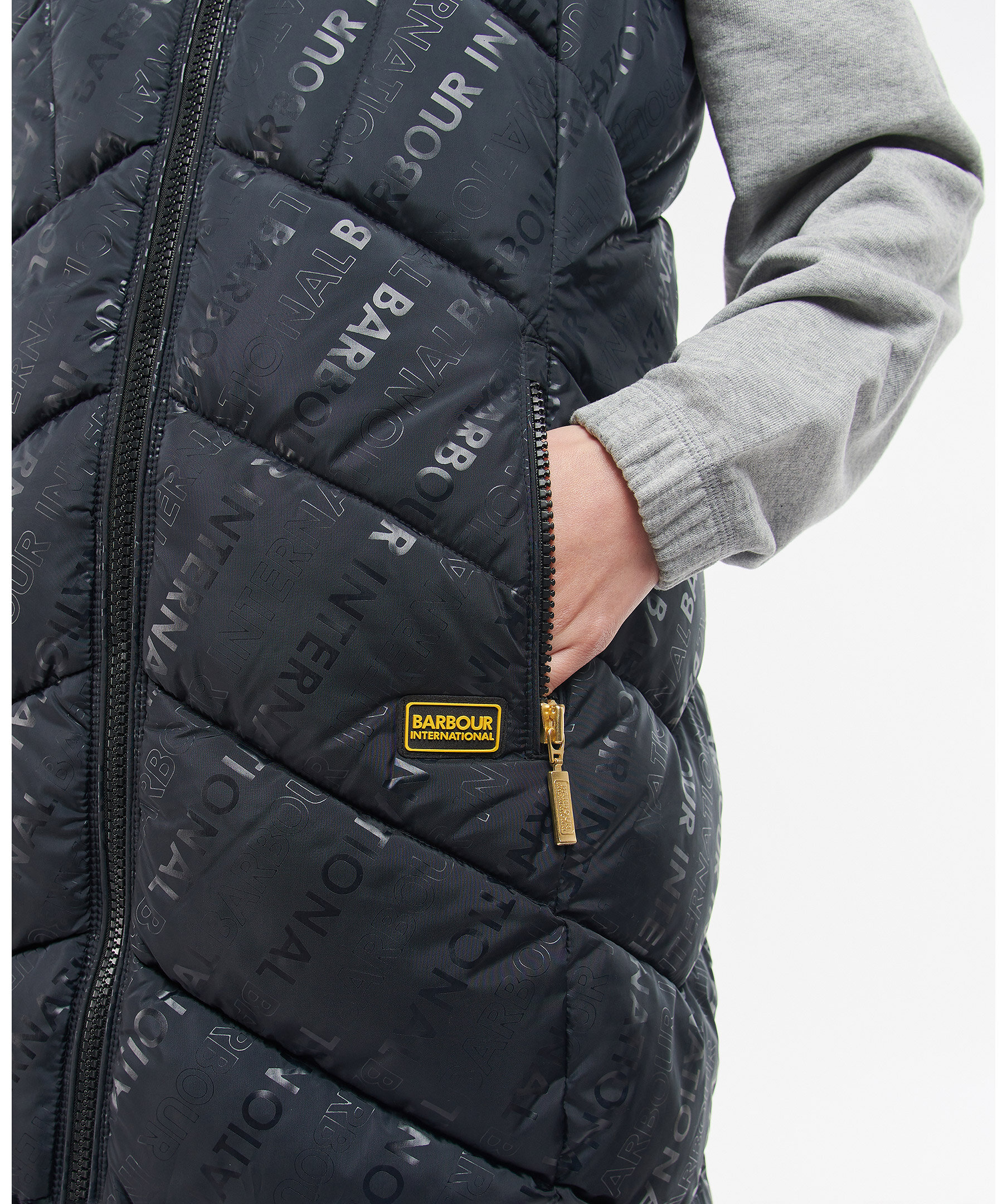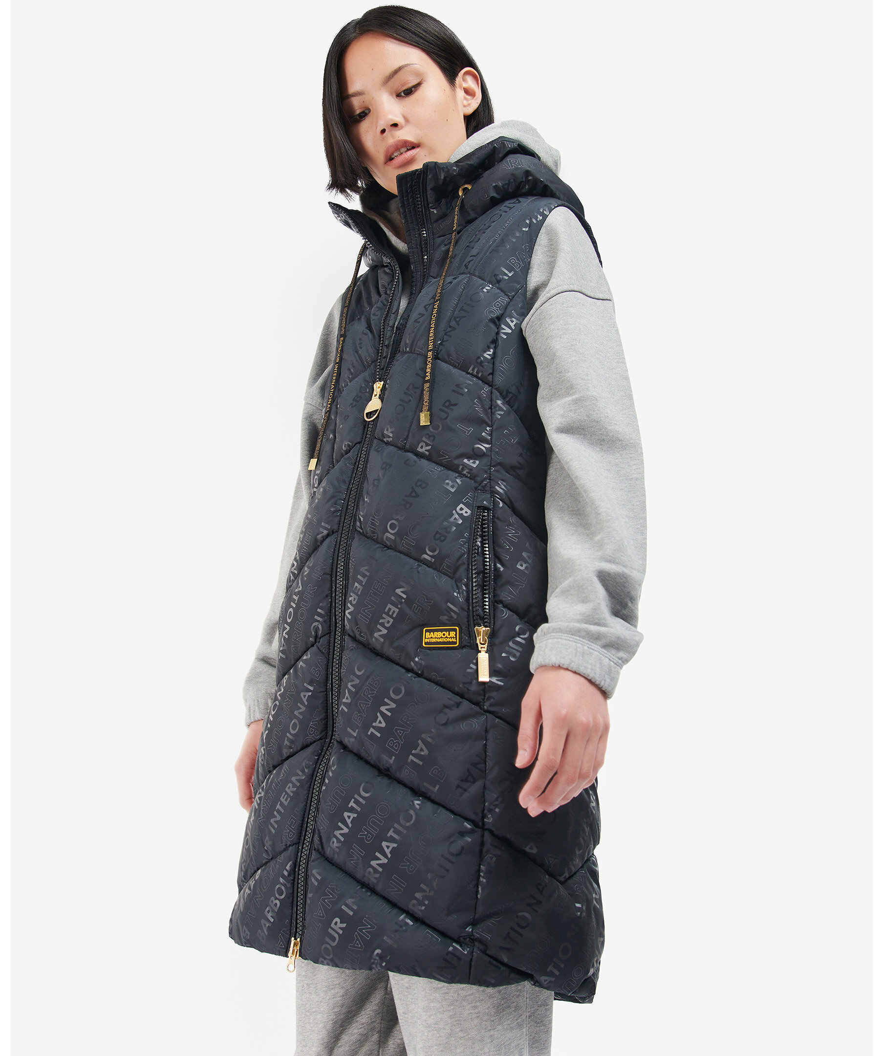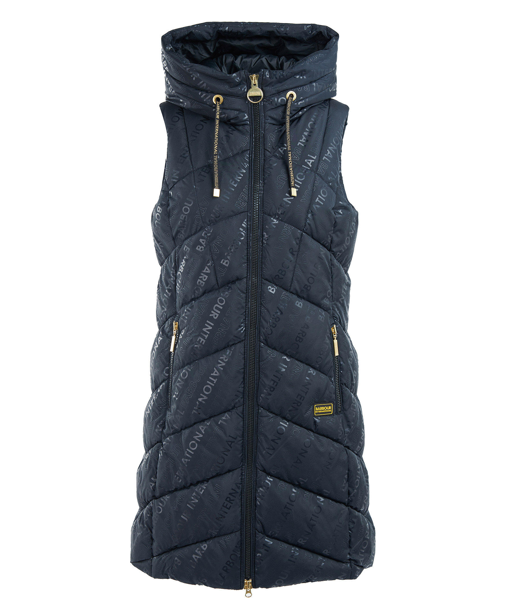 Svart, diagonalt quiltad och lång väst med tryckta, glansiga logotyper som mönster över hela västen från Barbour International. Sportigt inspirerad design med en fast luva och stängs med dragkedja med gulddetaljer. Dragsko i luvan med guldfärgade logotyper på, två framfickor med dragkedja samt gummerad logotyp vid den vänstra fickan. Tillverkad i Polyester.