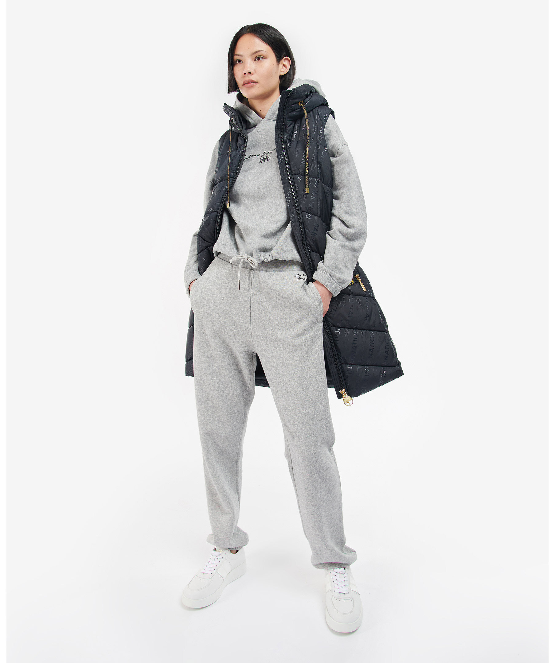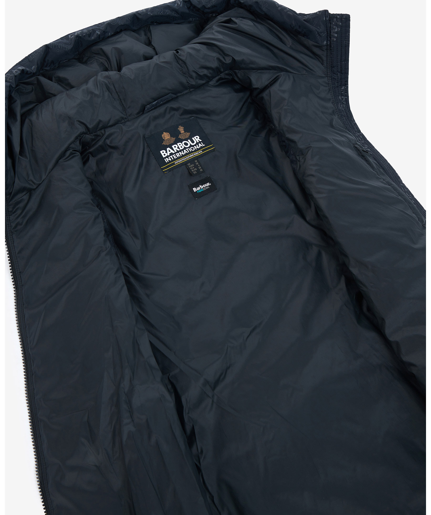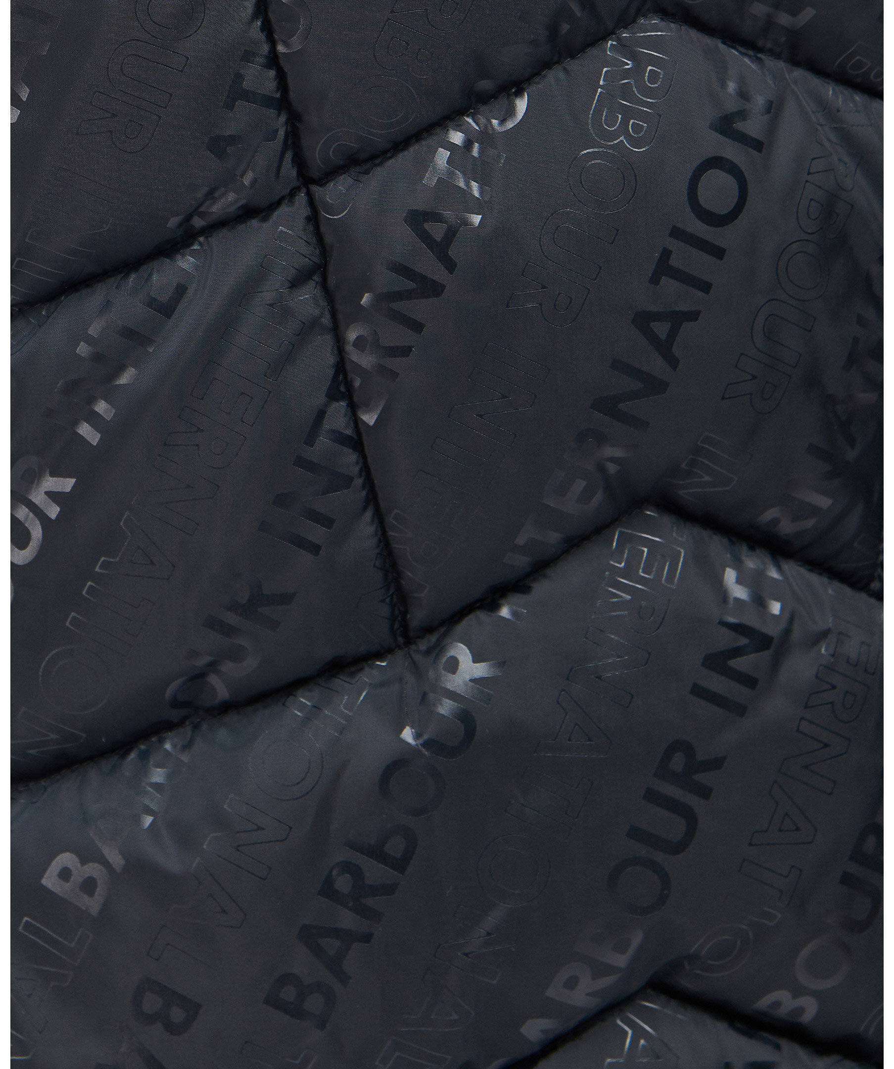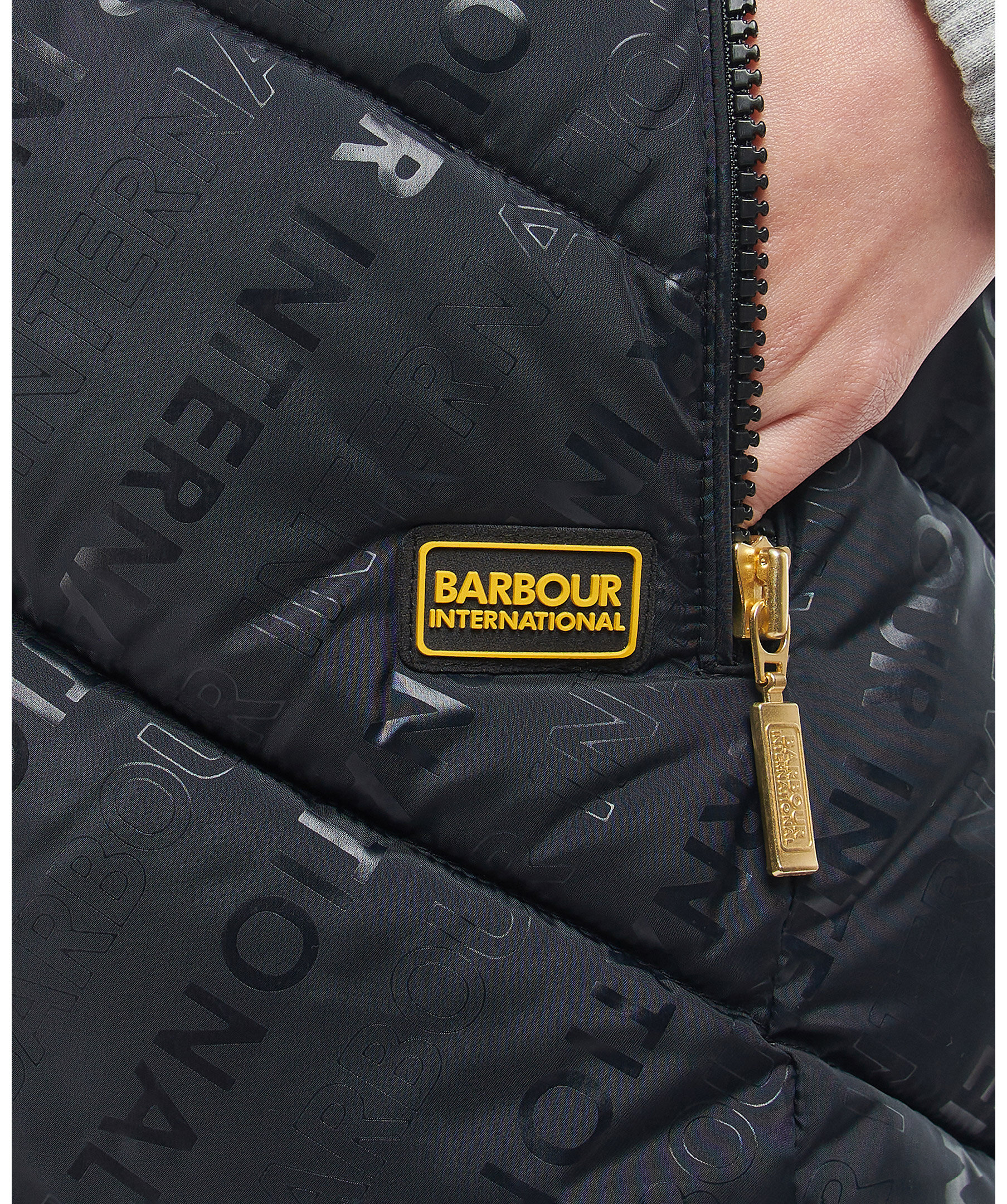 Svart, diagonalt quiltad och lång väst med tryckta, glansiga logotyper som mönster över hela västen från Barbour International. Sportigt inspirerad design med en fast luva och stängs med dragkedja med gulddetaljer. Dragsko i luvan med guldfärgade logotyper på, två framfickor med dragkedja samt gummerad logotyp vid den vänstra fickan. Tillverkad i Polyester.
