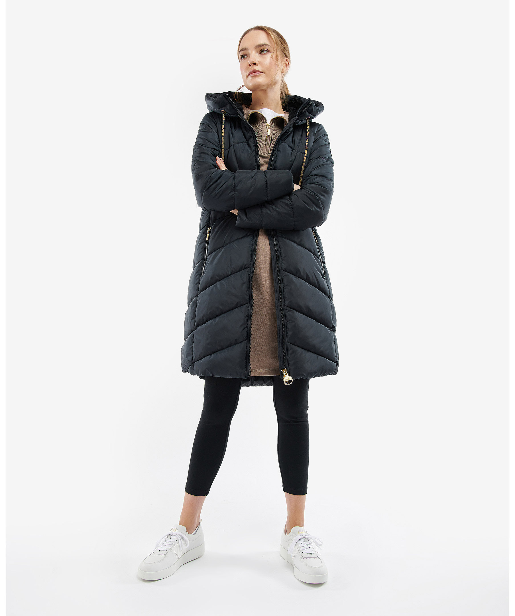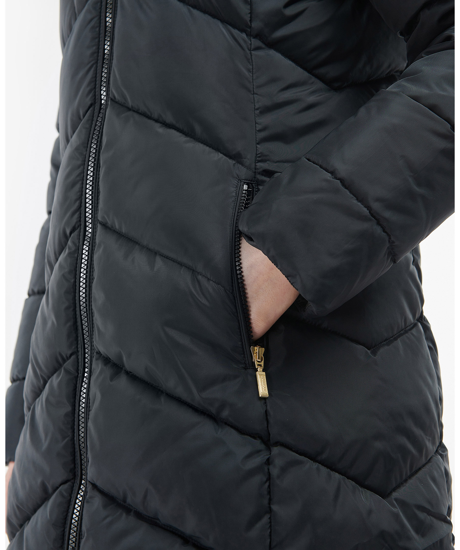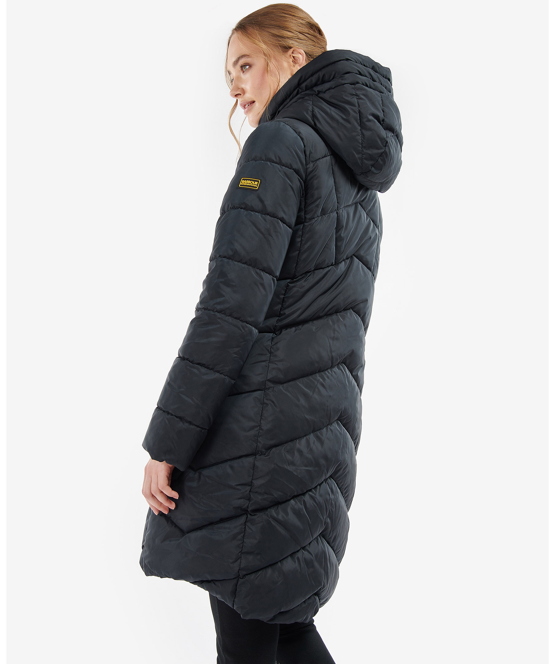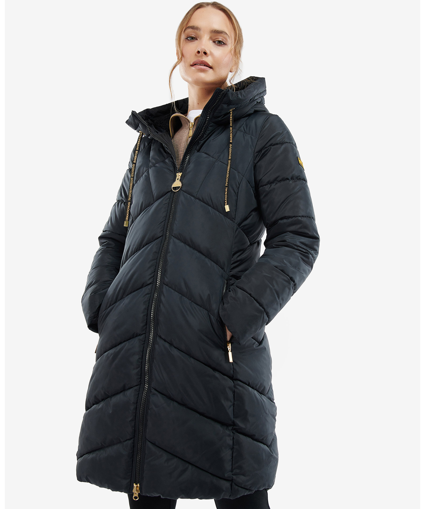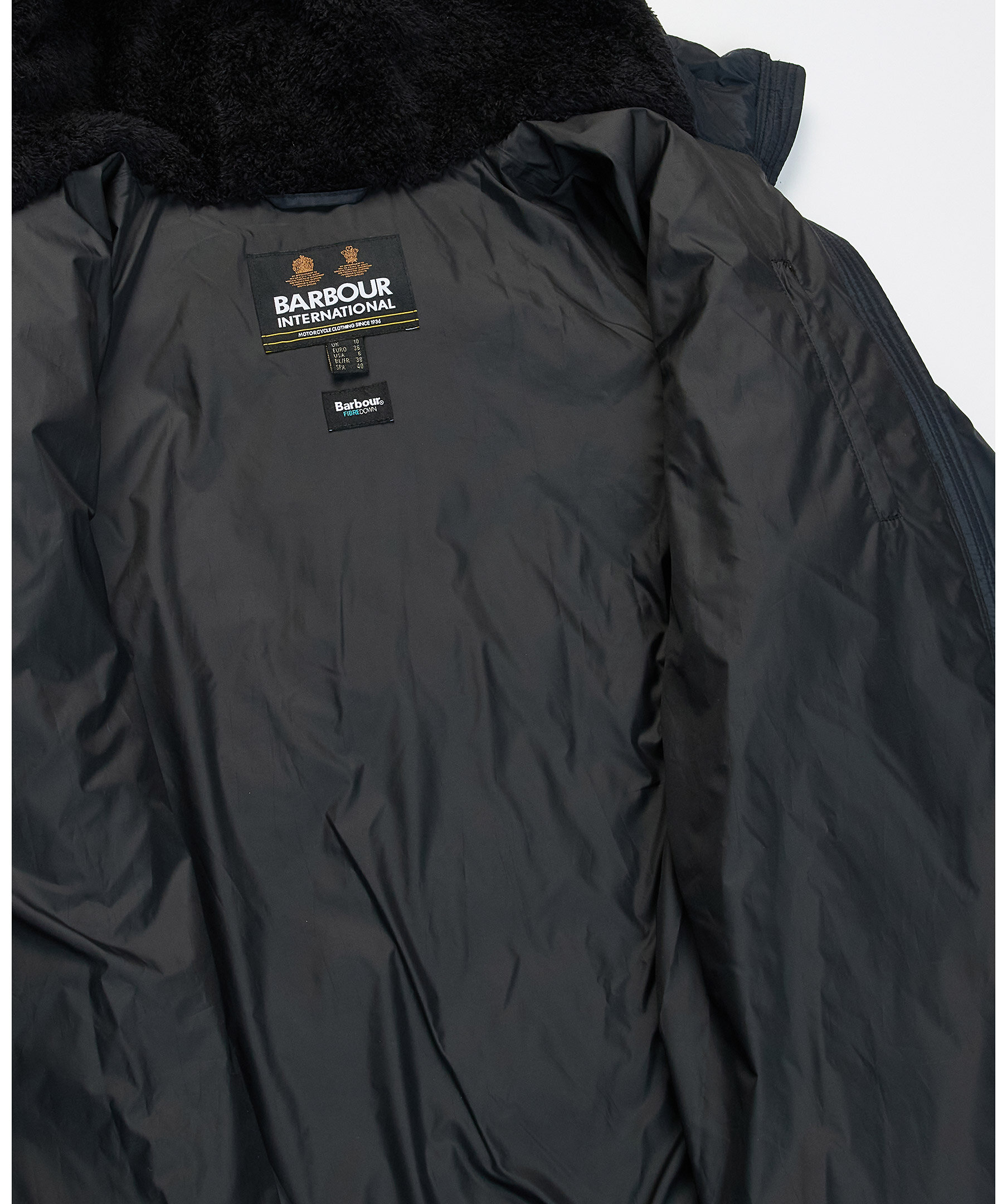 Svart lång jacka från Barbour International. En sportigt inspirerad design med en fast luva med foder av fuskpäls i svart och bred snörning med tryckta logotyper. Tvåvägsdragkedja fram, två framfickor med dragkedja och en innerficka med dragkedja. Halvblankt tyg i polyester och gummerad logotyp på vänster ärm.