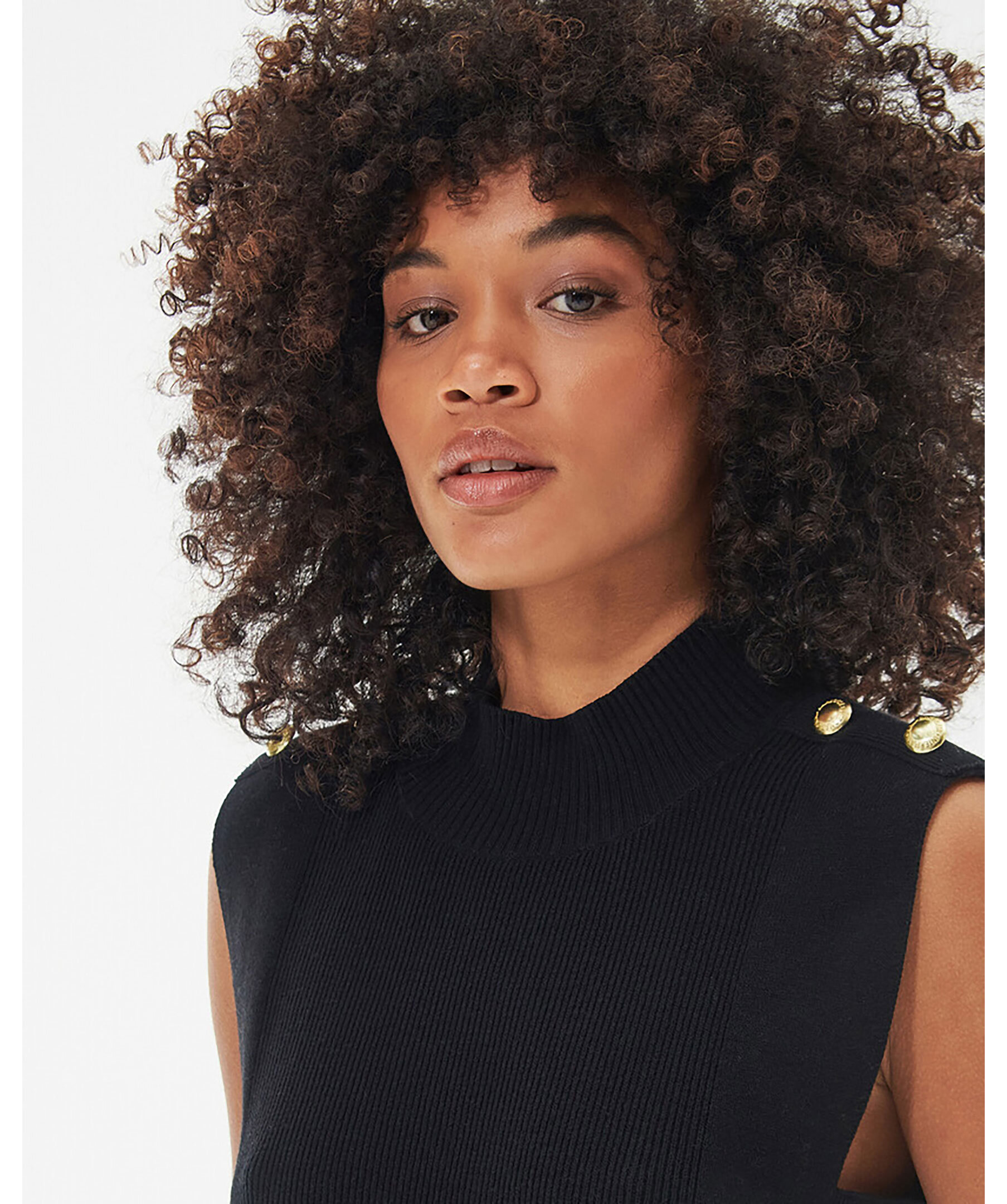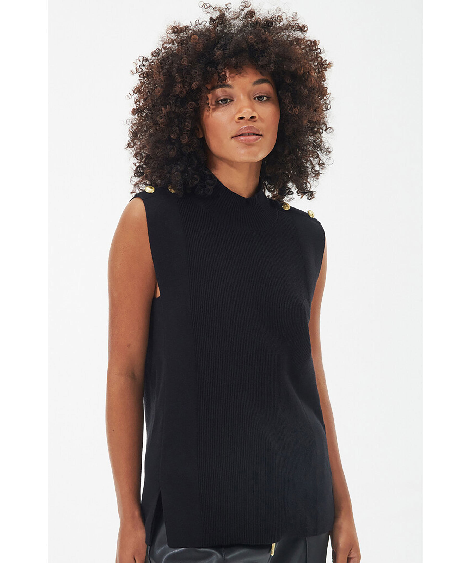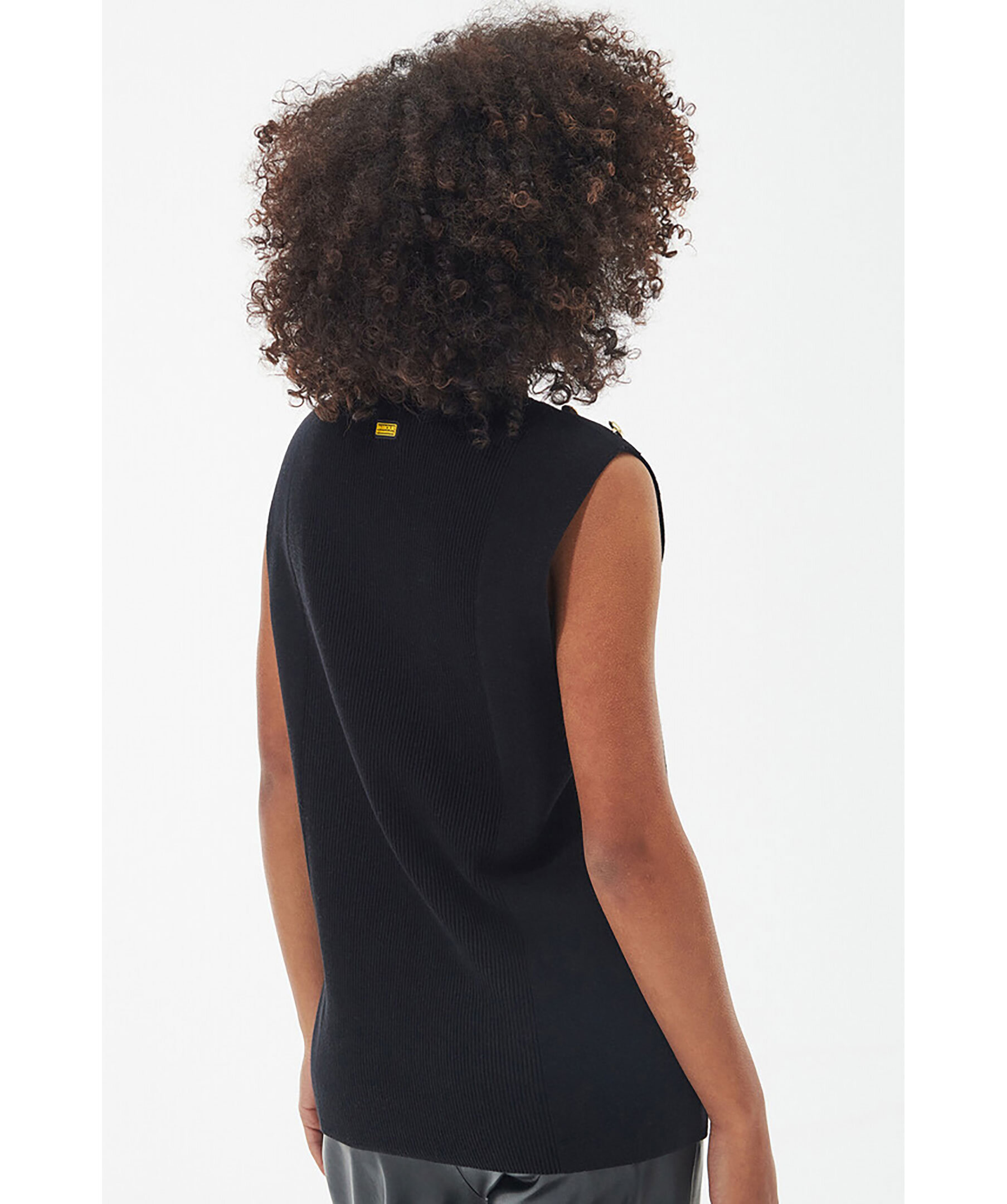 Svart ribbstickad väst från Barbour. Tillverkad av bomull. Västen har deras guldfärgade signaturknappar på axlarna och något högre hals. Gummerad logotyp i nacken. Korta slitsar vid plaggslut.