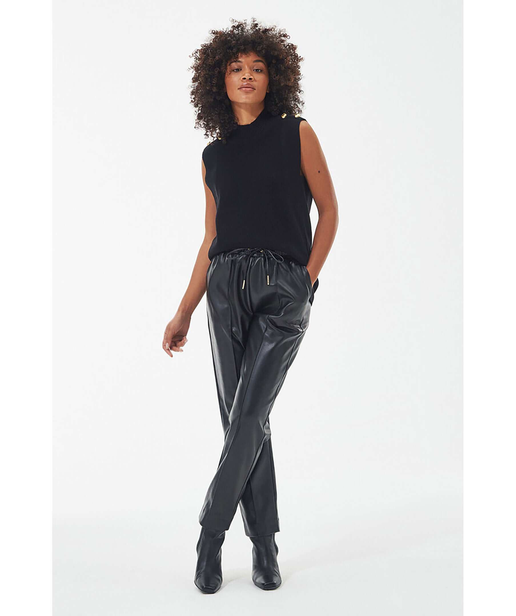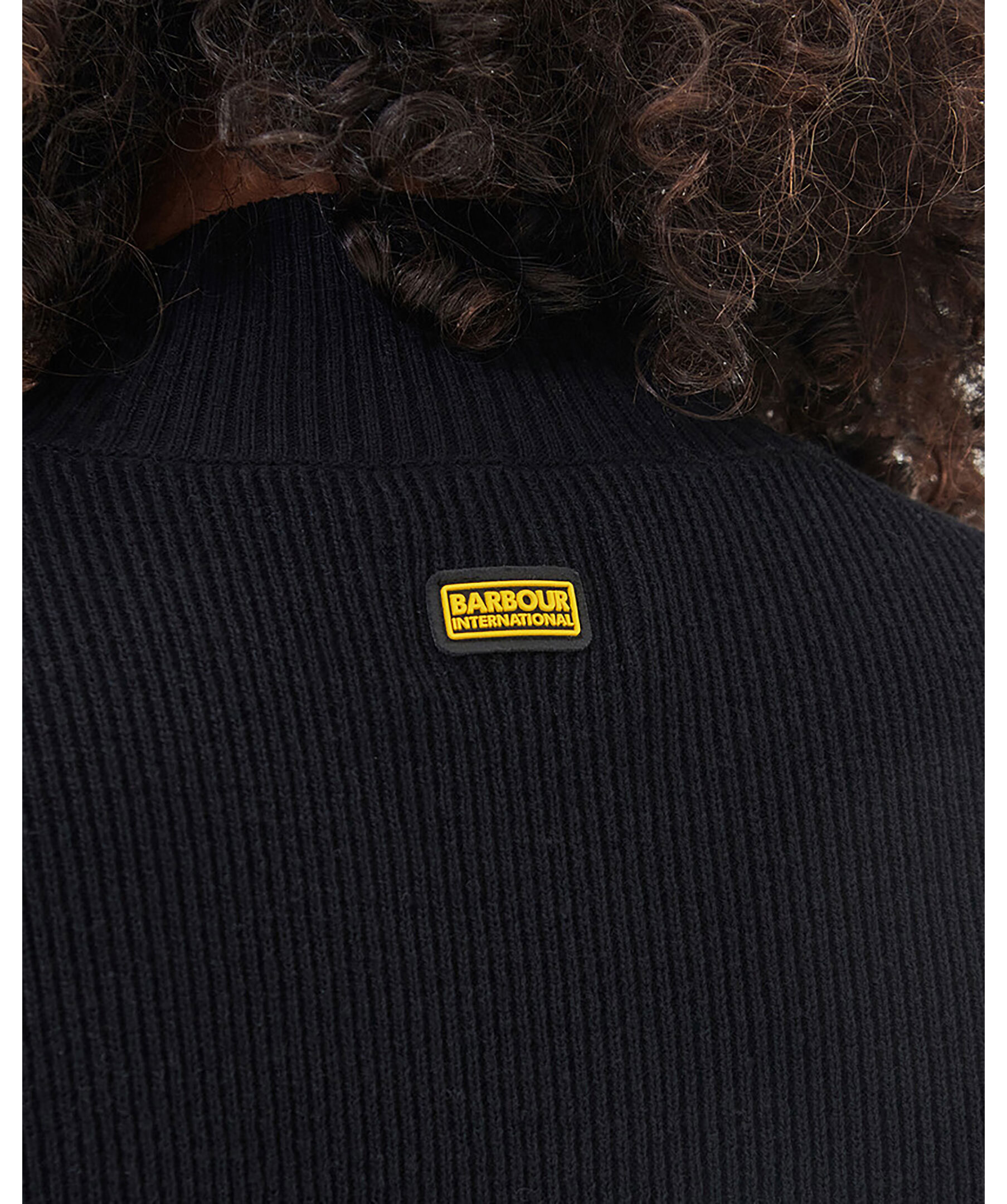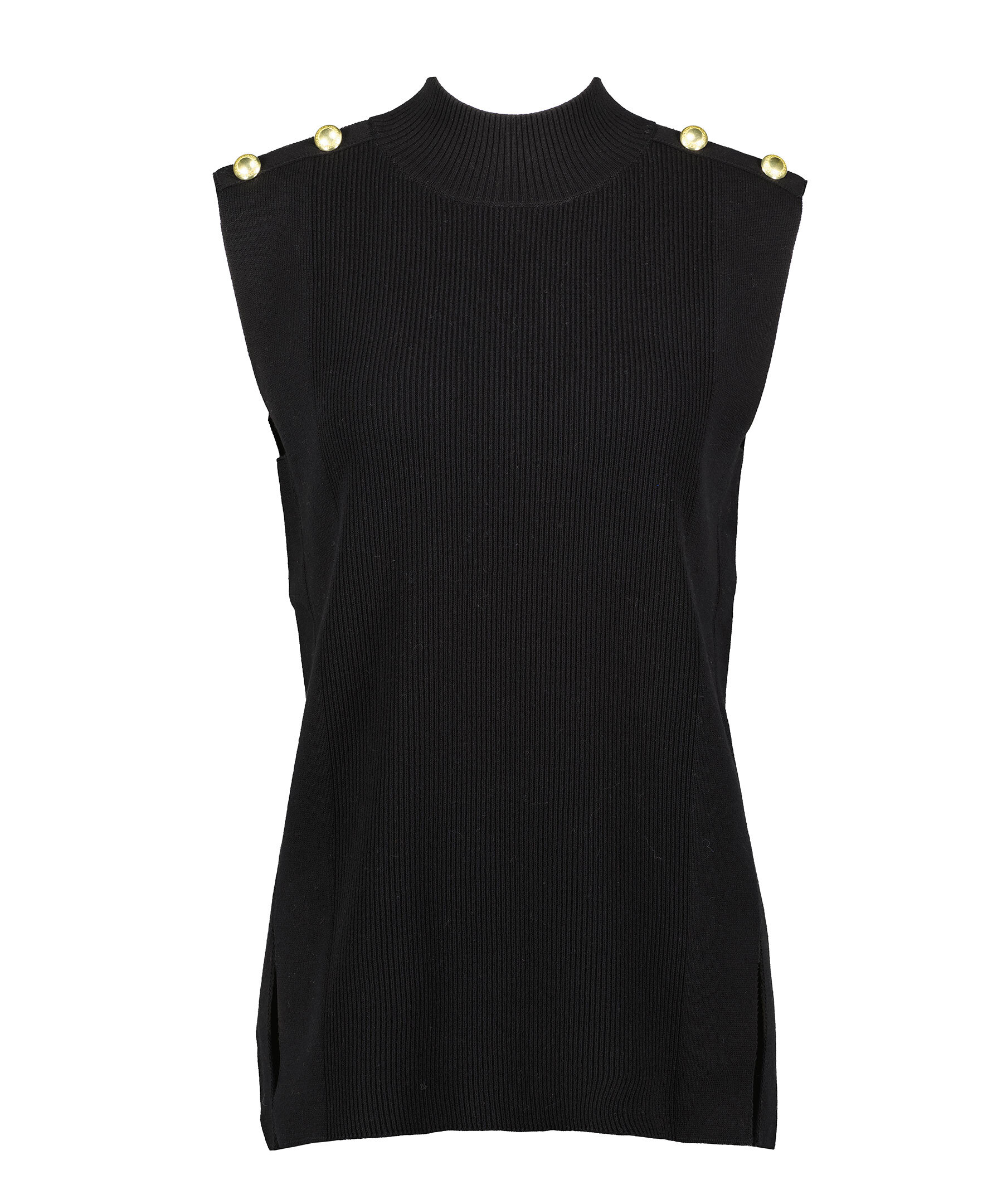 Svart ribbstickad väst från Barbour. Tillverkad av bomull. Västen har deras guldfärgade signaturknappar på axlarna och något högre hals. Gummerad logotyp i nacken. Korta slitsar vid plaggslut.