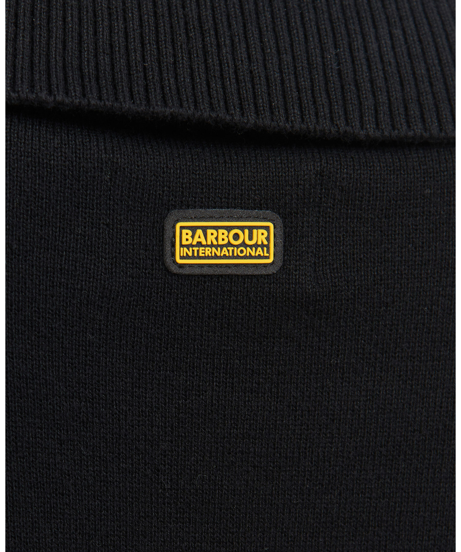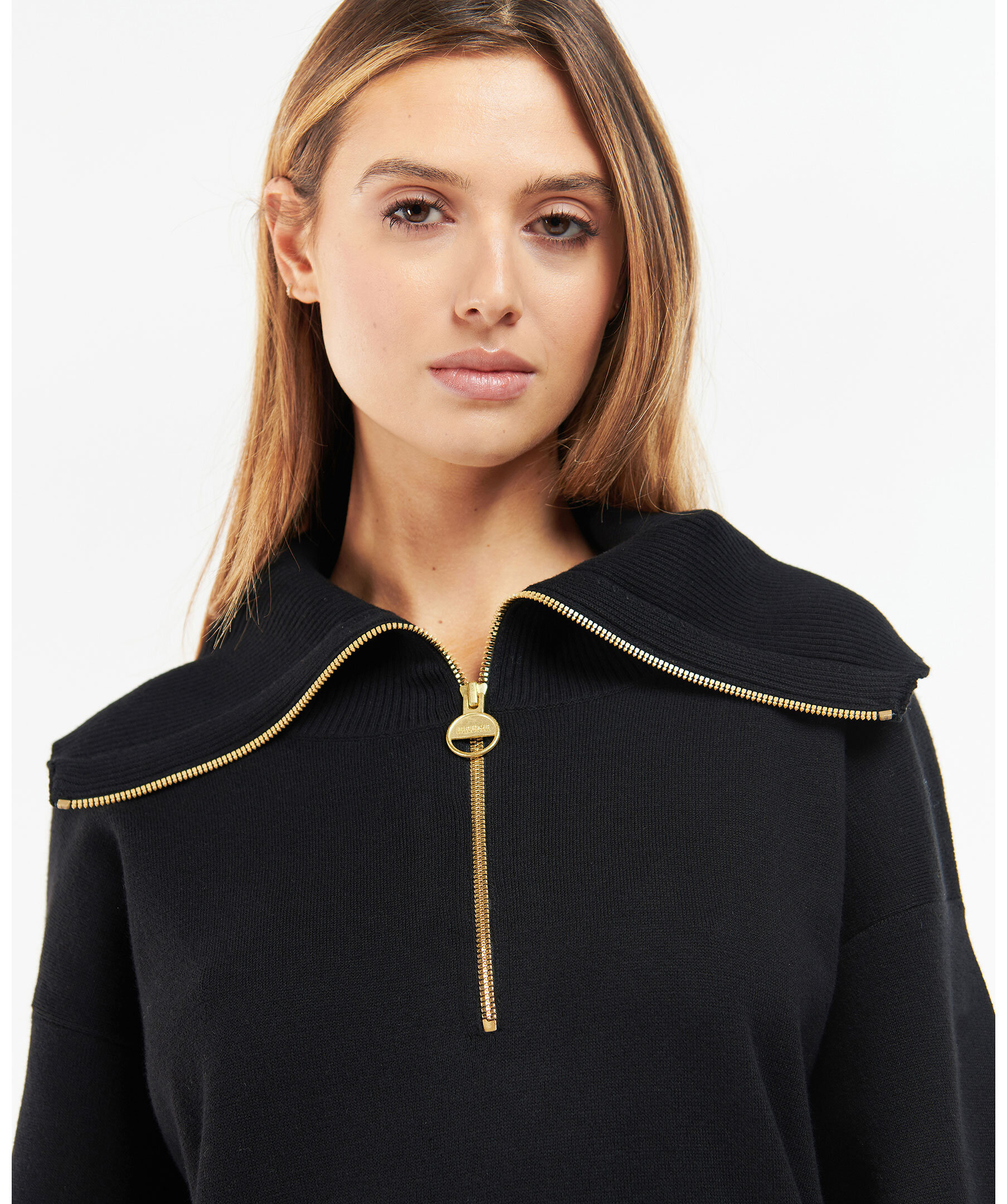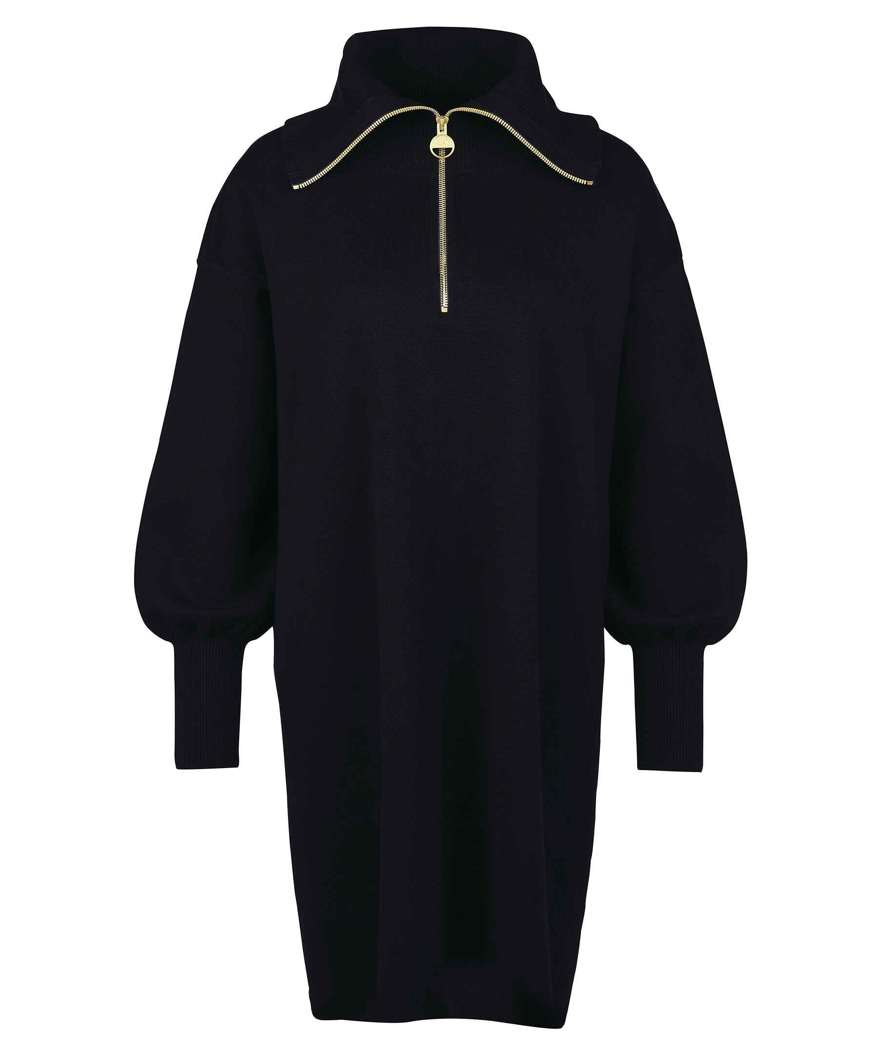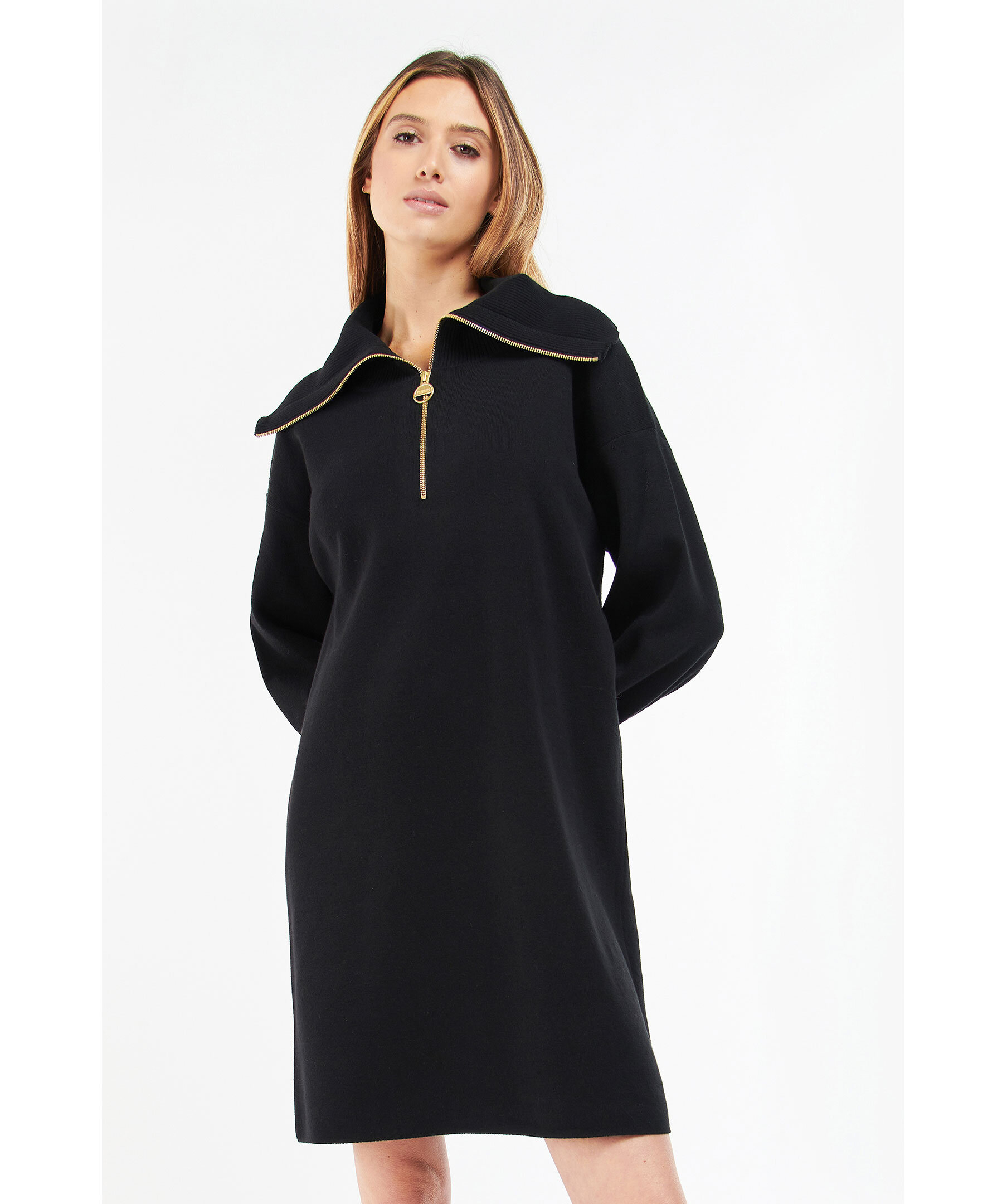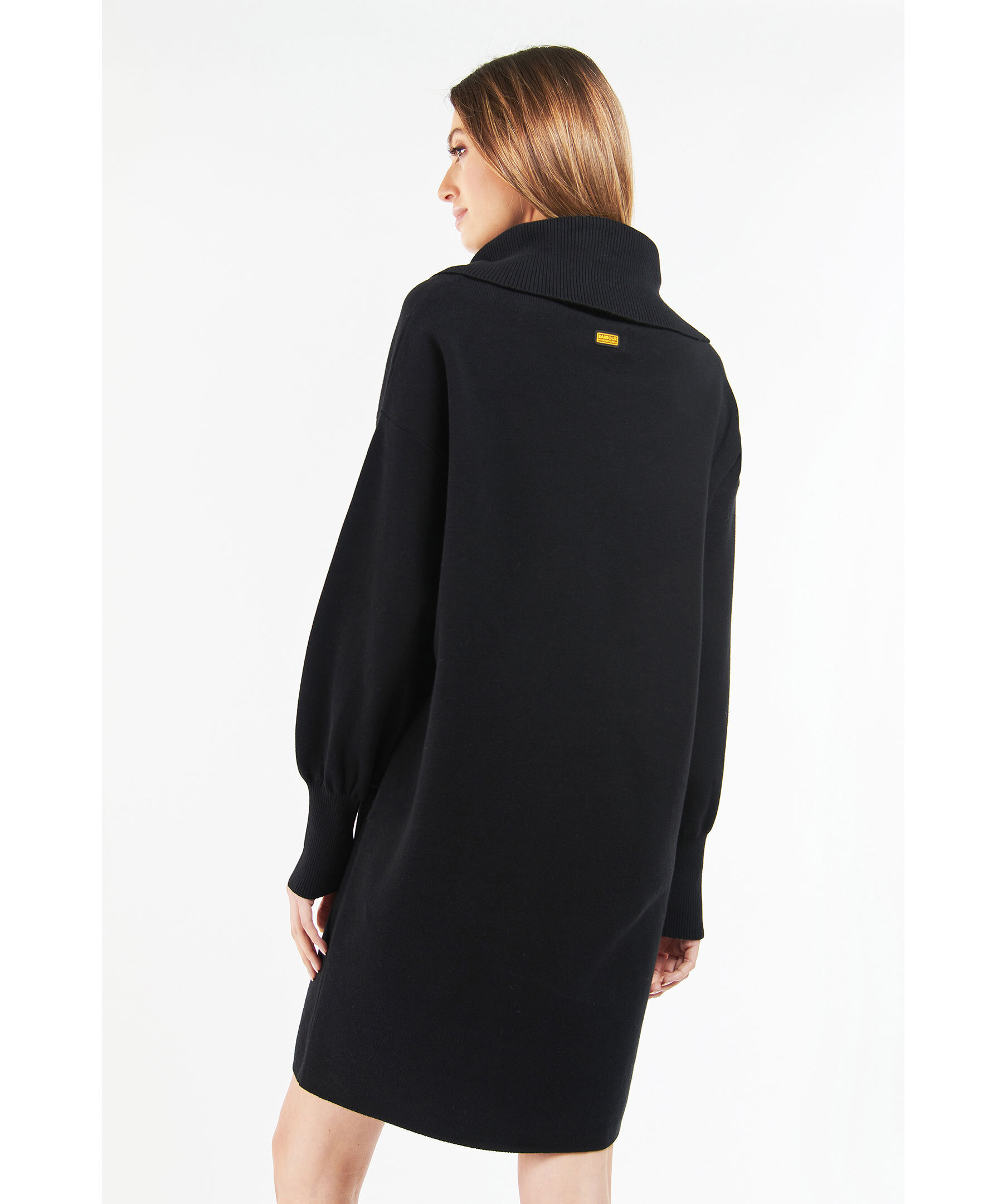 Svart, finstickad klänning i bomullsblandning från Barbour International. Slutar strax ovanför knät och har en bred krage med guldfärgad half-zip dragkedja framtill. Tappade axlar och voluminösa ärmar med muddar för en mer feminin finish. Liten broderad patch i nacken med logotyp.