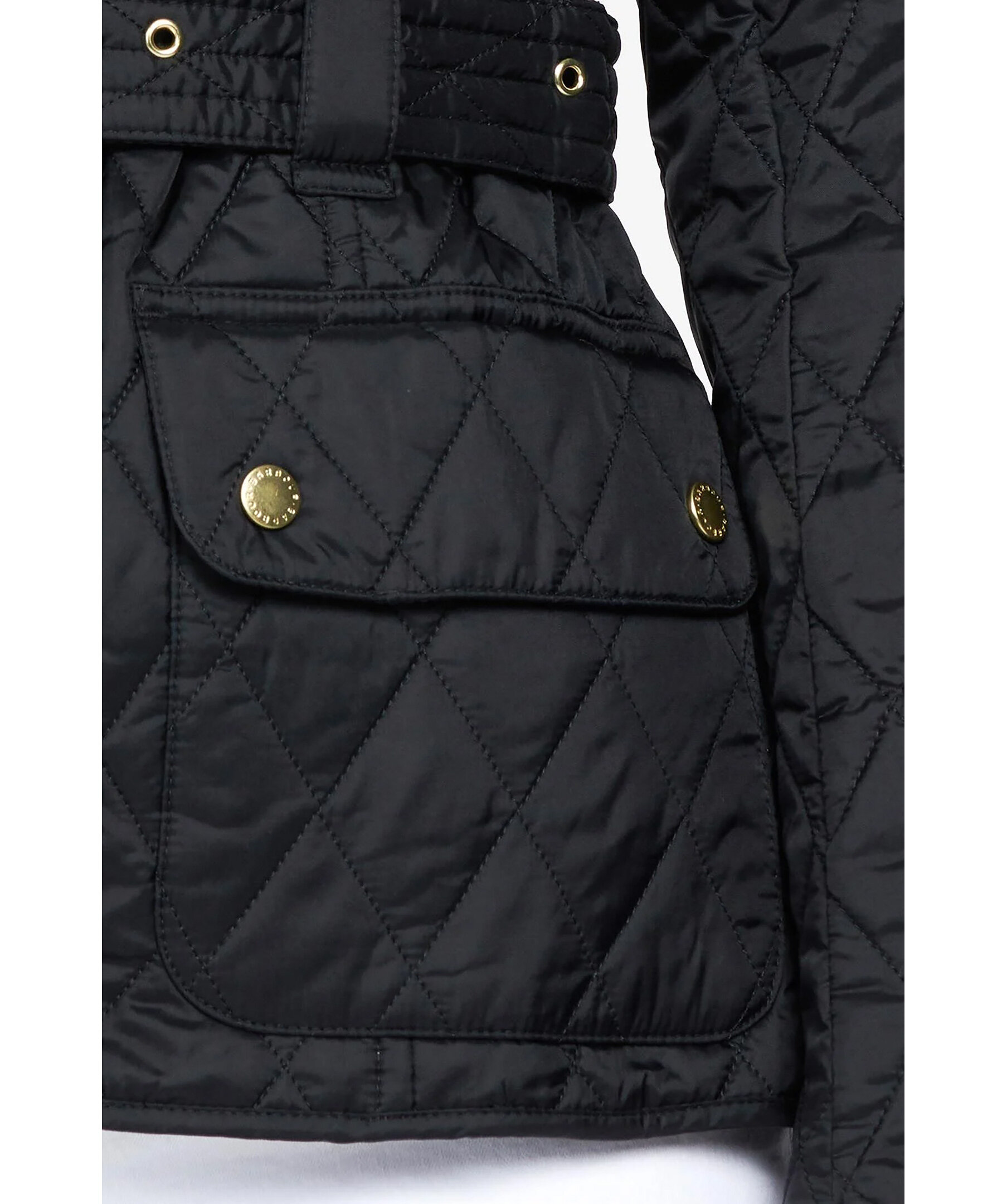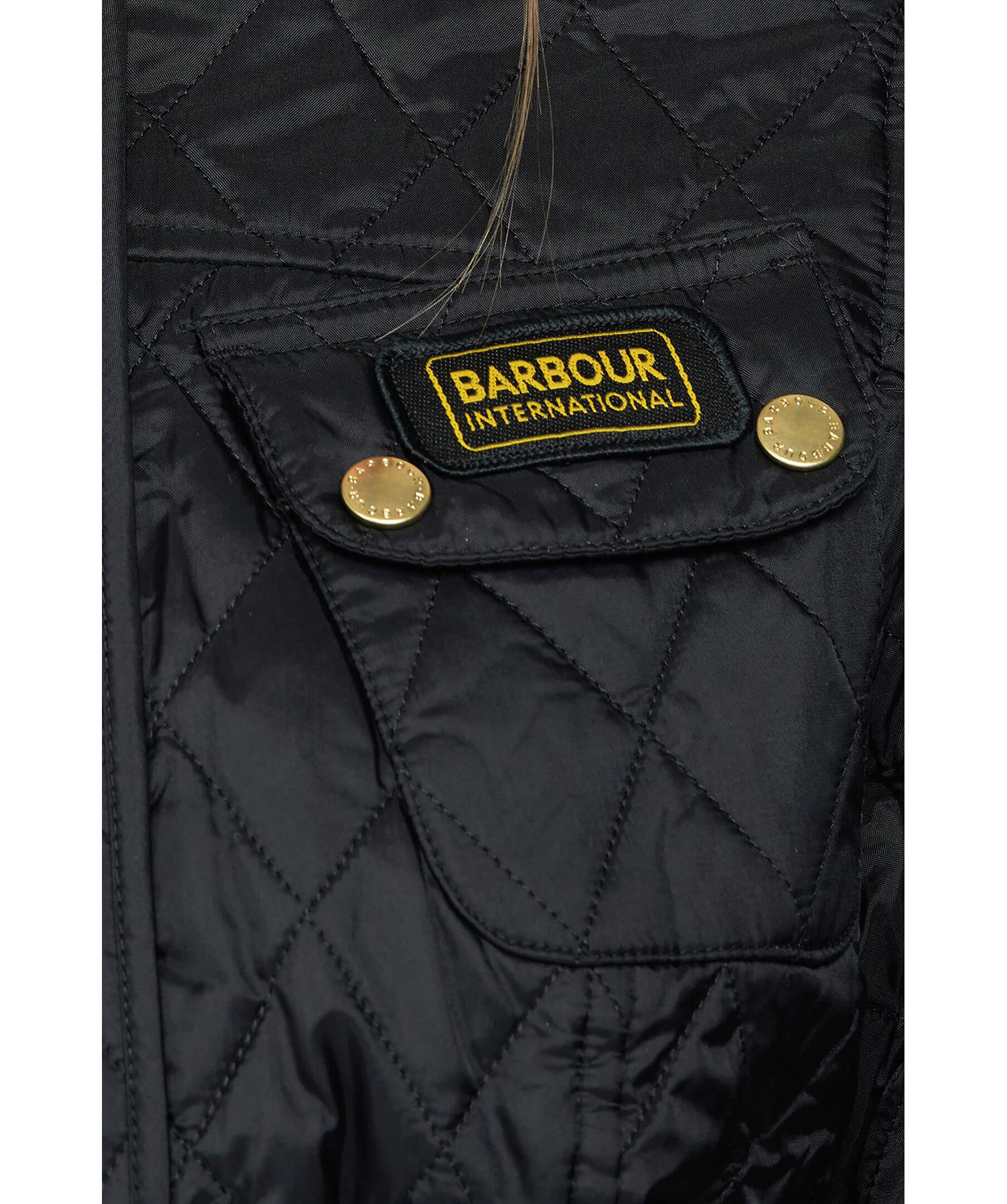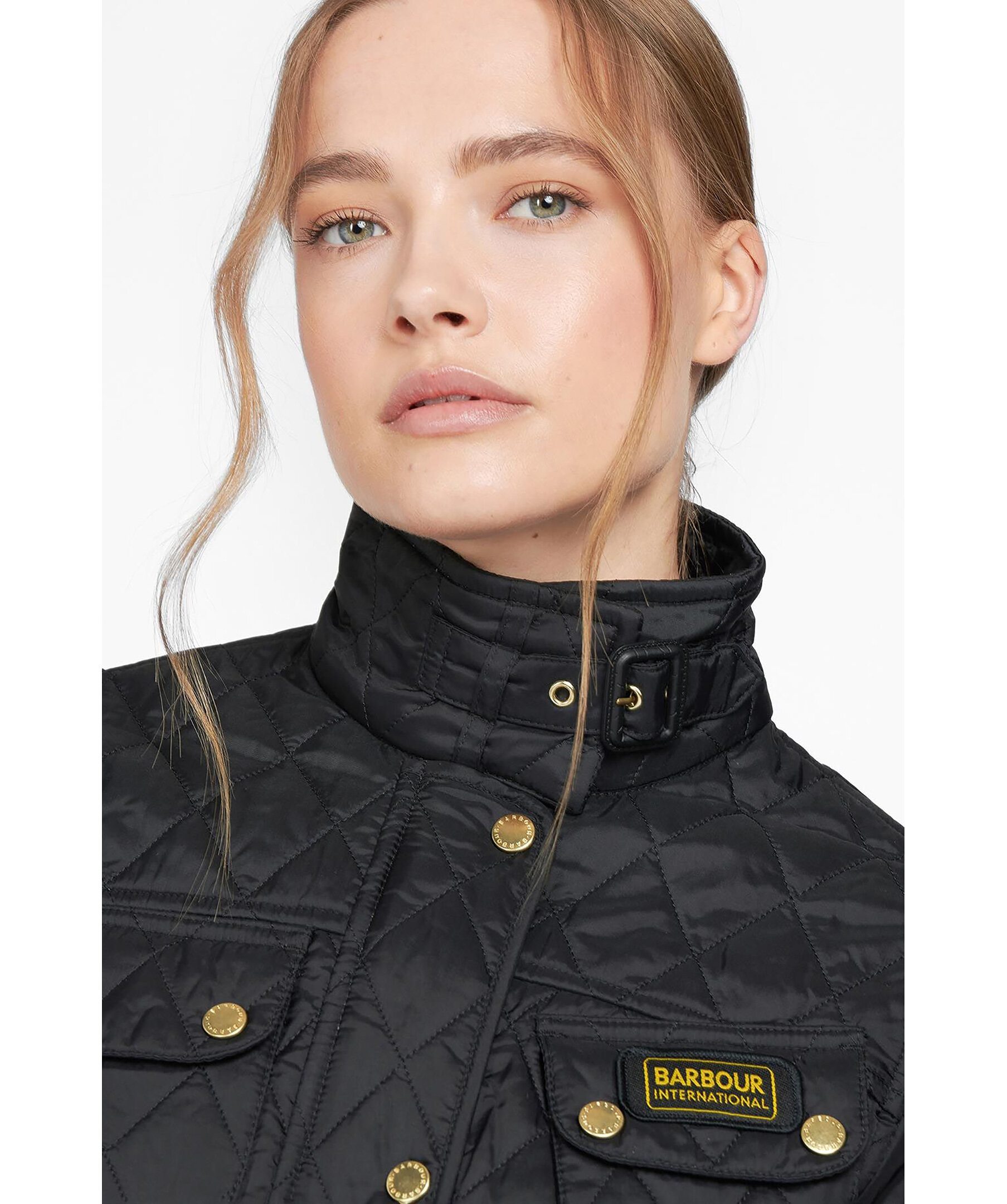 Quiltad vårjacka med fyra fickor fram och bälte i midjan samt en liten ficka på ärmen. Barbour International logotyp på vänster bröst.