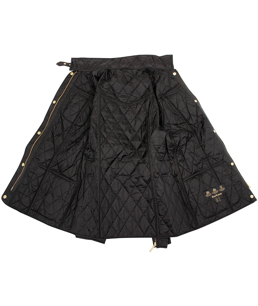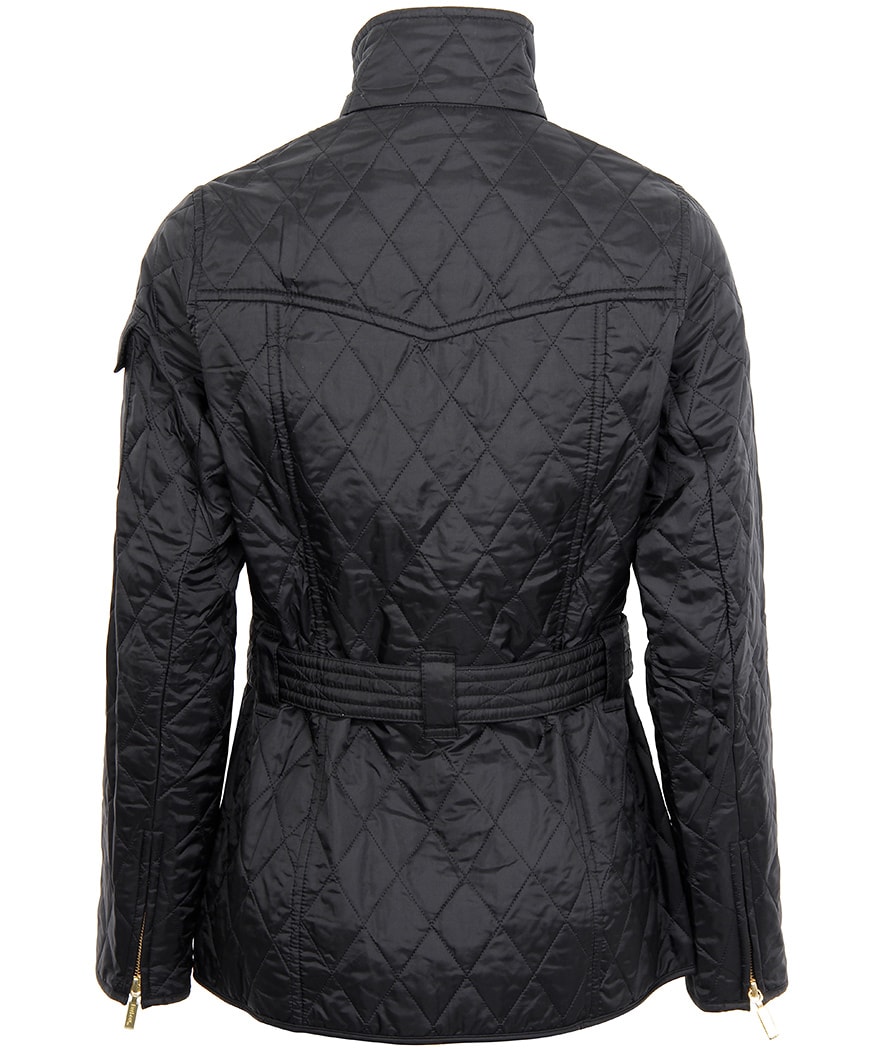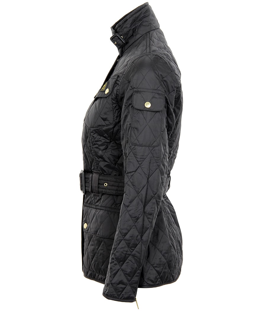 Quiltad vårjacka med fyra fickor fram och bälte i midjan samt en liten ficka på ärmen. Barbour International logotyp på vänster bröst.