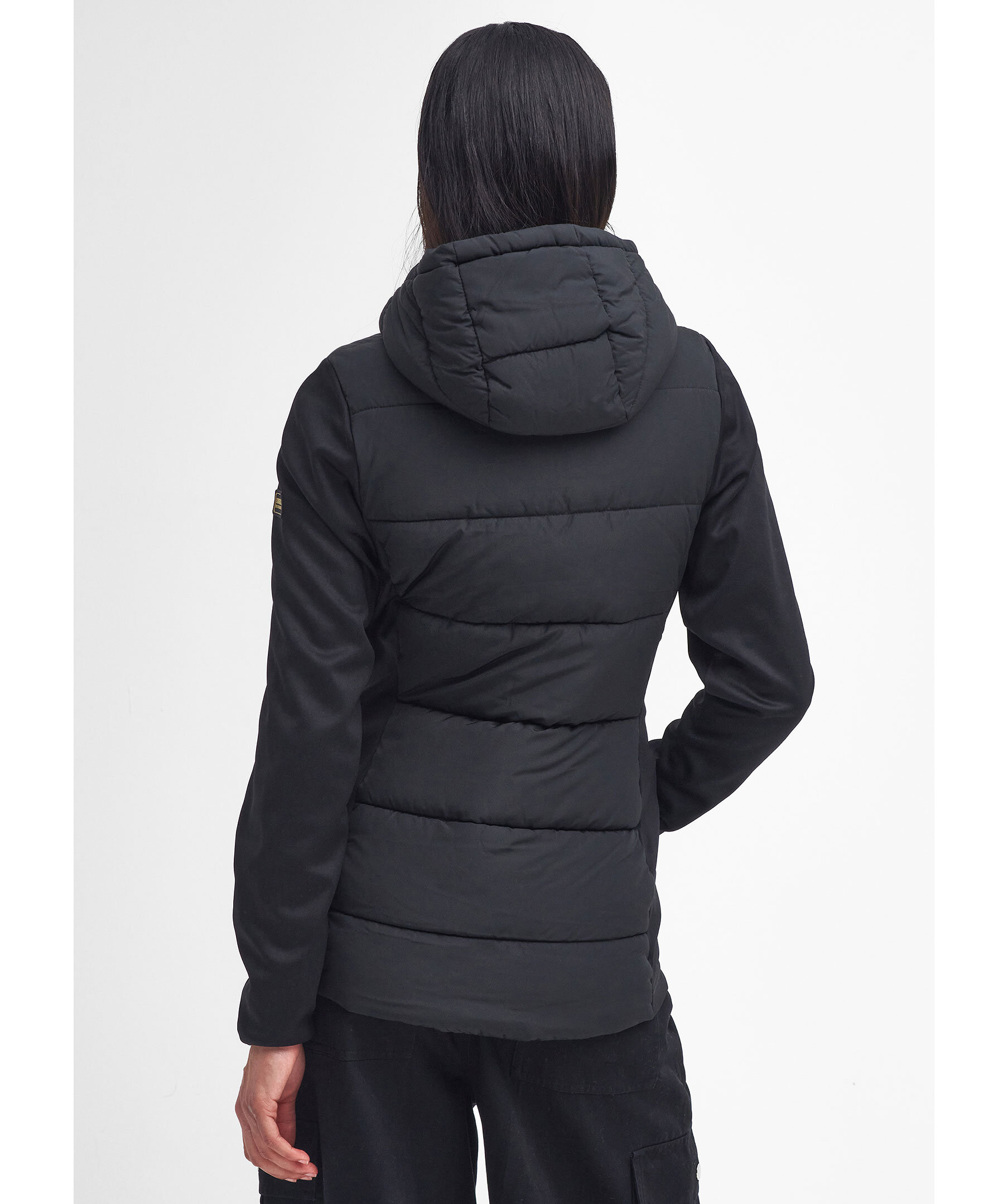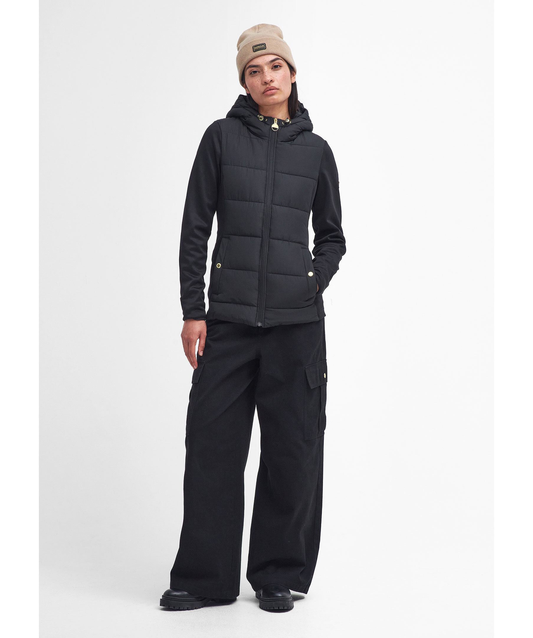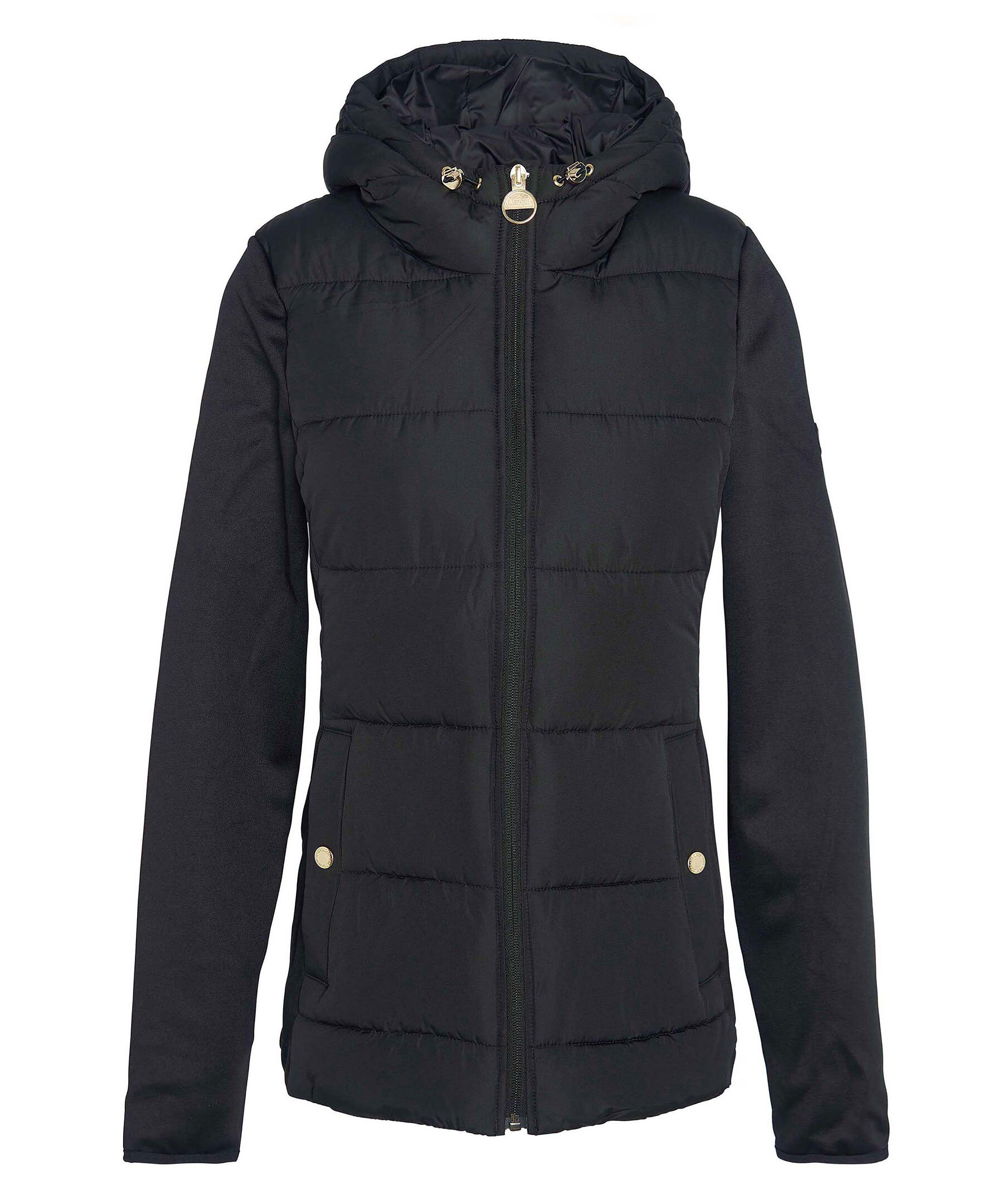 Svart, quiltad hybridjacka från Barbour. Jackan stängs med dragkedja och har huva med dragsko, två sidfickor med tryckknapp och logotyp i gummi på vänster ärm. Tillverkad i en polyesterblandning.