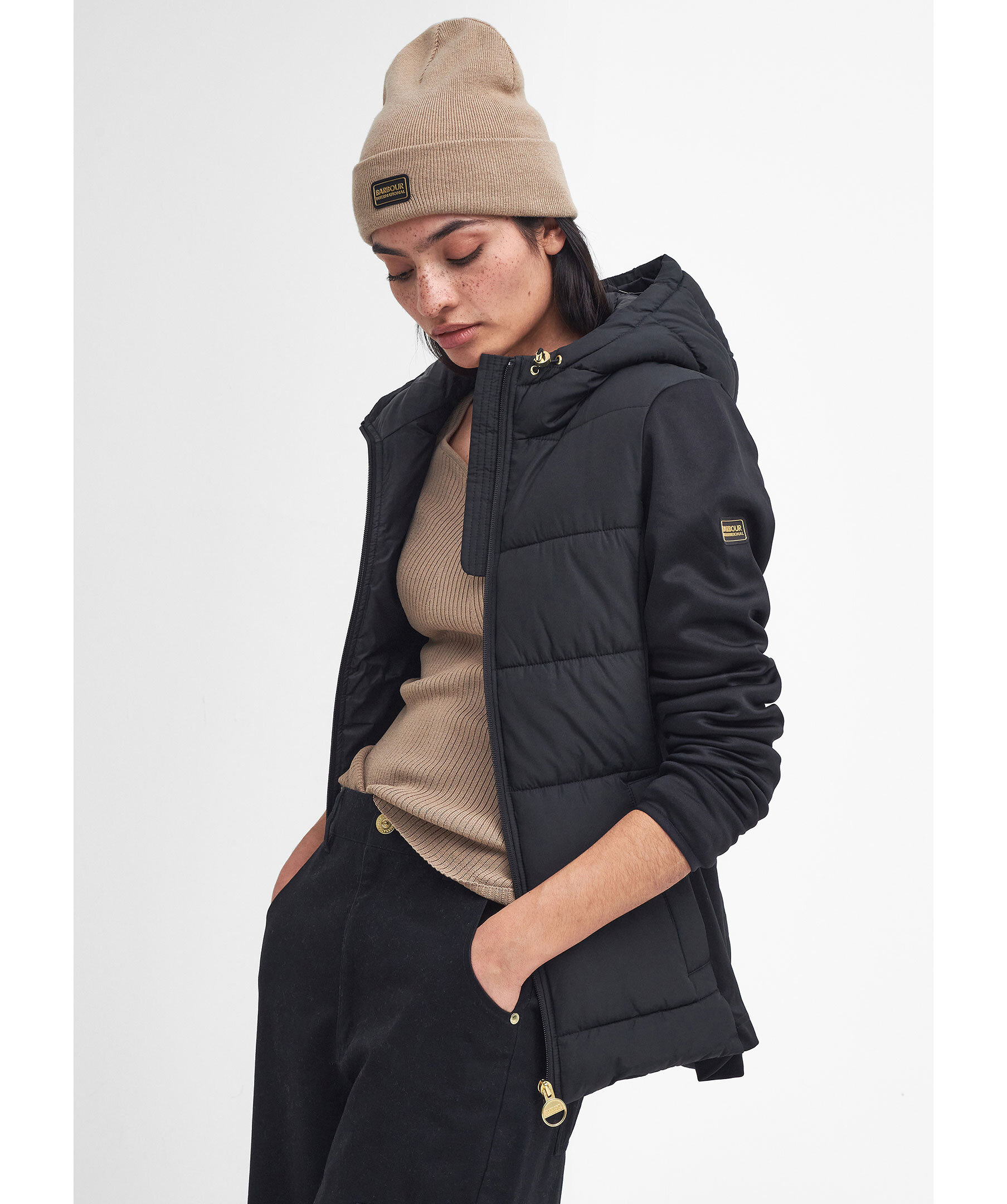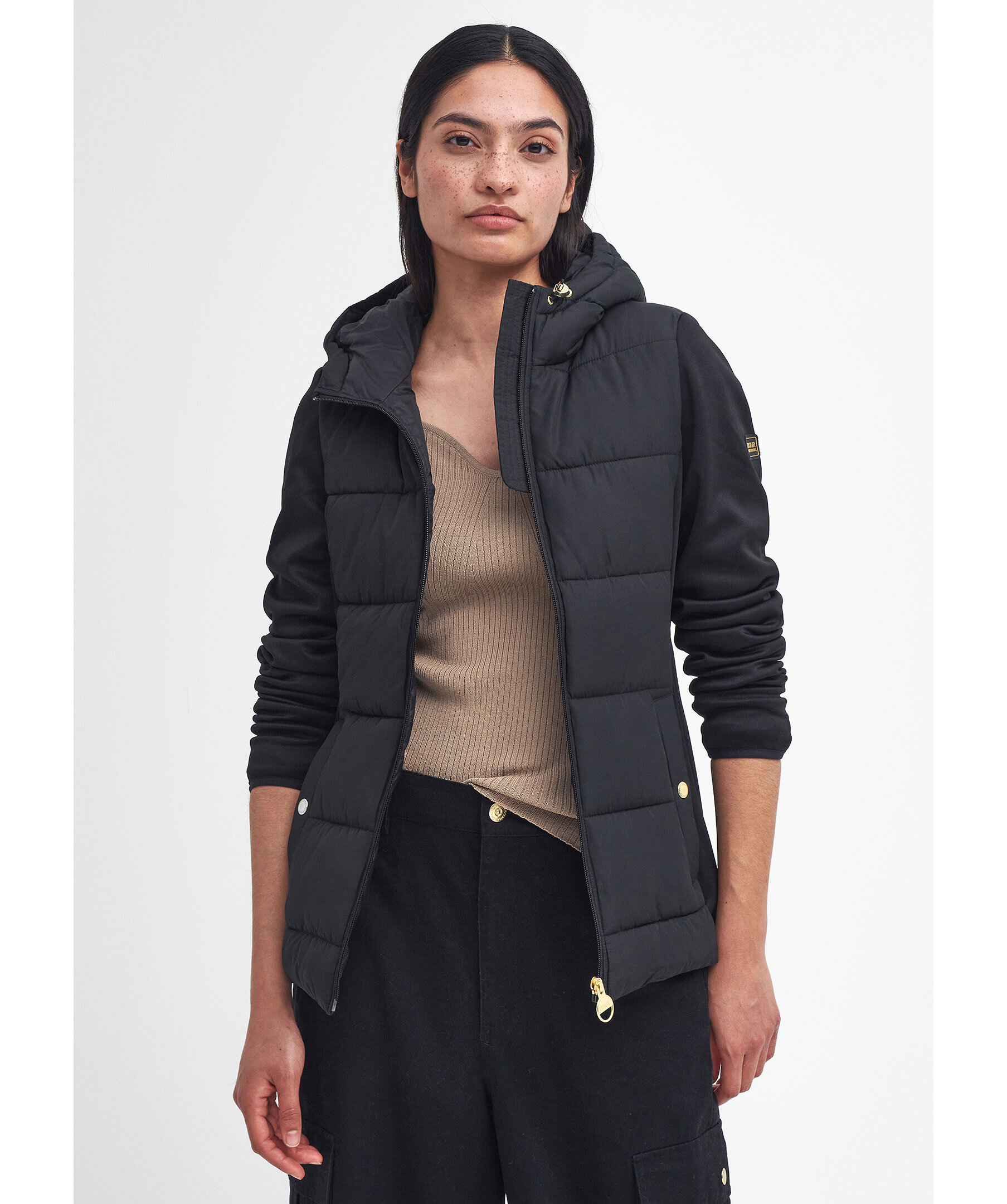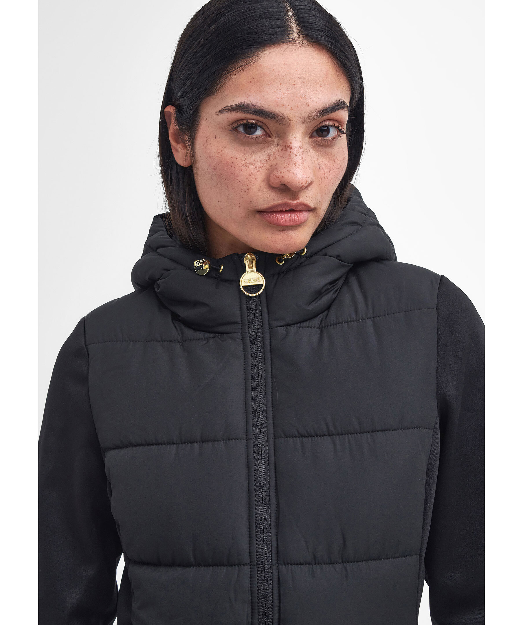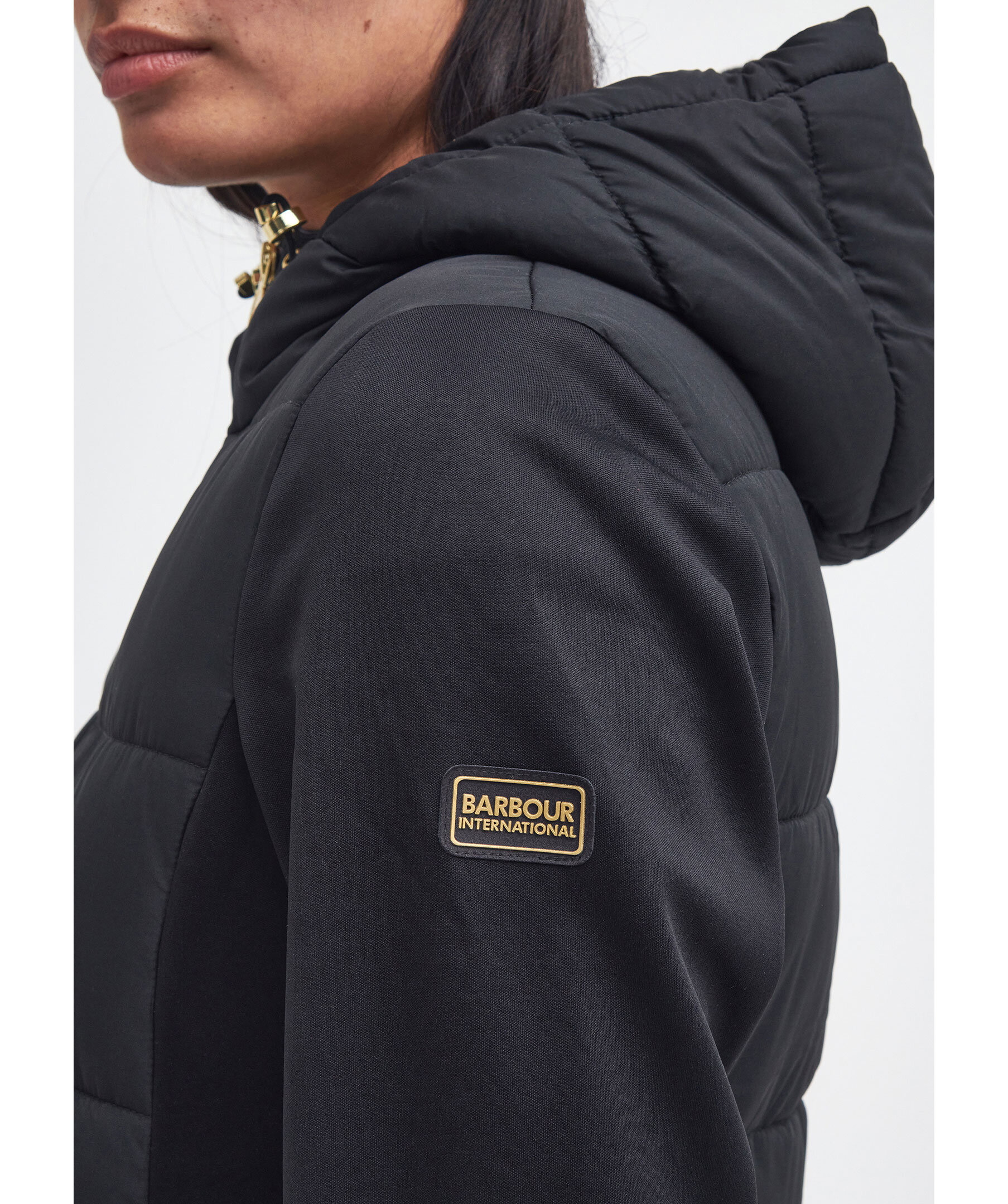 Svart, quiltad hybridjacka från Barbour. Jackan stängs med dragkedja och har huva med dragsko, två sidfickor med tryckknapp och logotyp i gummi på vänster ärm. Tillverkad i en polyesterblandning.