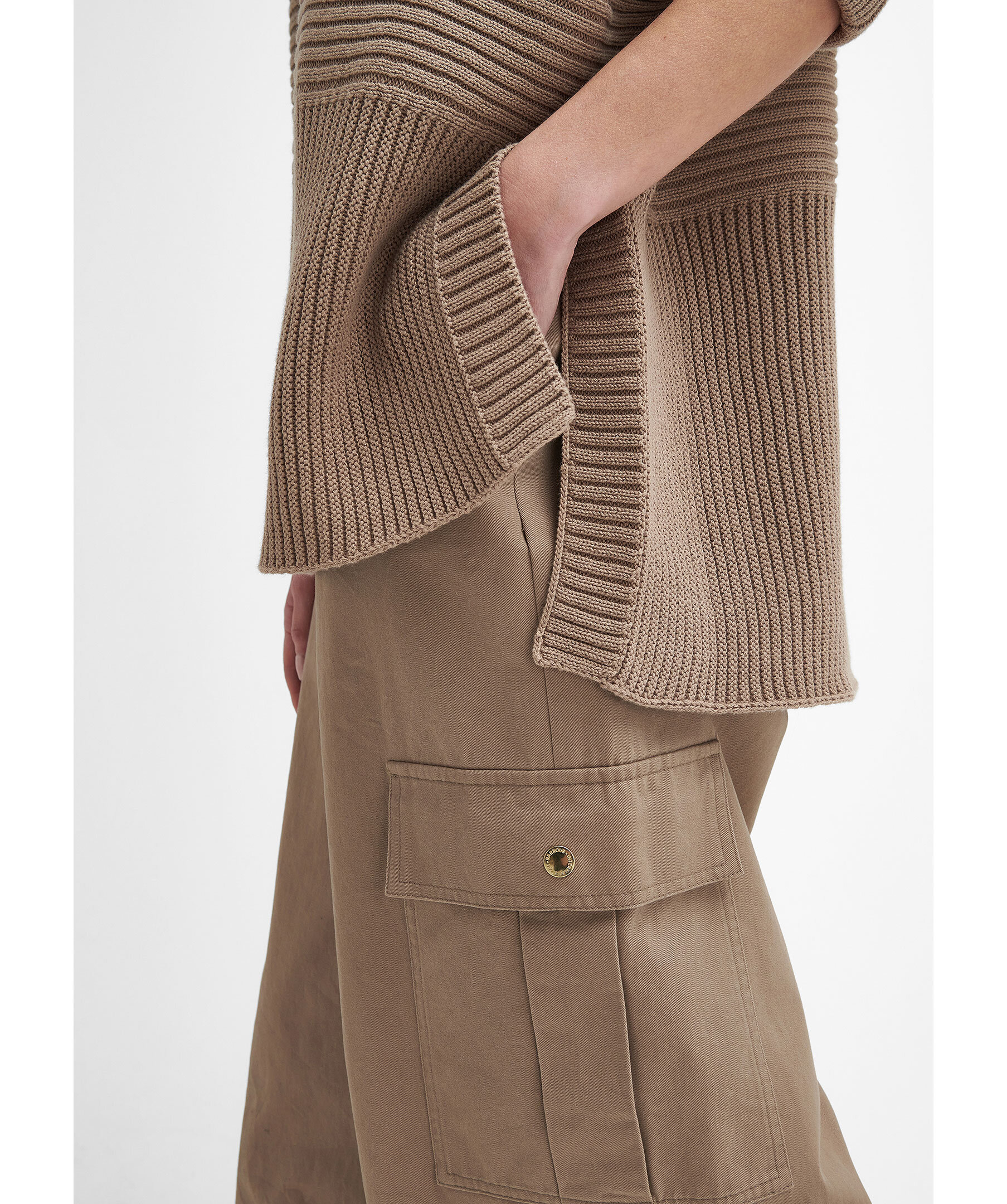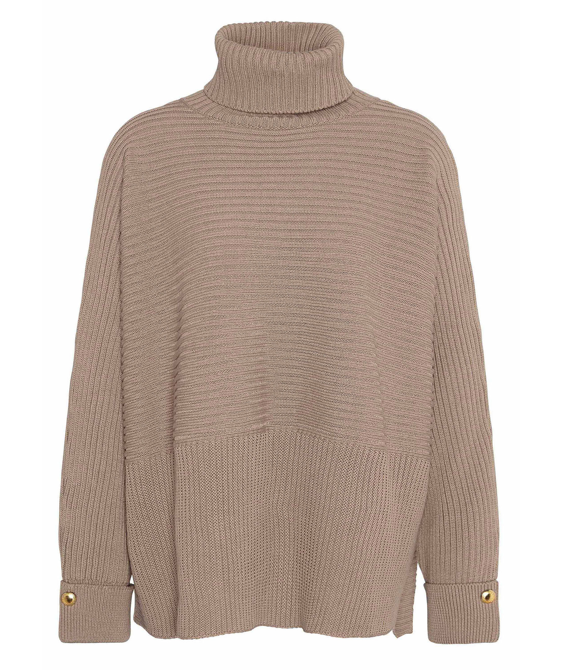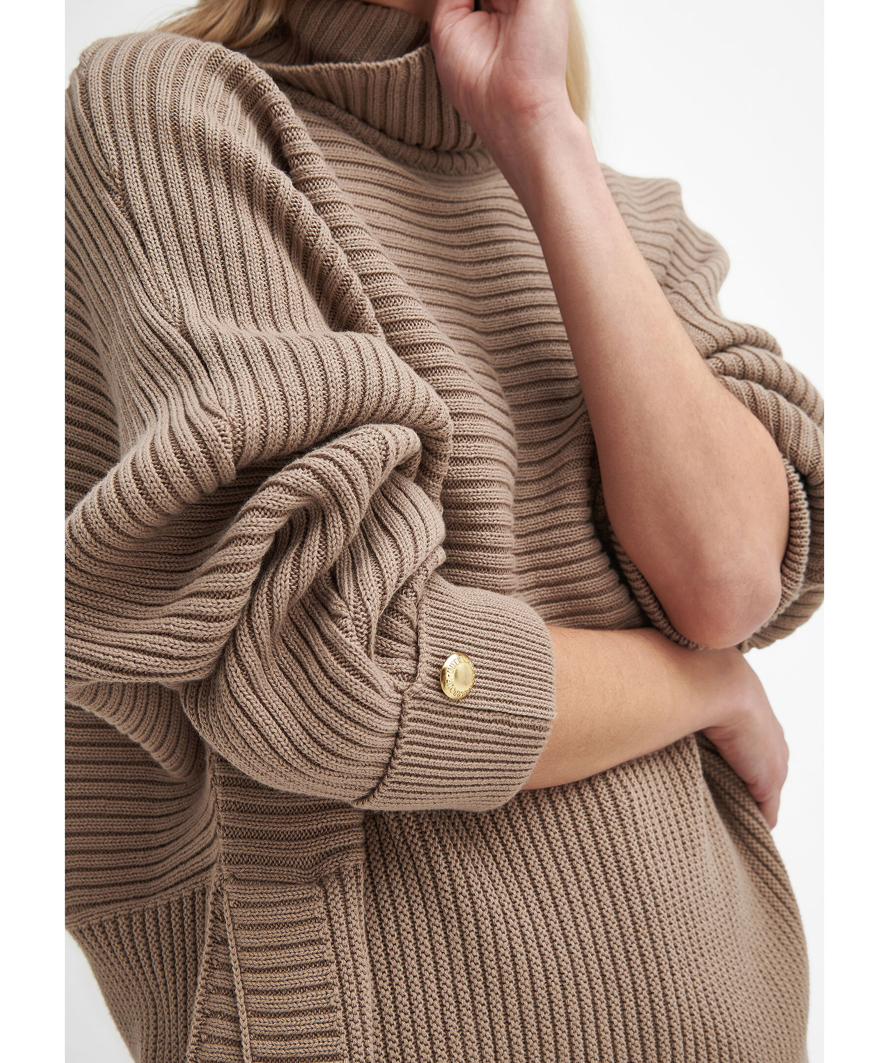 Mörkbeige, ribbstickad polotröja från Barbour. Tröjan har en bred avslappnad passform, slitsar i sidorna och Barbour International-märkta knappar på manschetterna. Tillverkad i bomull.