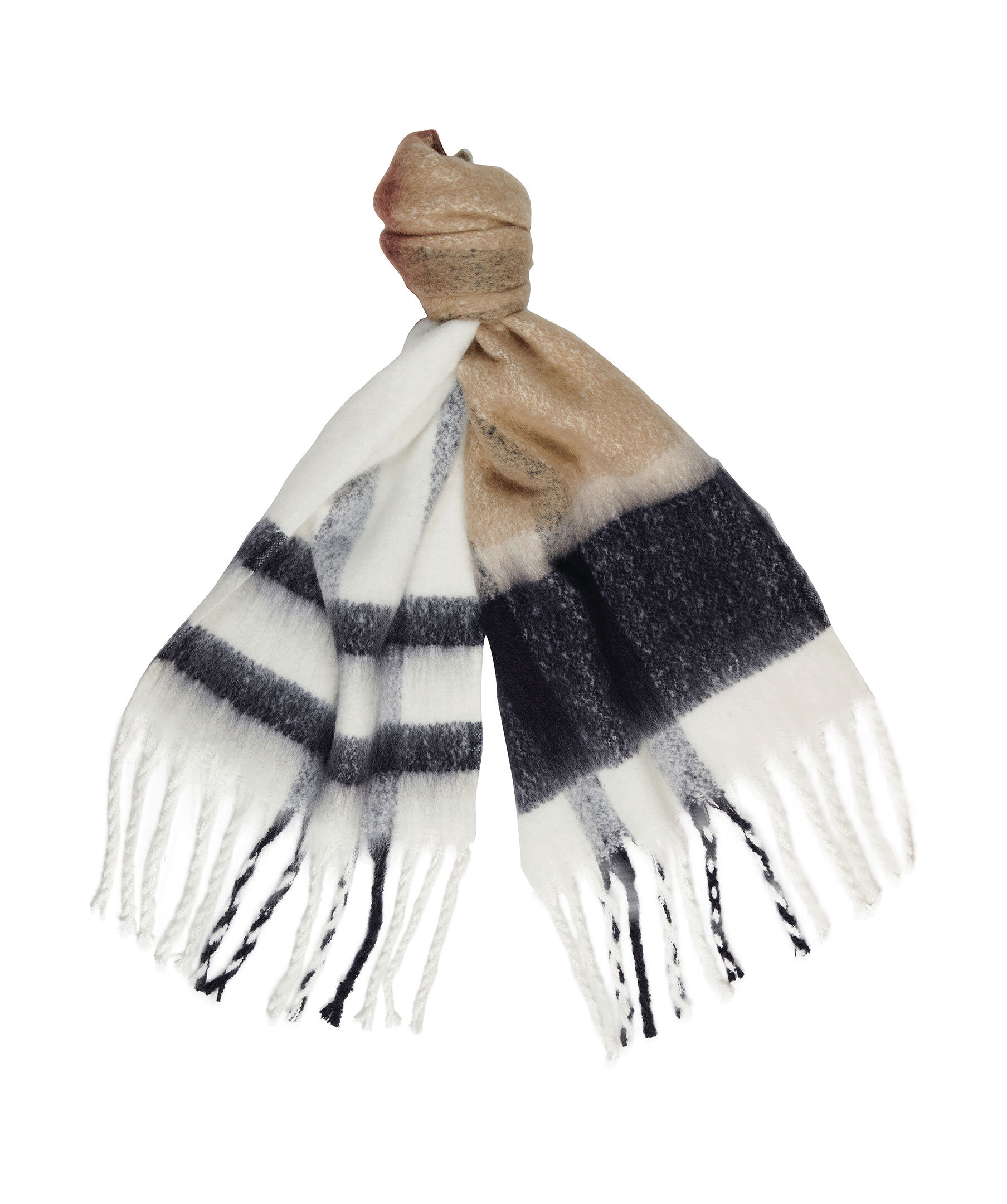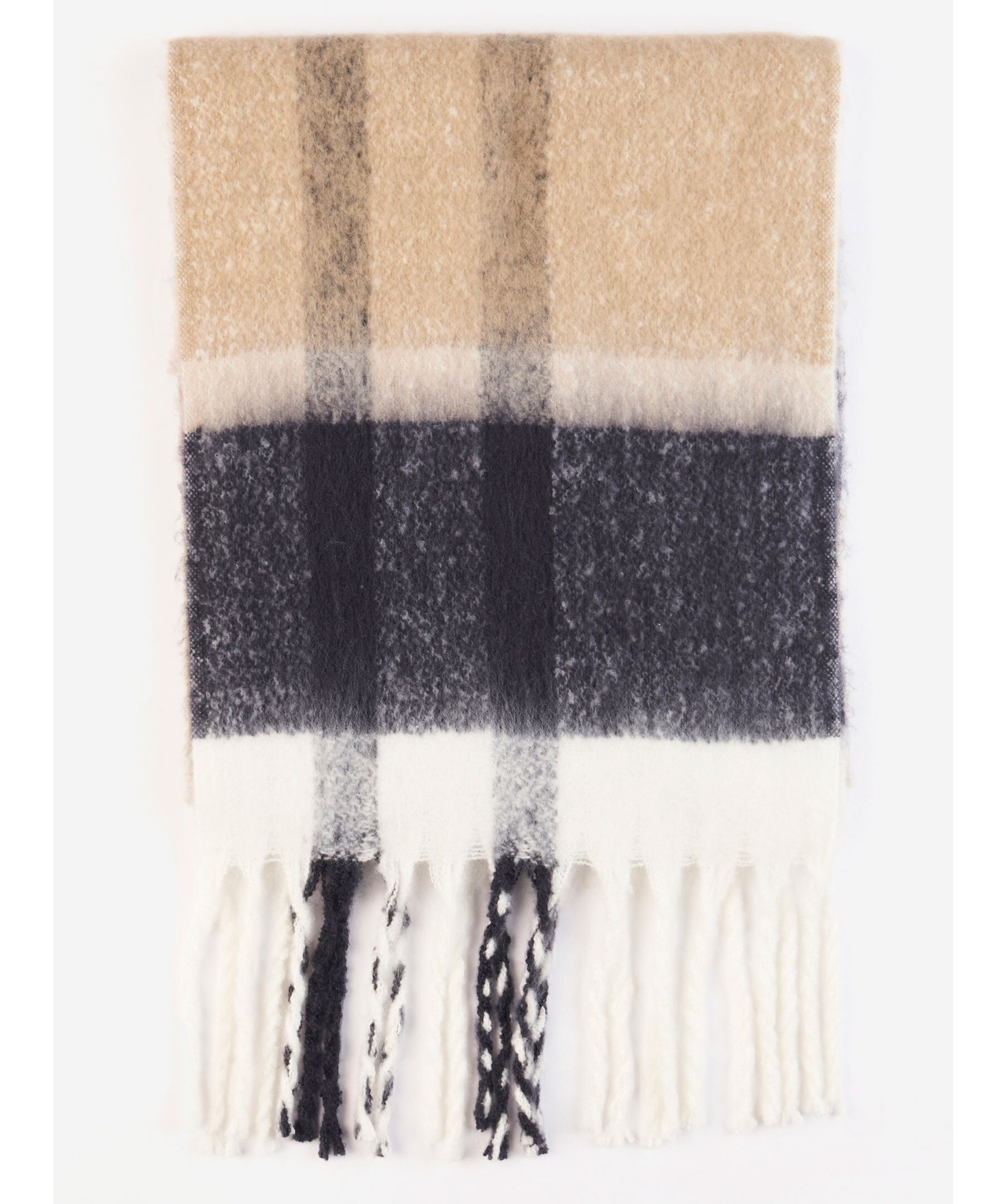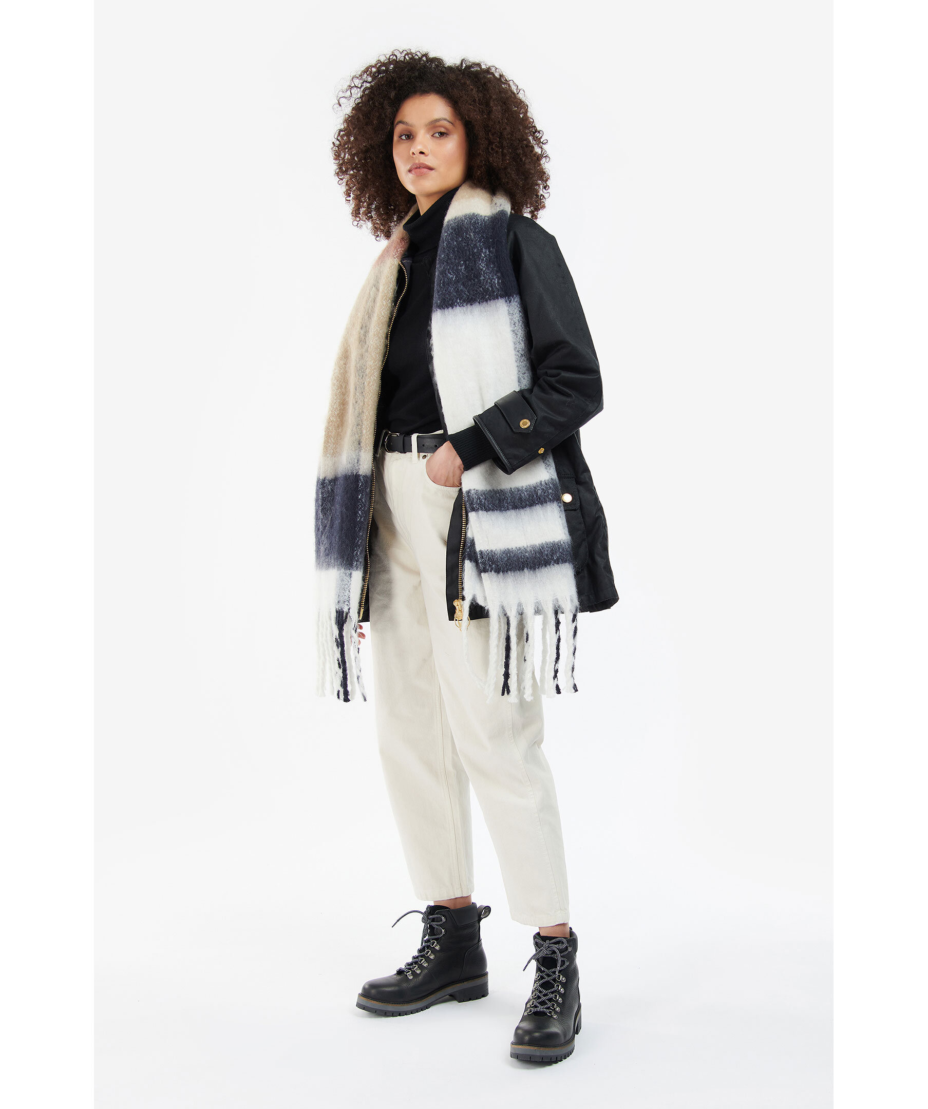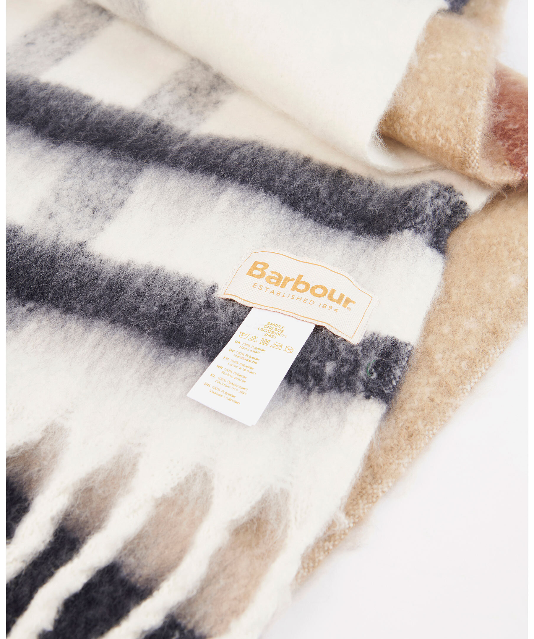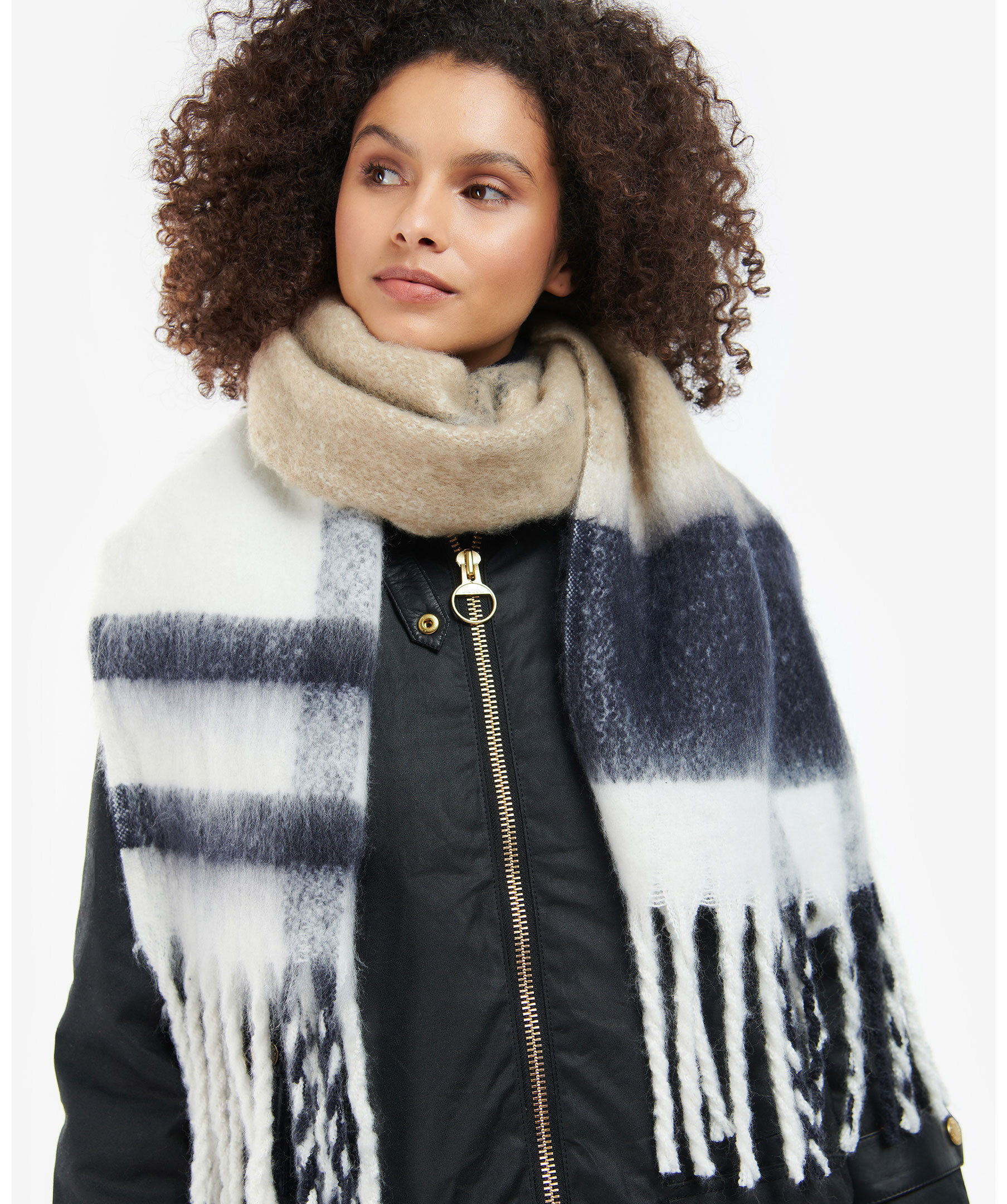 Stickad, rutig halsduk från Barbour. Vit, mörkblå, beige rutig i storskalig modell med fransade ändar. Halsdukens mått är 180cm x 38cm