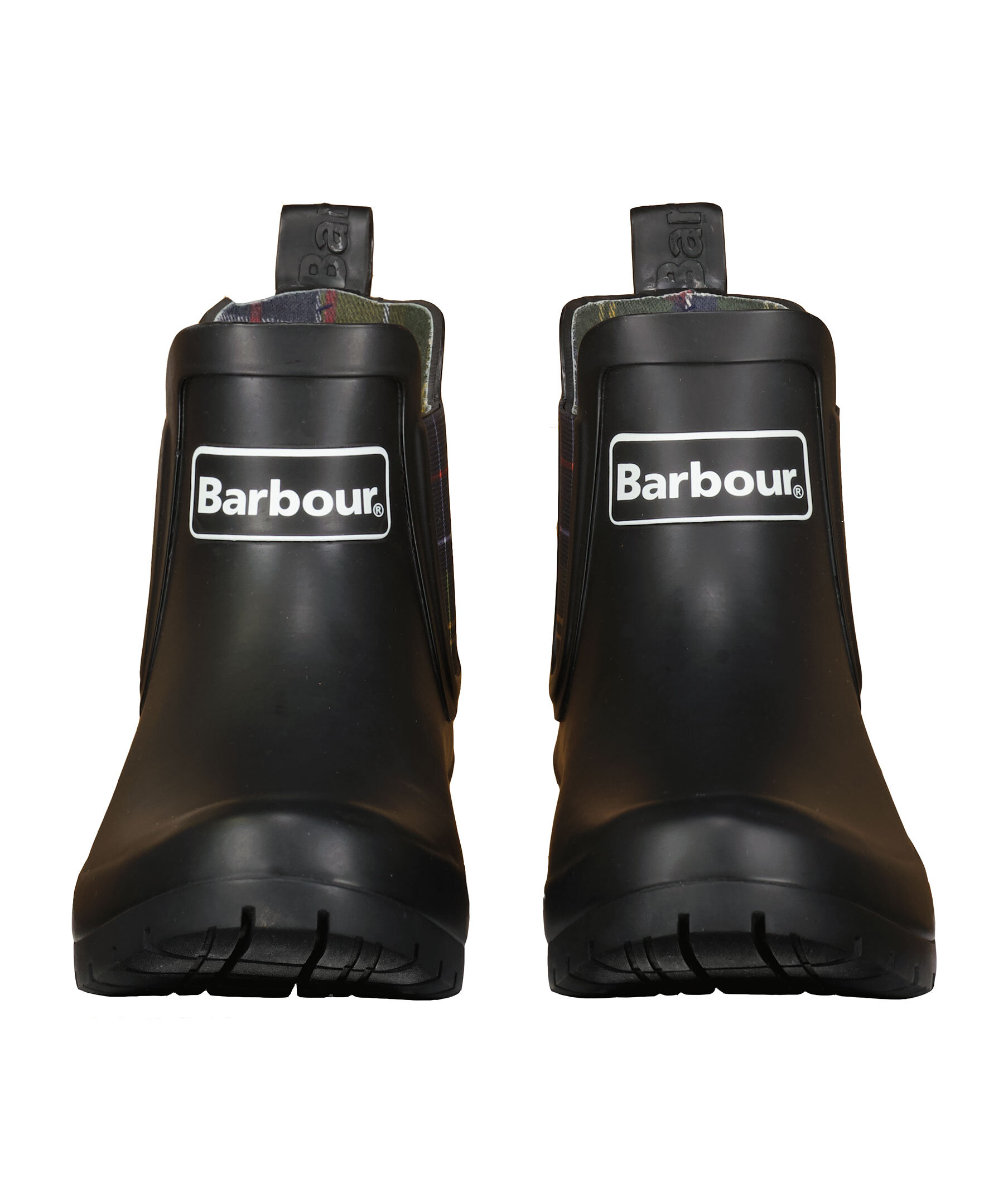 Svarta gummistövlar från Barbour. Insida och stretchigt material vid sidan i tartan mönster. Stor logotyp i vitt framtill samt diskret logotyp bak vid hälen.