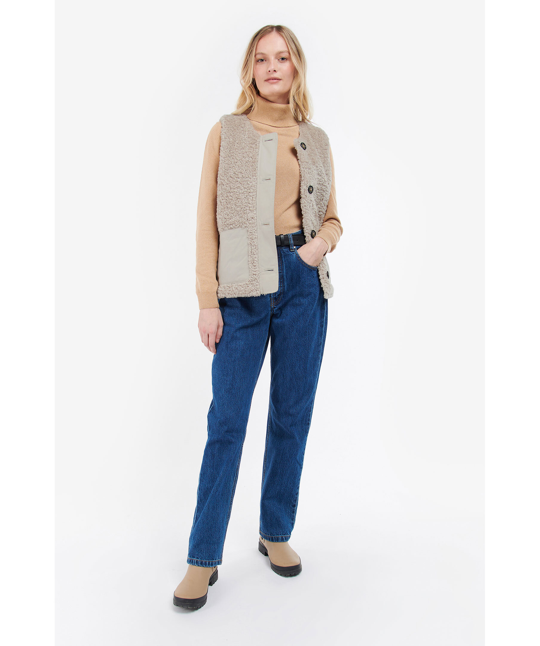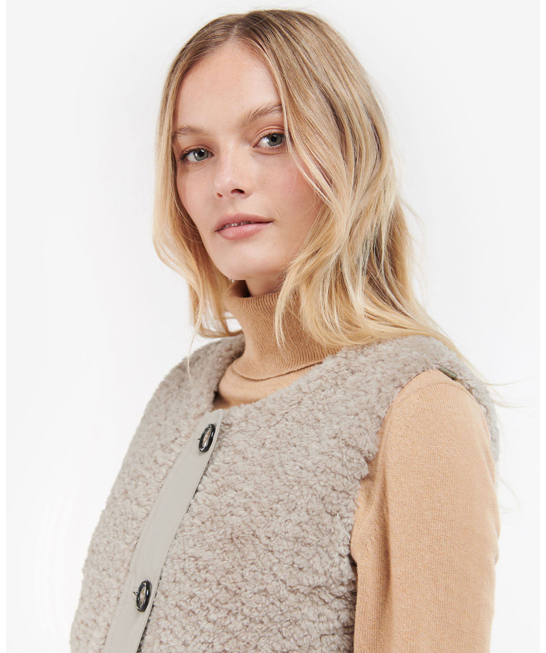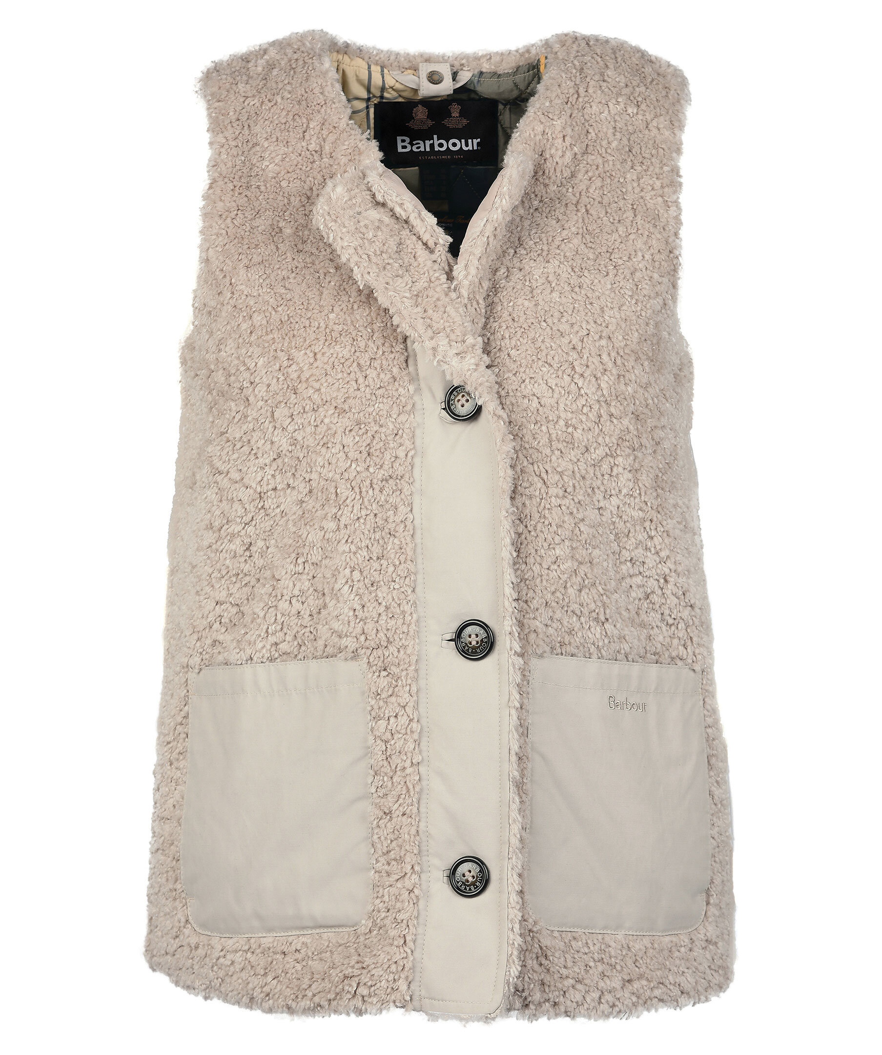 Beige väst i pile material från Barbour. Stängs framtill med knappar. Rundad halsringning. Två fickor framtill. broderad logotyp på vänster ficka.