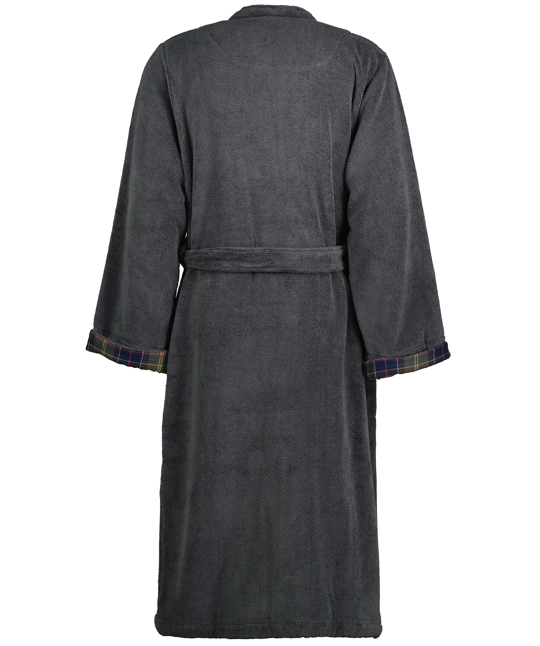 Mörkgrå morgonrock från Barbour. Tillverkad i 100% bomull. Rutigt foder som kan vikas upp i ärmslut som en fin detalj. Barbour- och sköldbroderi på vänster sida av bröstet. Öppna fickor i sidorna och bälte i öglor i midjan.