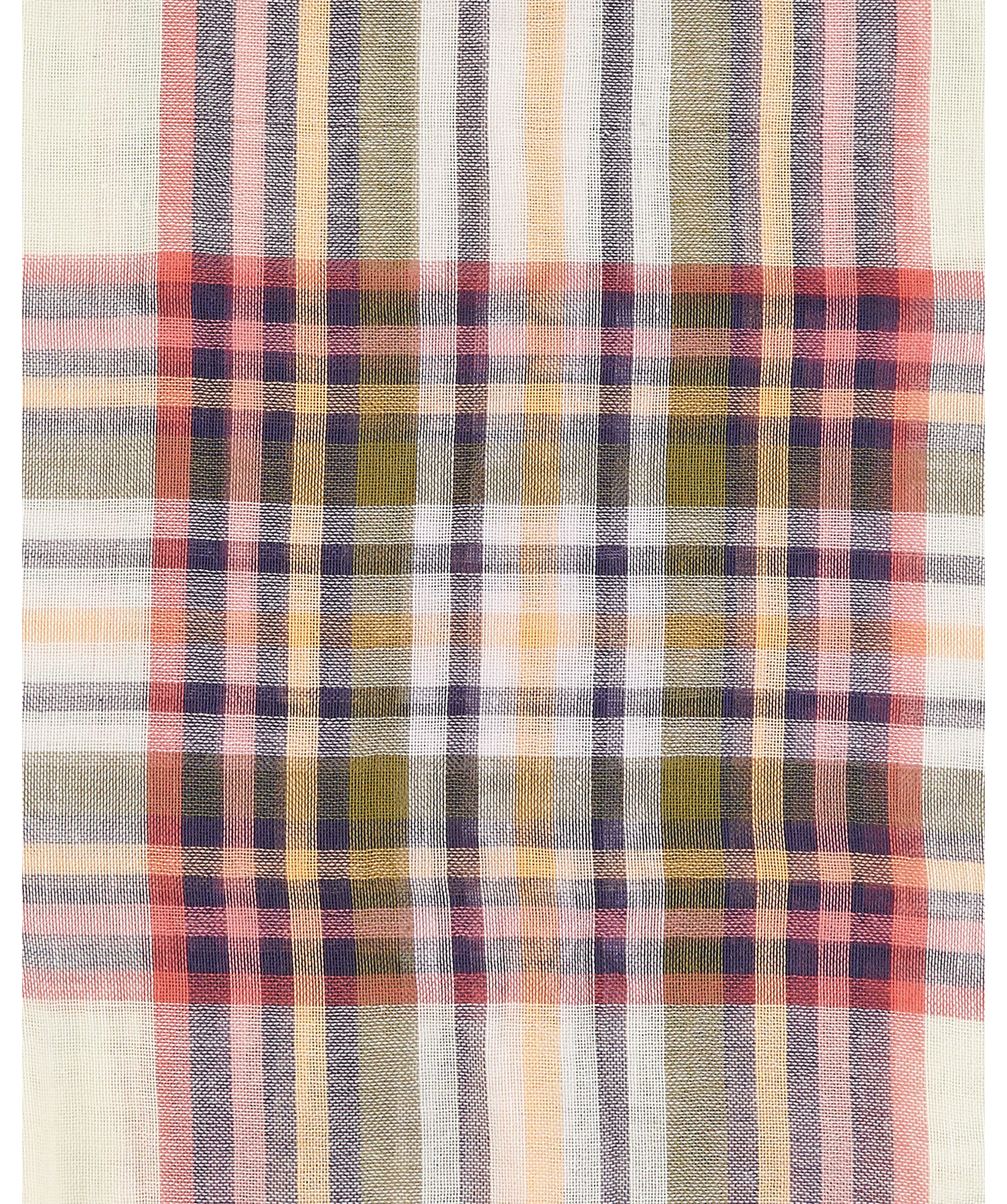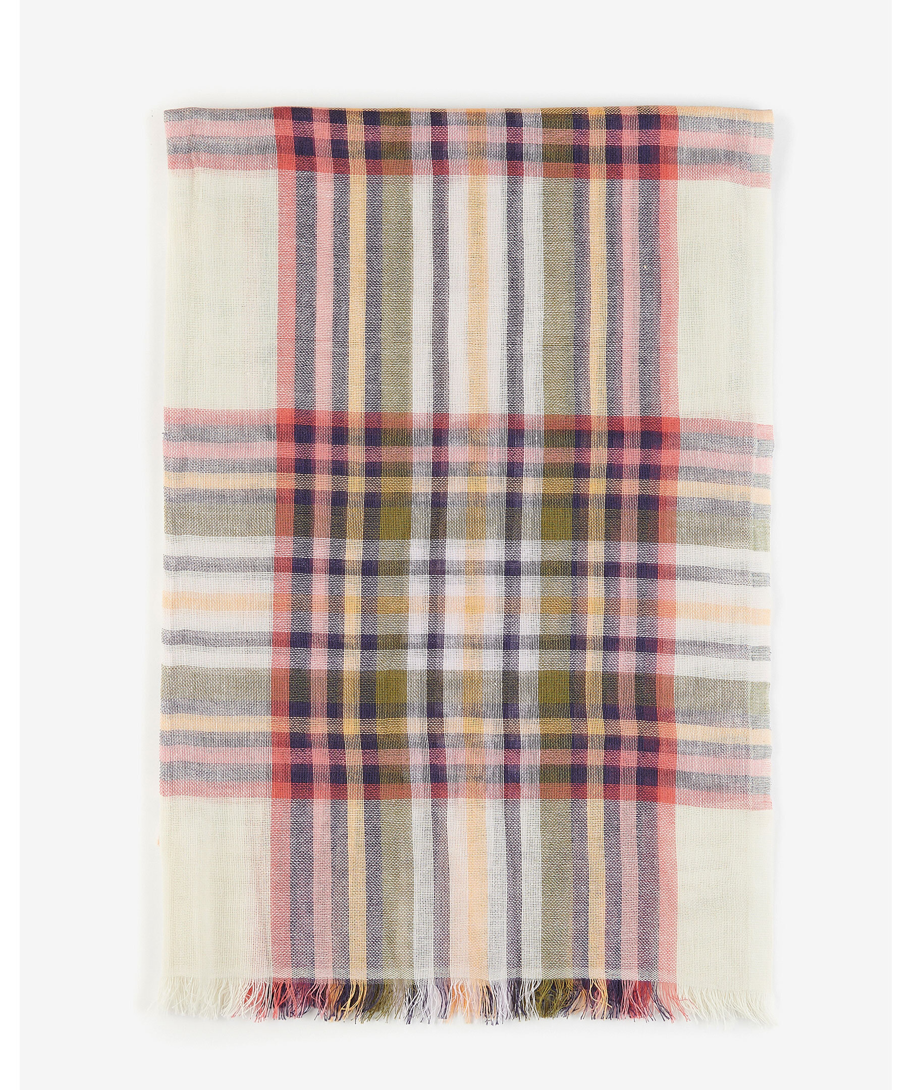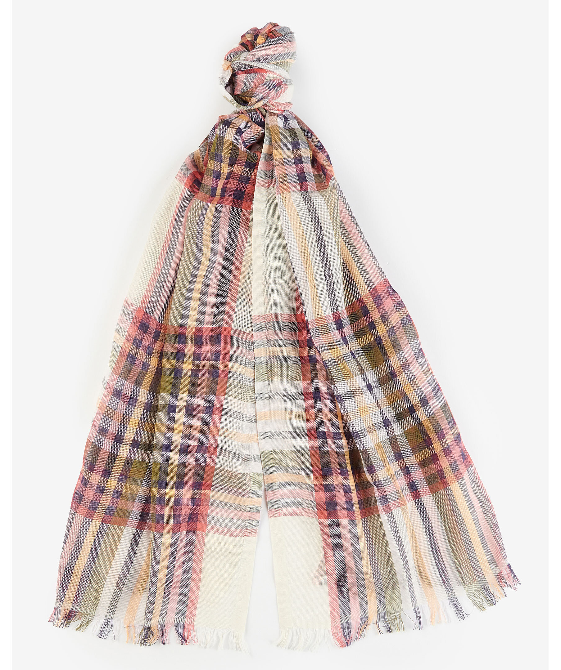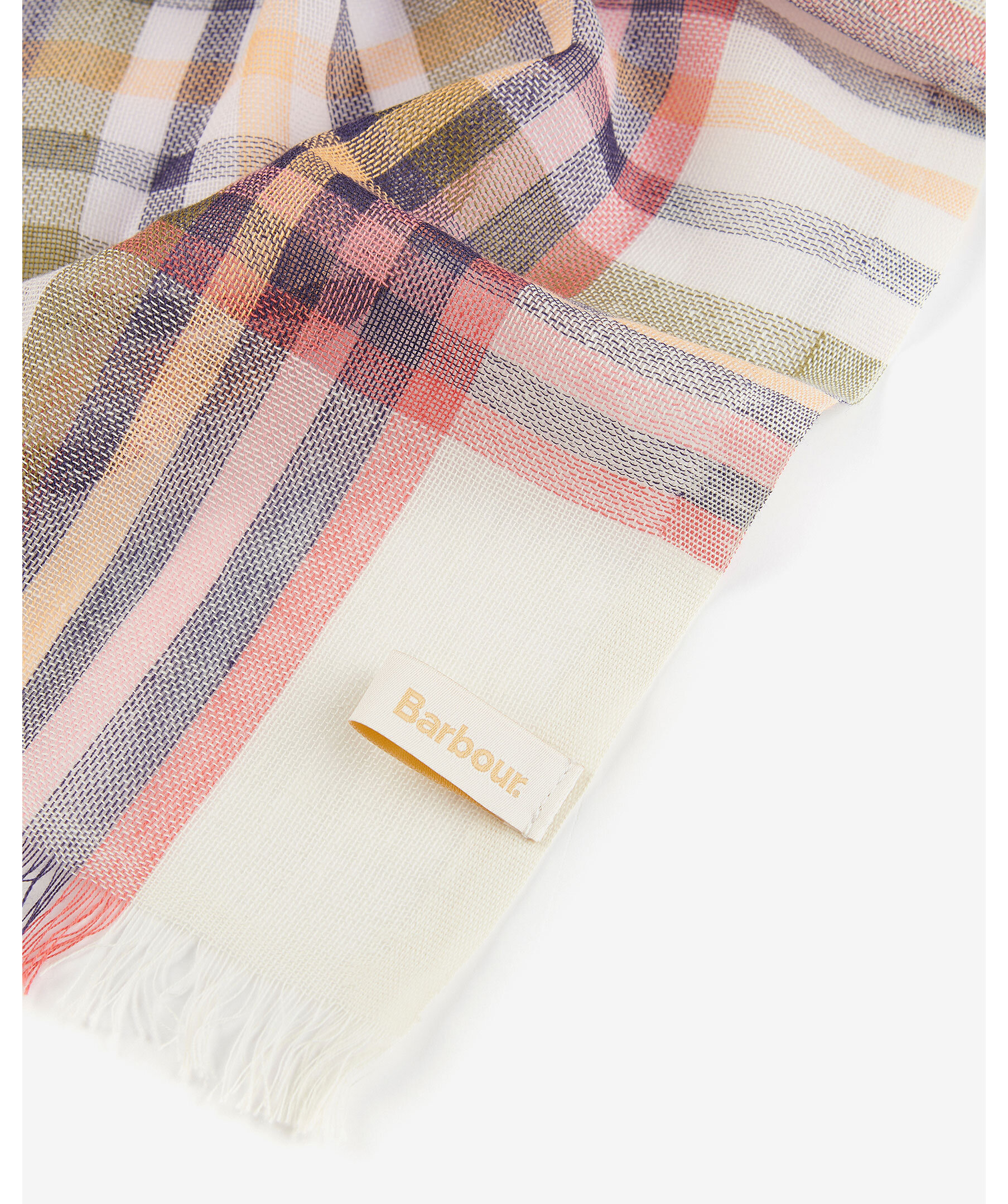 Rutig scarf i en lätt blandning av bomull och linne från Barbour. Ett rutigt mönster i vit, grönt, rosa, marinblått och orange med en fransfåll. Vävd etikett med logotyp på sidan och har måtten: 185 cm x 65 cm.
