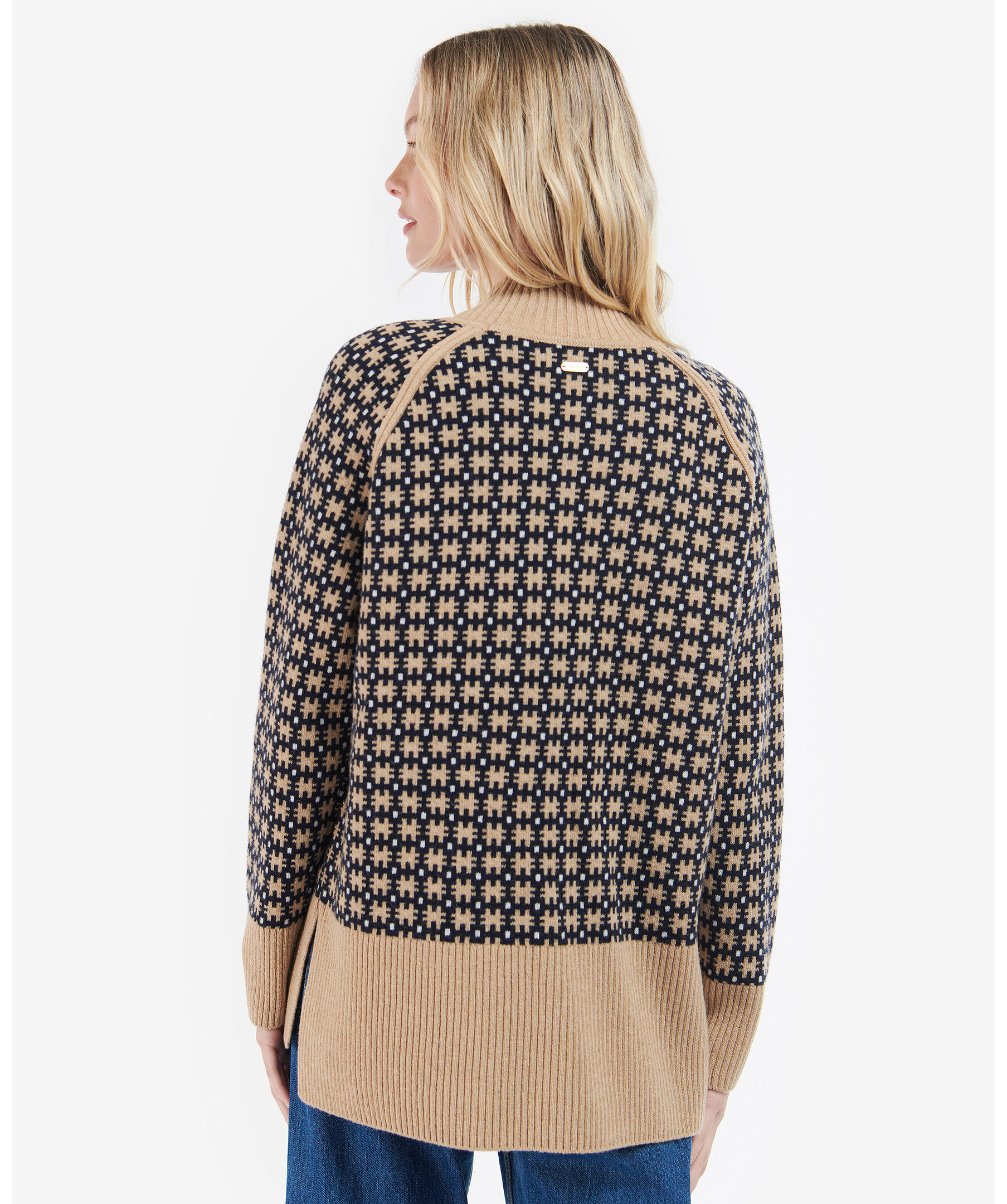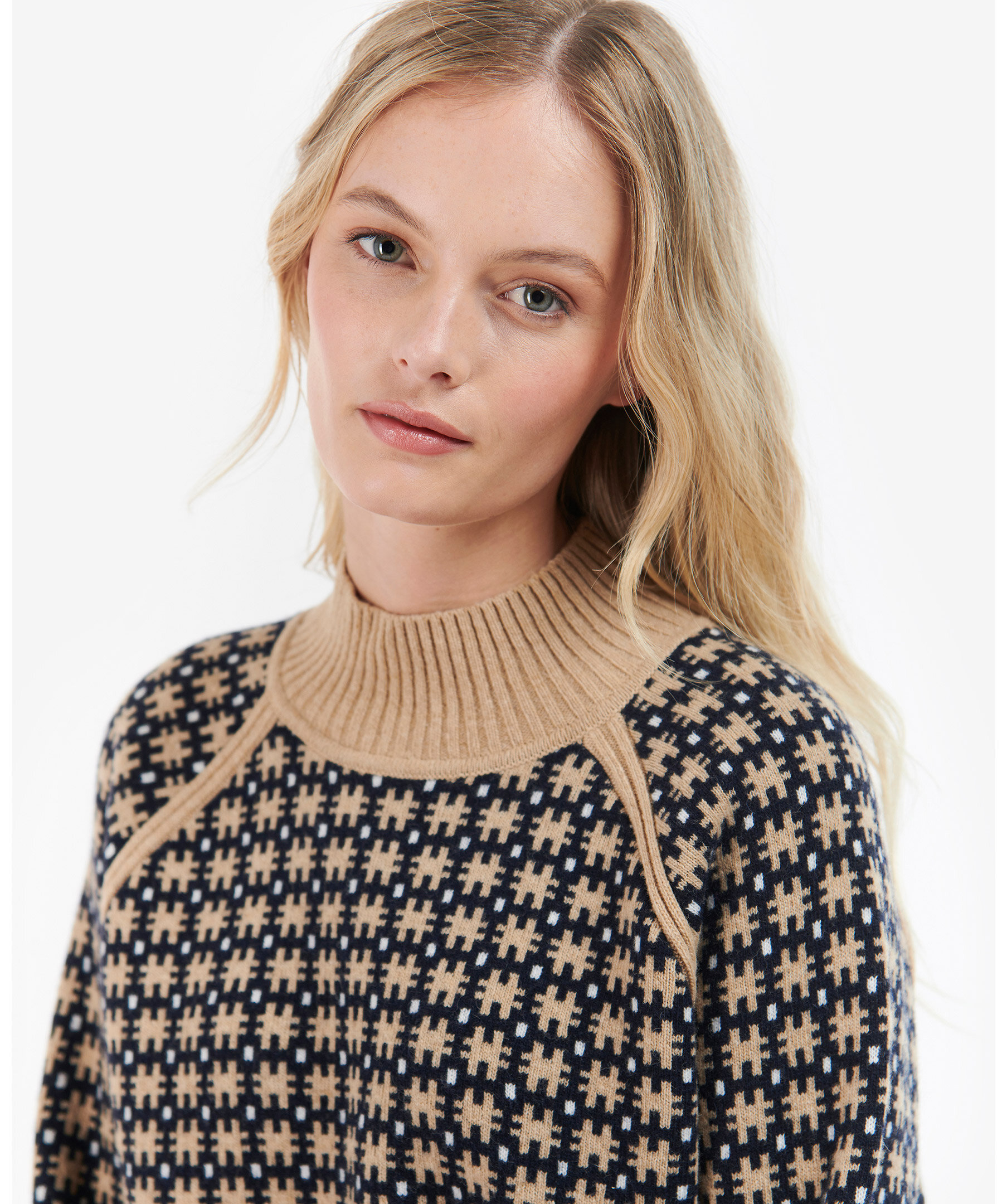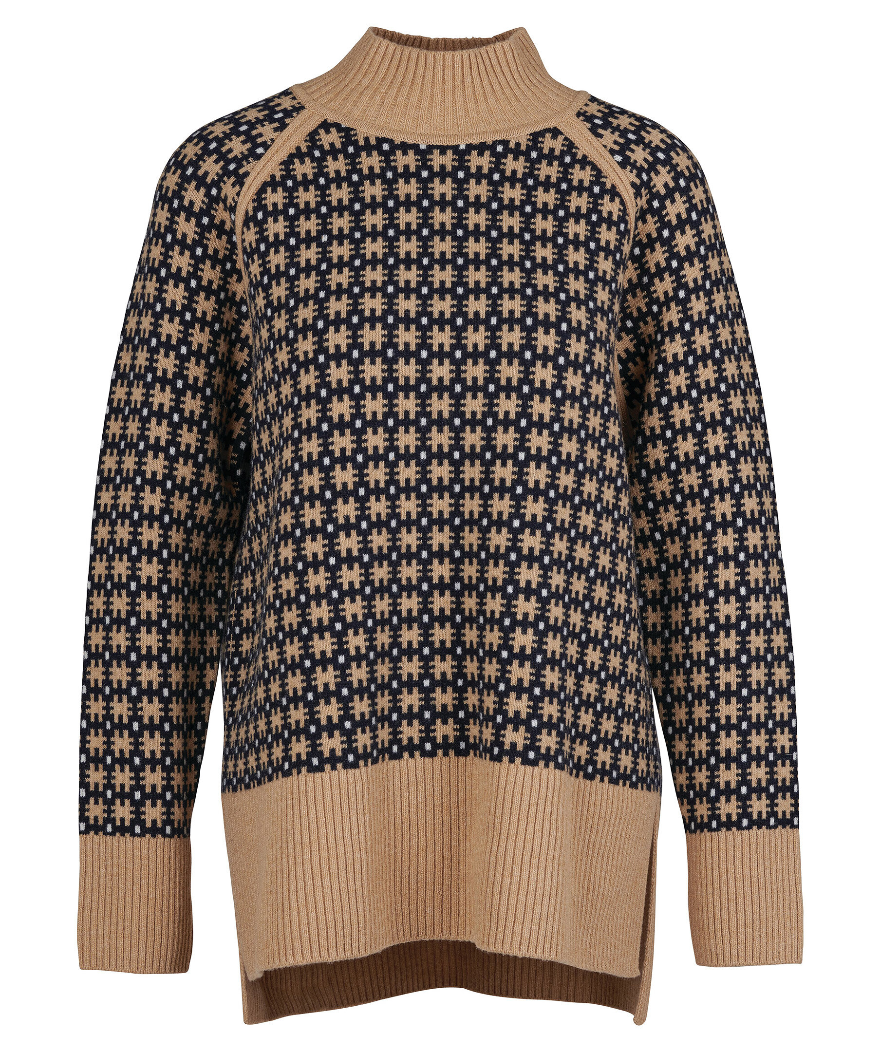 Mönstrad, stickad tröja i ullblandning från Barbour. Geometriskt jacquard mönster, kontrasterande detaljer, en tratthals och sidoslitsar. Mönster i beige, svart och vitt.
