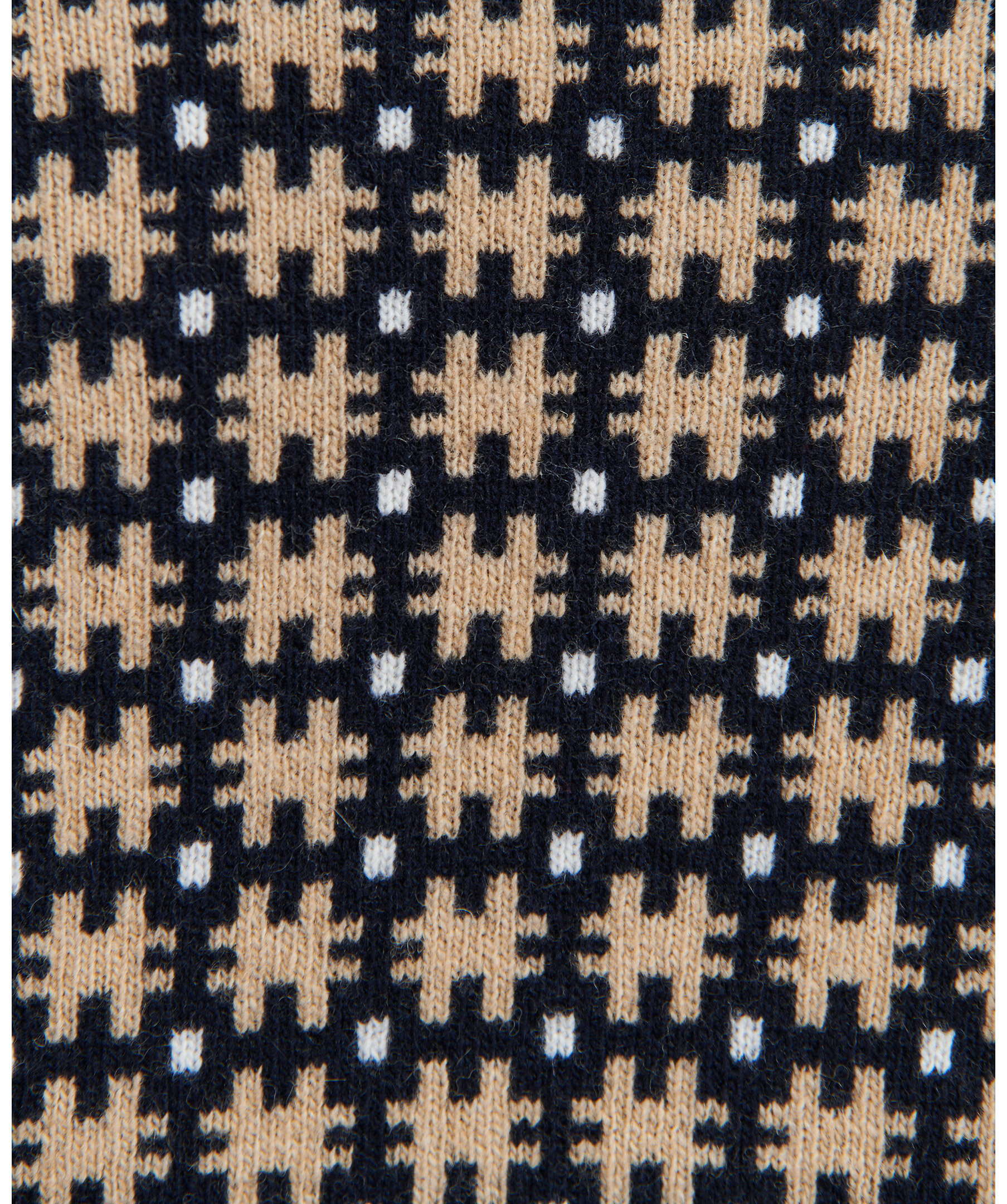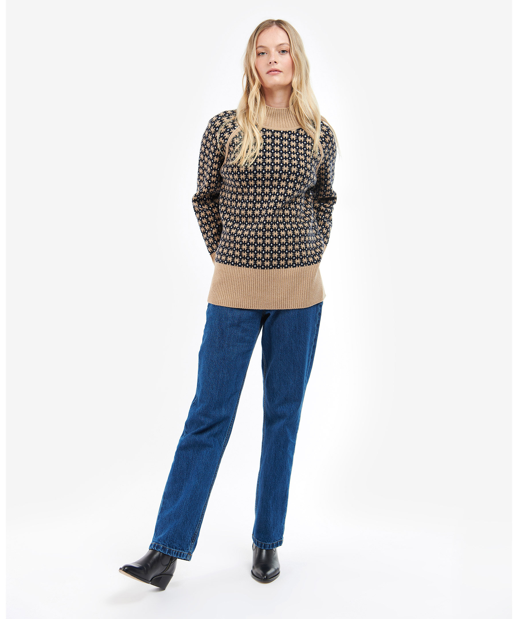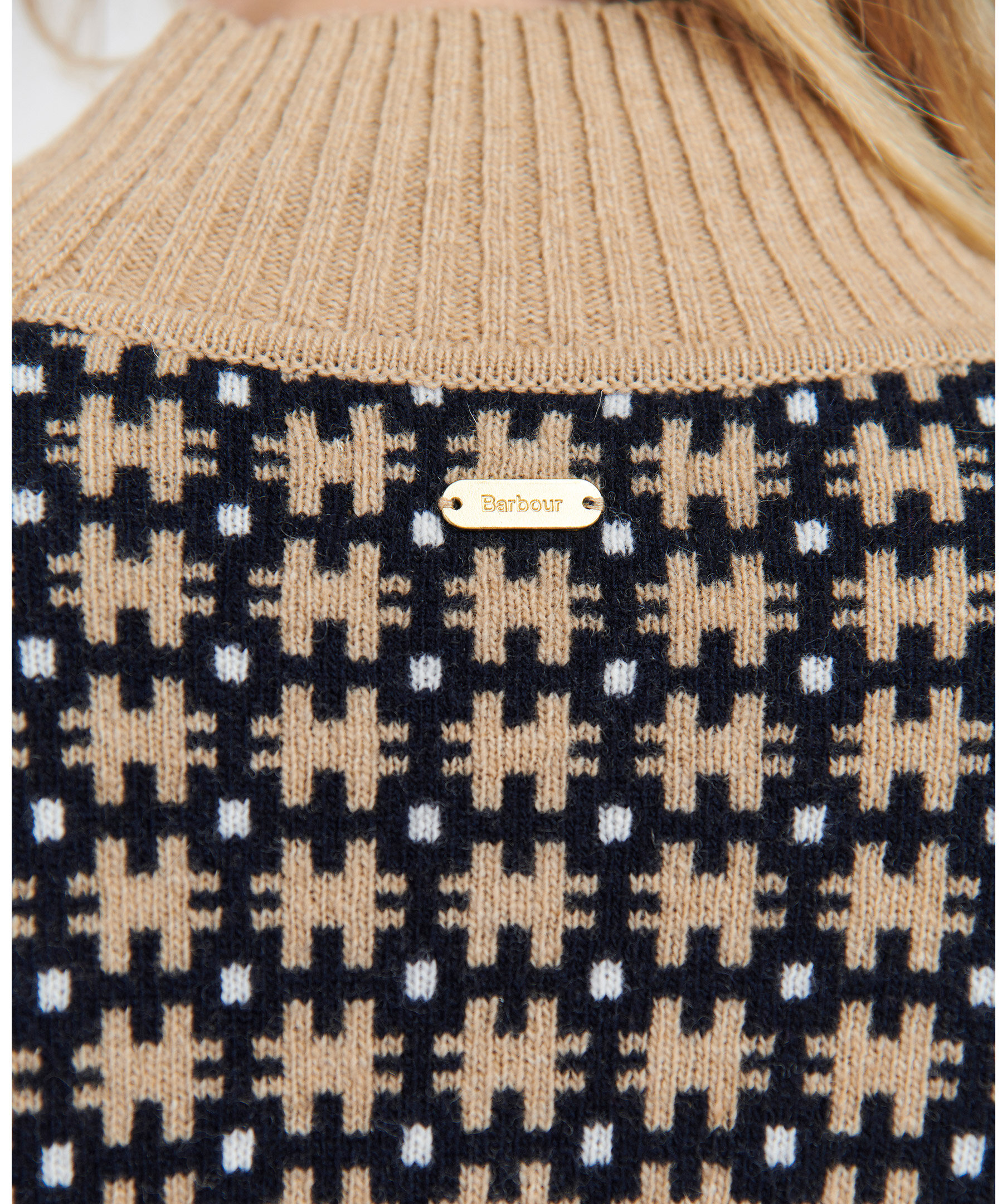 Mönstrad, stickad tröja i ullblandning från Barbour. Geometriskt jacquard mönster, kontrasterande detaljer, en tratthals och sidoslitsar. Mönster i beige, svart och vitt.