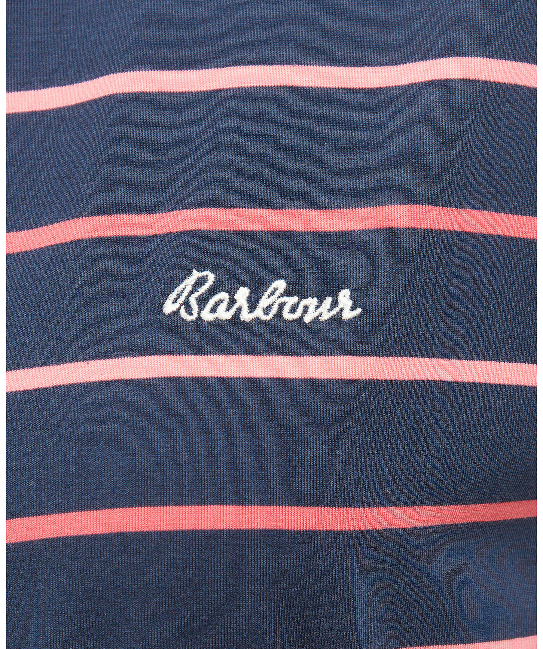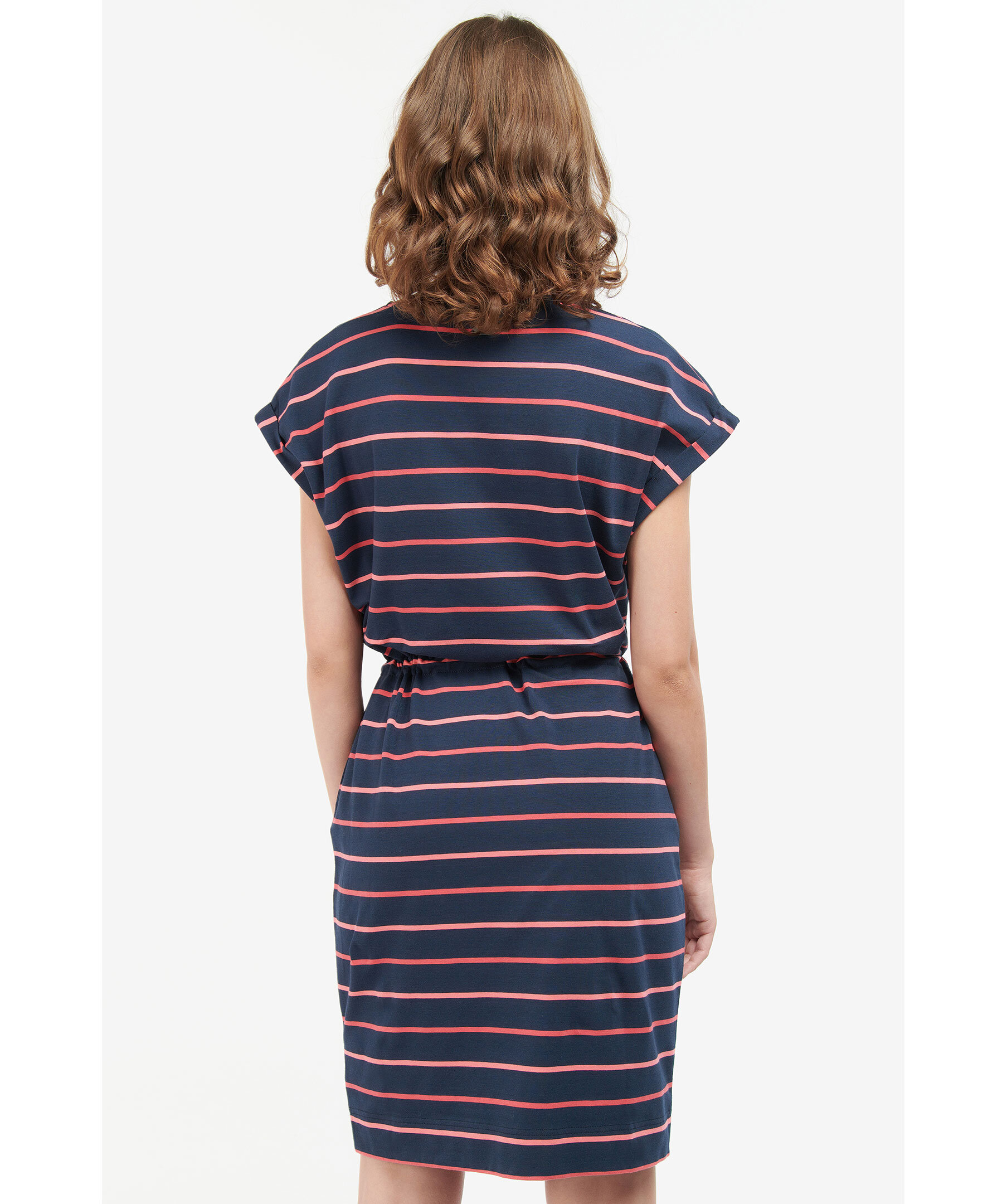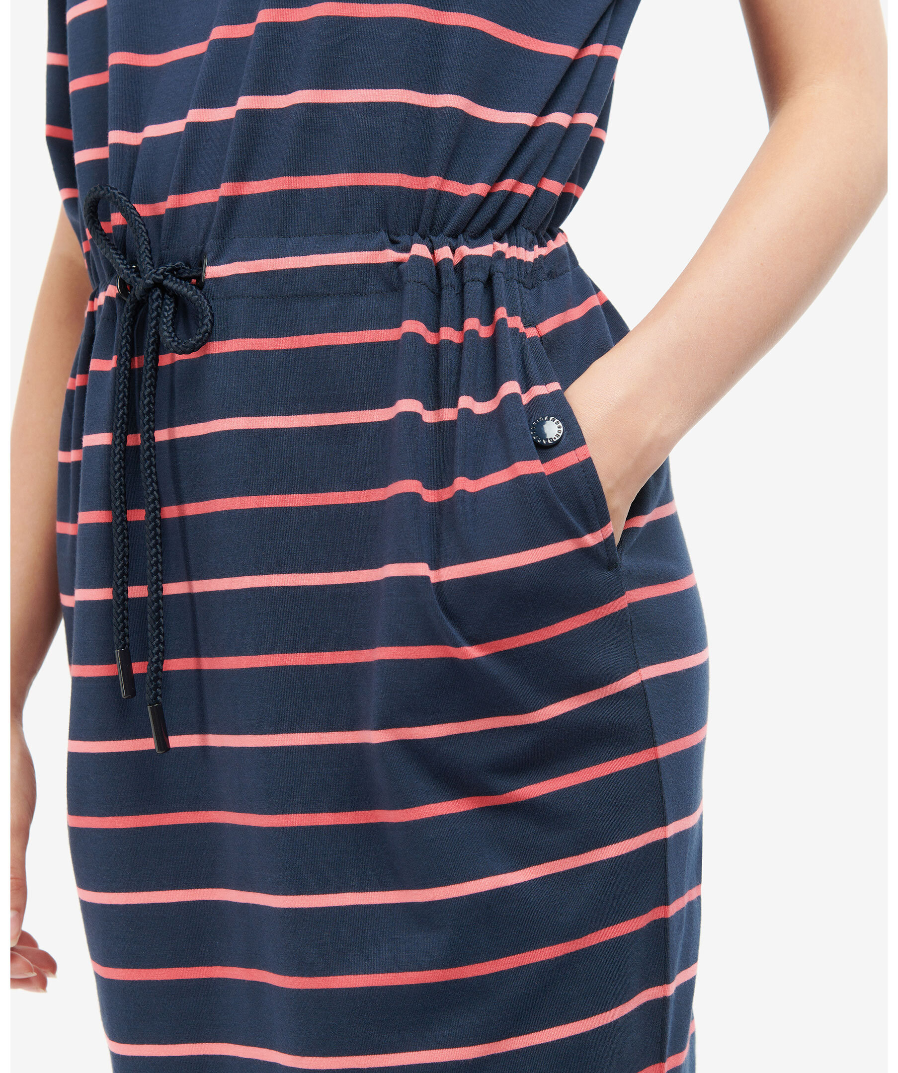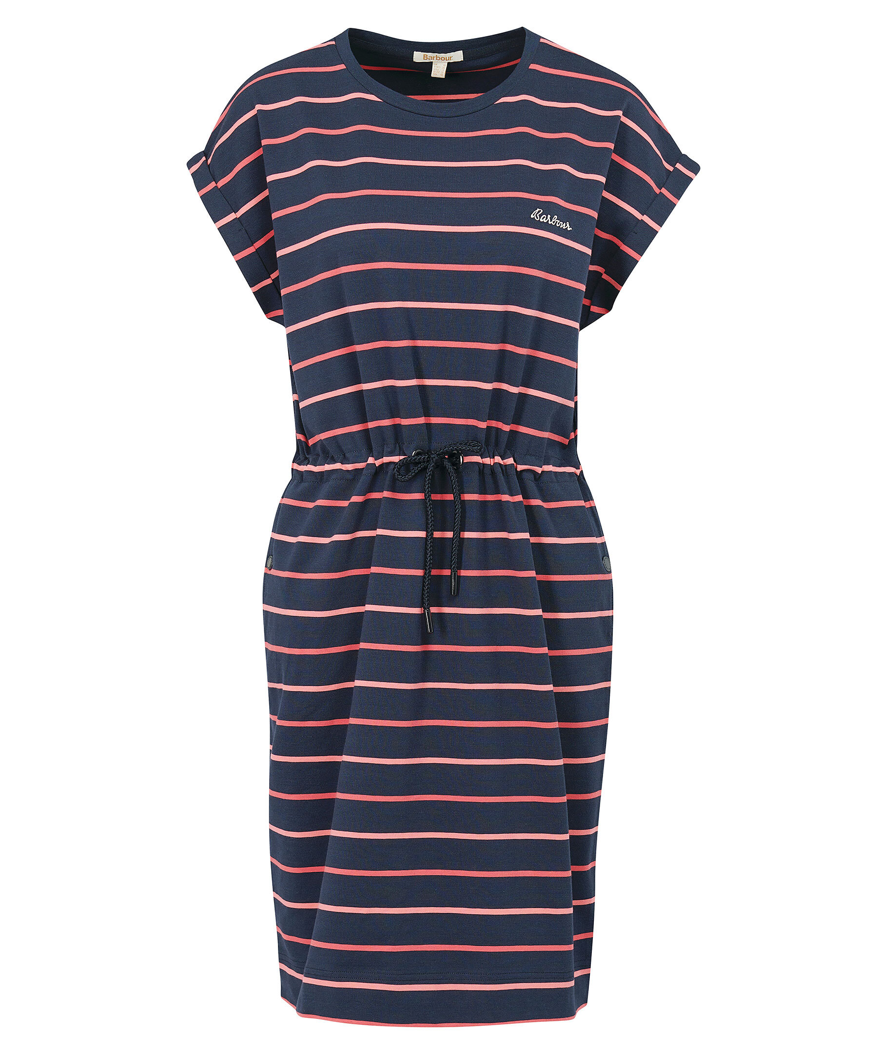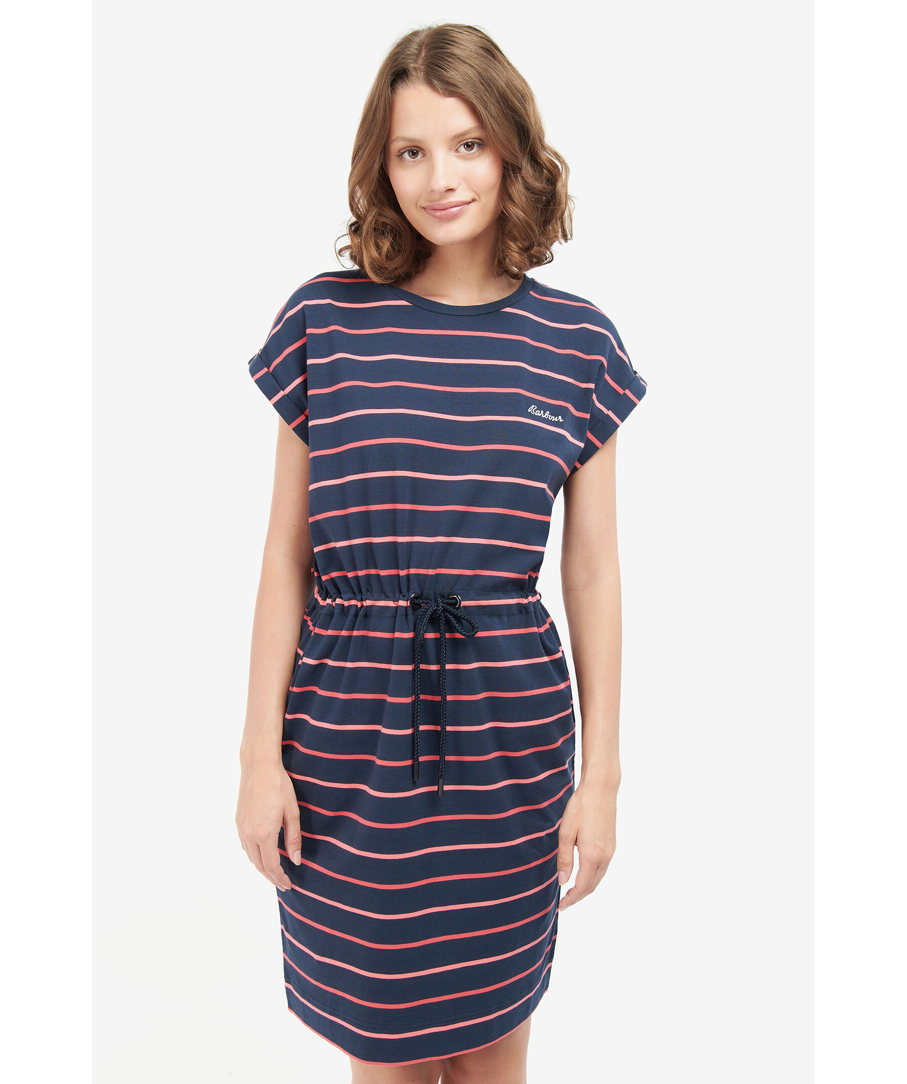 Marinblå klänning med mörkrosa ränder från Barbour. Tillverkad i en mjuk bomullsjersey med extra stretch för komfort. Detaljerad med upprullade holkärmar och en ribbad rund halsringning för en avslappnad look. Har en dragsko i midjan för en smickrande siluett och en fin, broderad Barbour-logotyp på bröstet och en liten bricka i metall med graverad logotyp i nacken. Fickor i sidorna som stängs med tryckknapp.