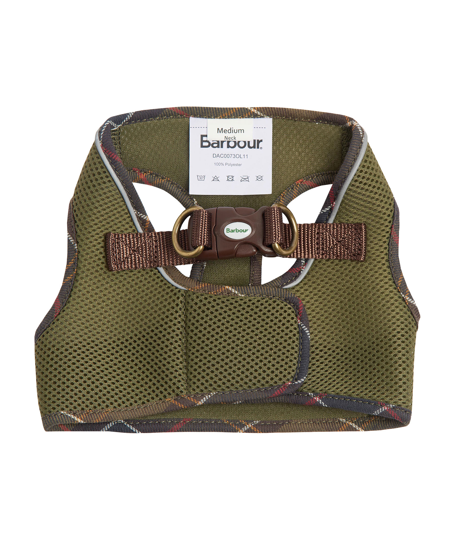 Mossgrön hundsele i meshtyg från Barbour. Barbour-tartan mönster i kanterna och stängs med en brun klämma och kardborreband upptill samt har två öglor att fästa sitt koppel i. Brun patch med logotyp vid halsen.