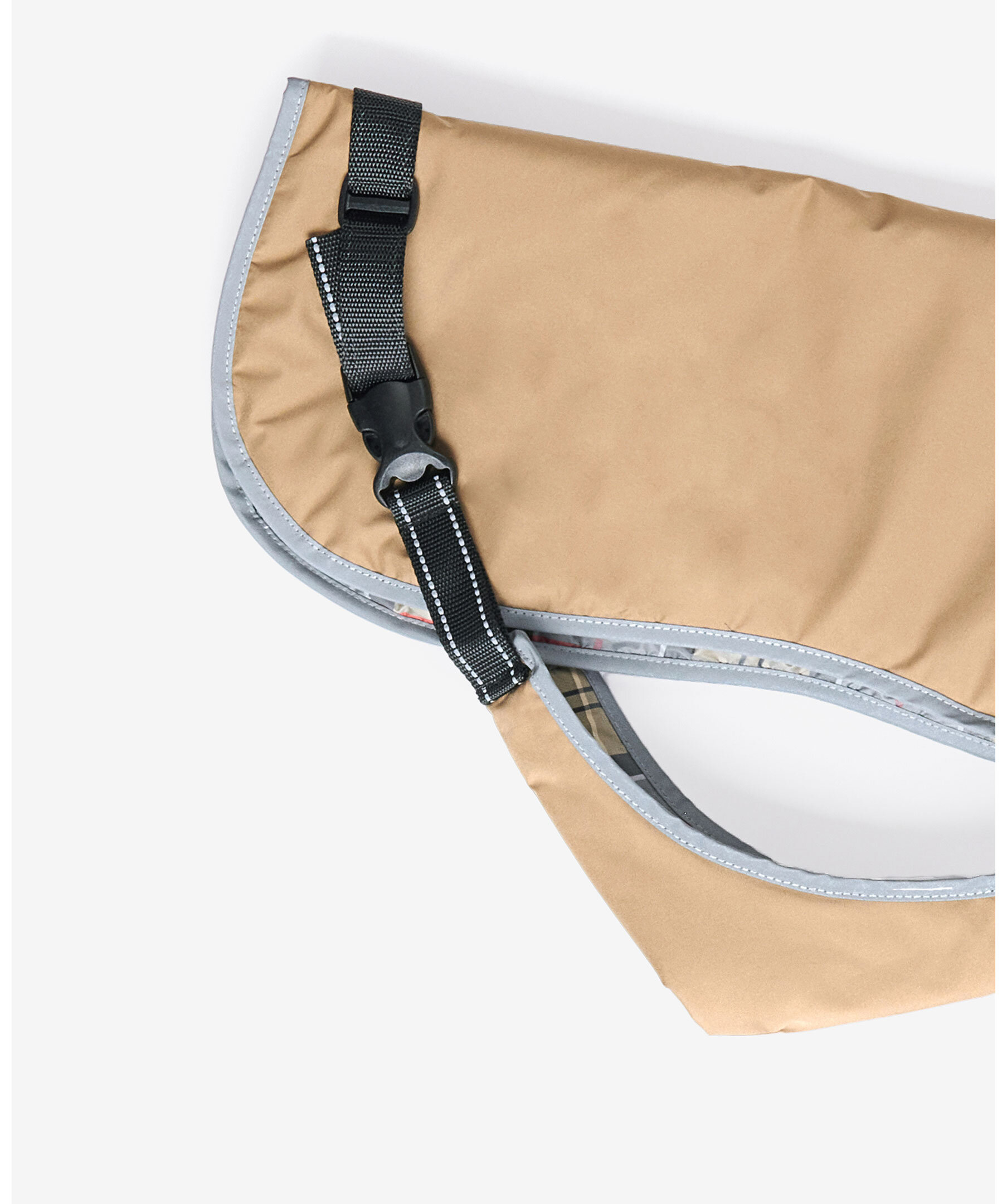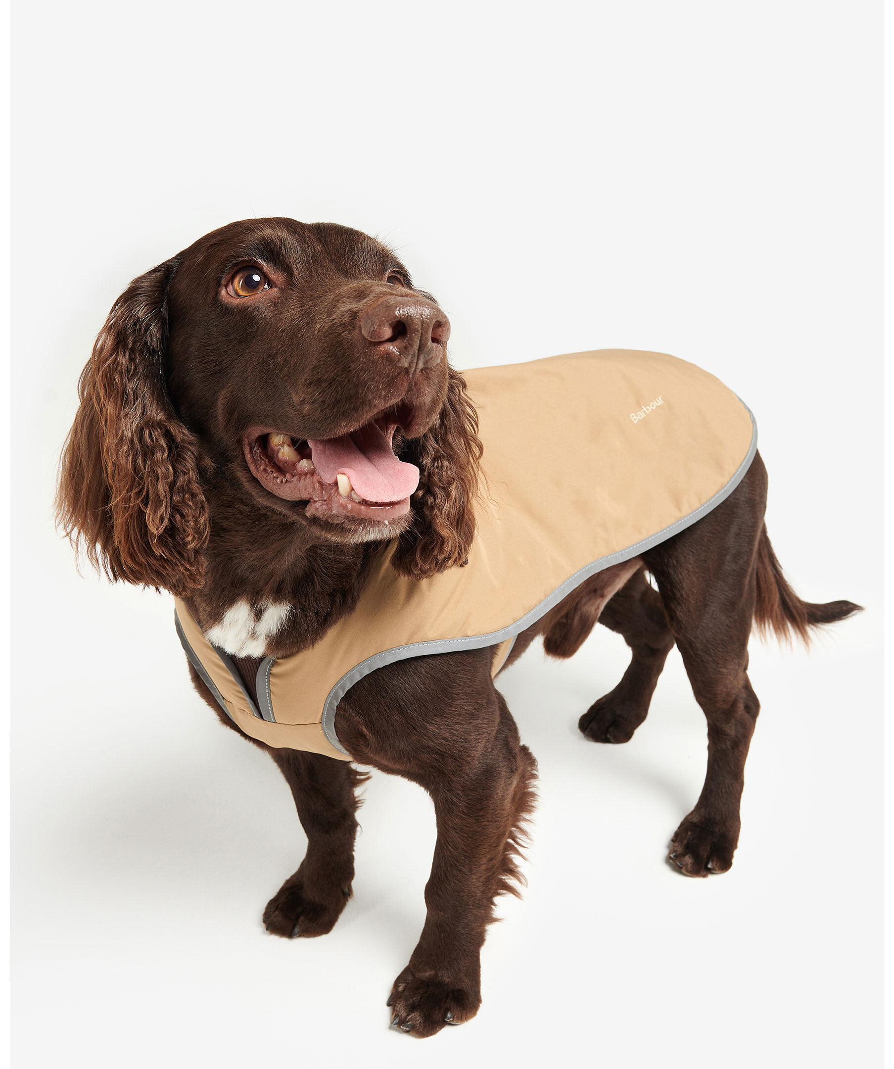 Beige, vattentät hundkappa från Barbour. Lätt design med en brun kontrastkrage i manchestertyg och hål för att fästa koppel under kragen. Bälte som dras runt midjan och spänns fast på sidan. Refelexdetalj runt kanterna.