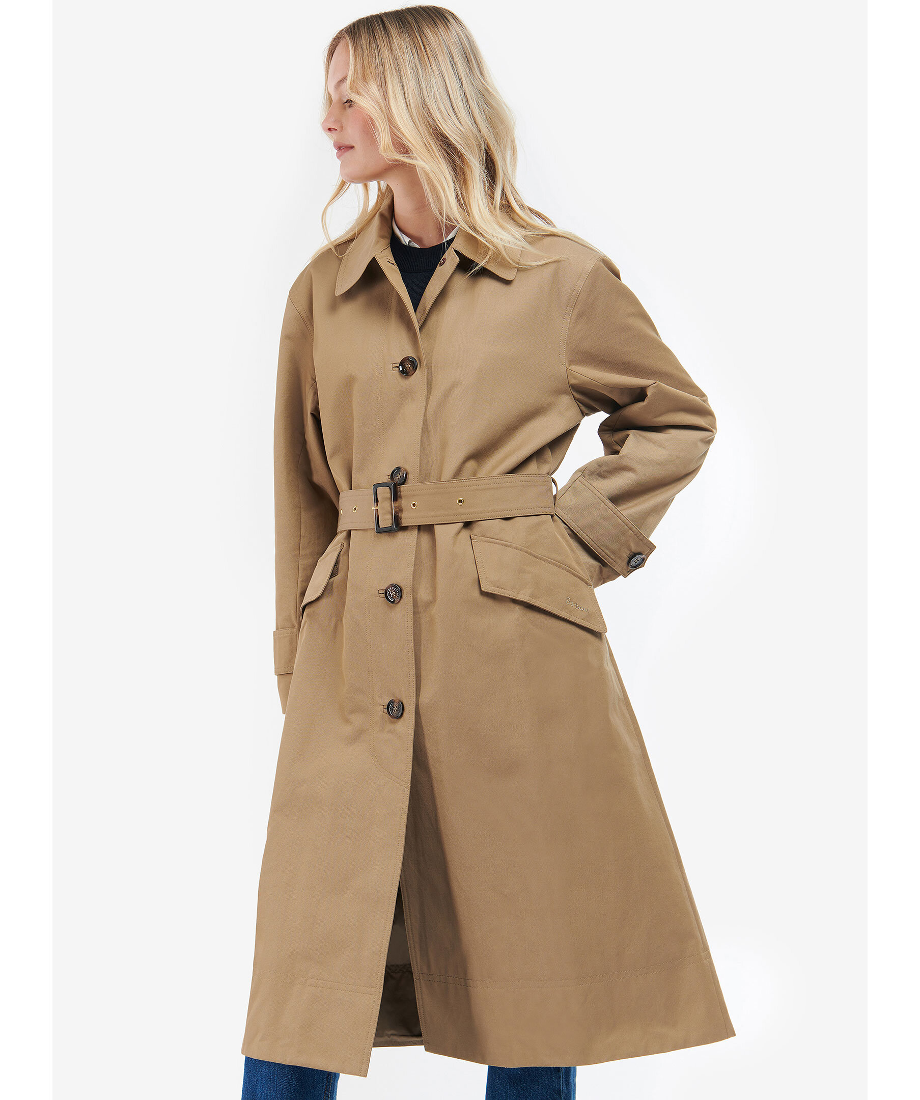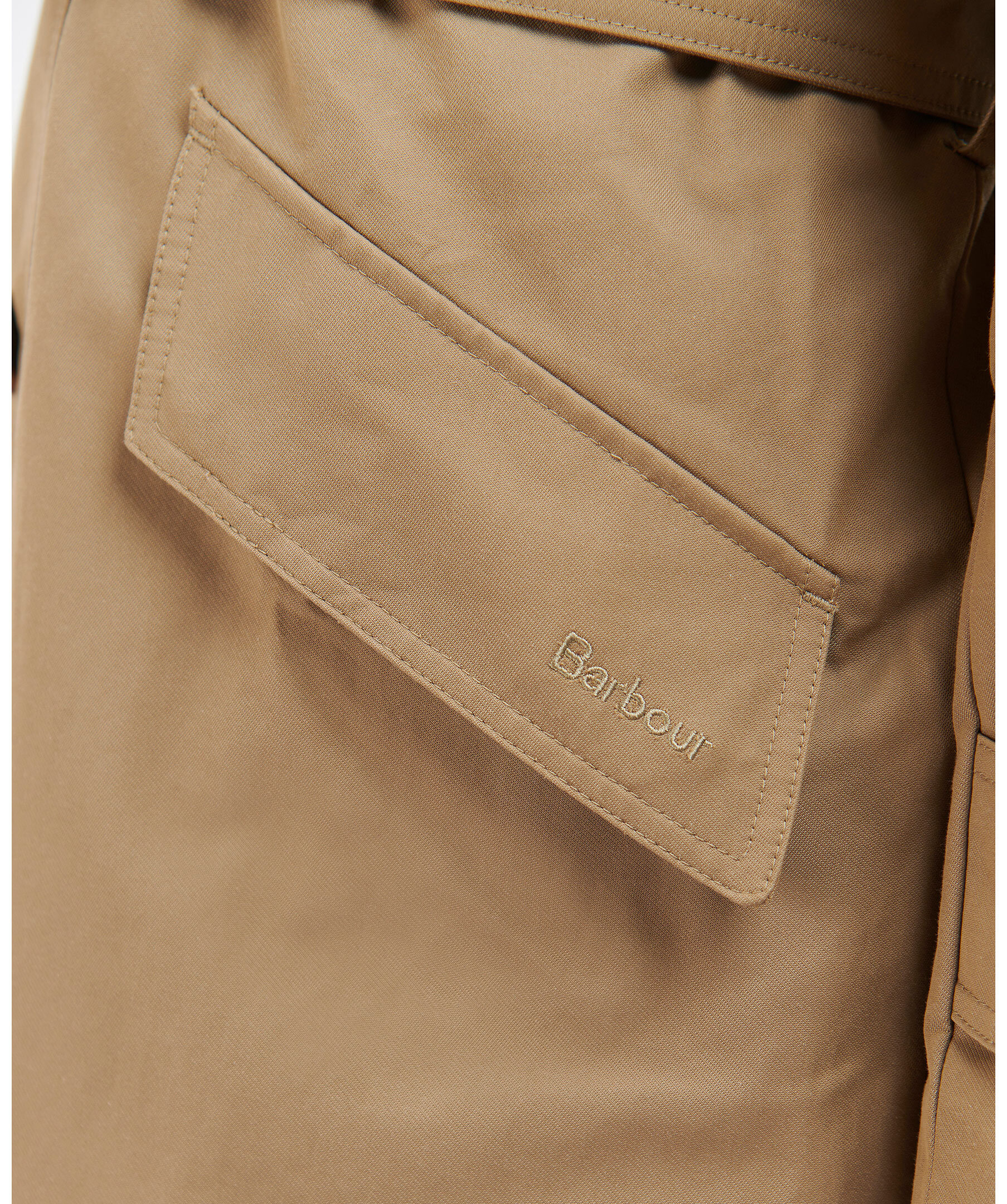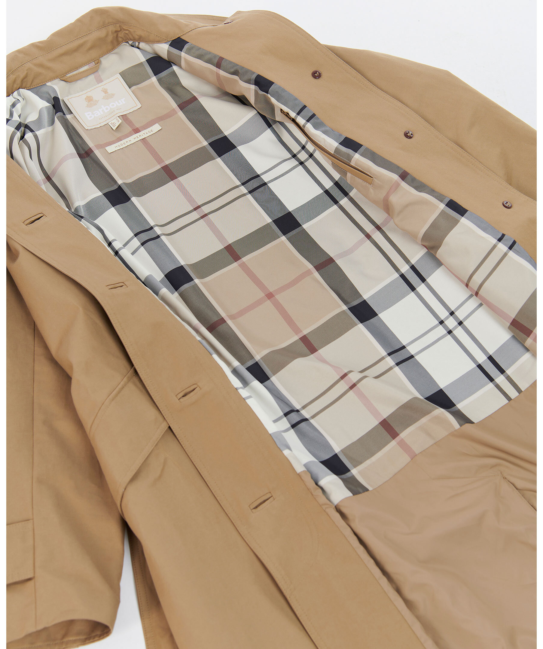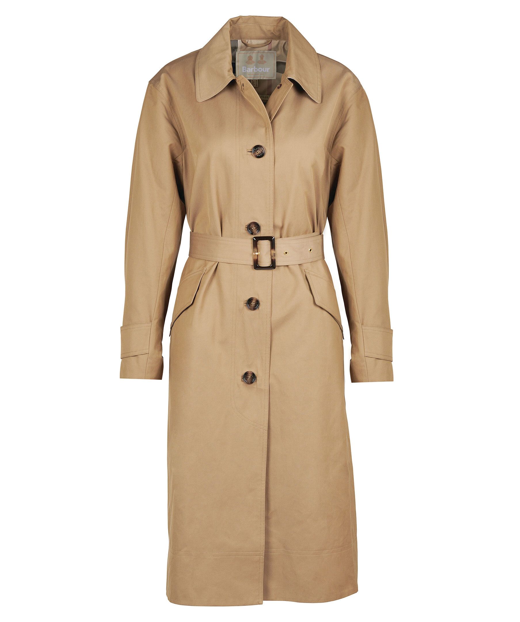 Beige trenchcoat från Barbour. Stora bruna knappar fram, klassiskt bälte i midjan, logotyp på vänster ficka. Tillverkad i bomullsmix.