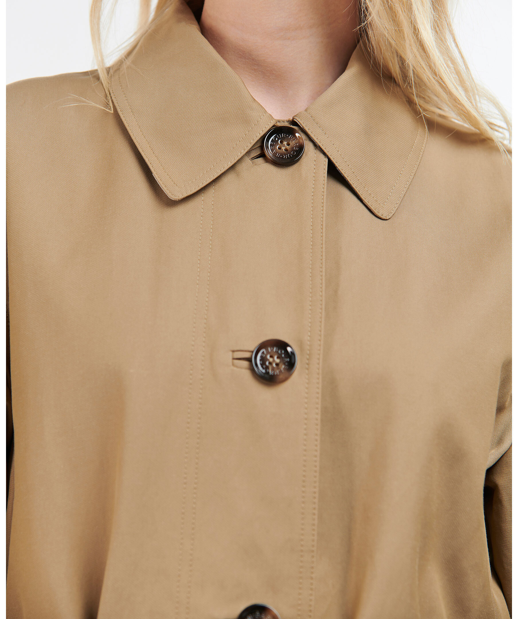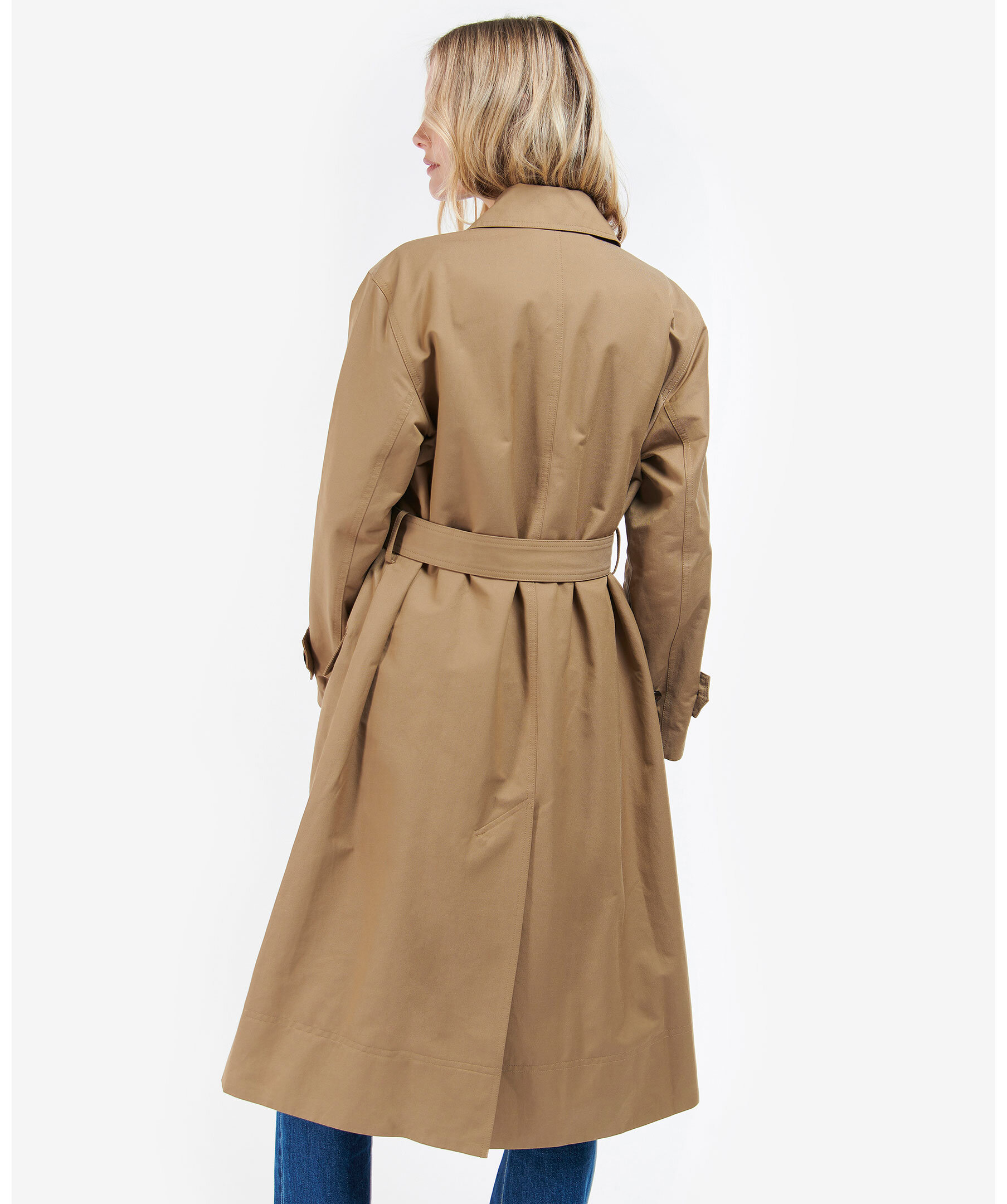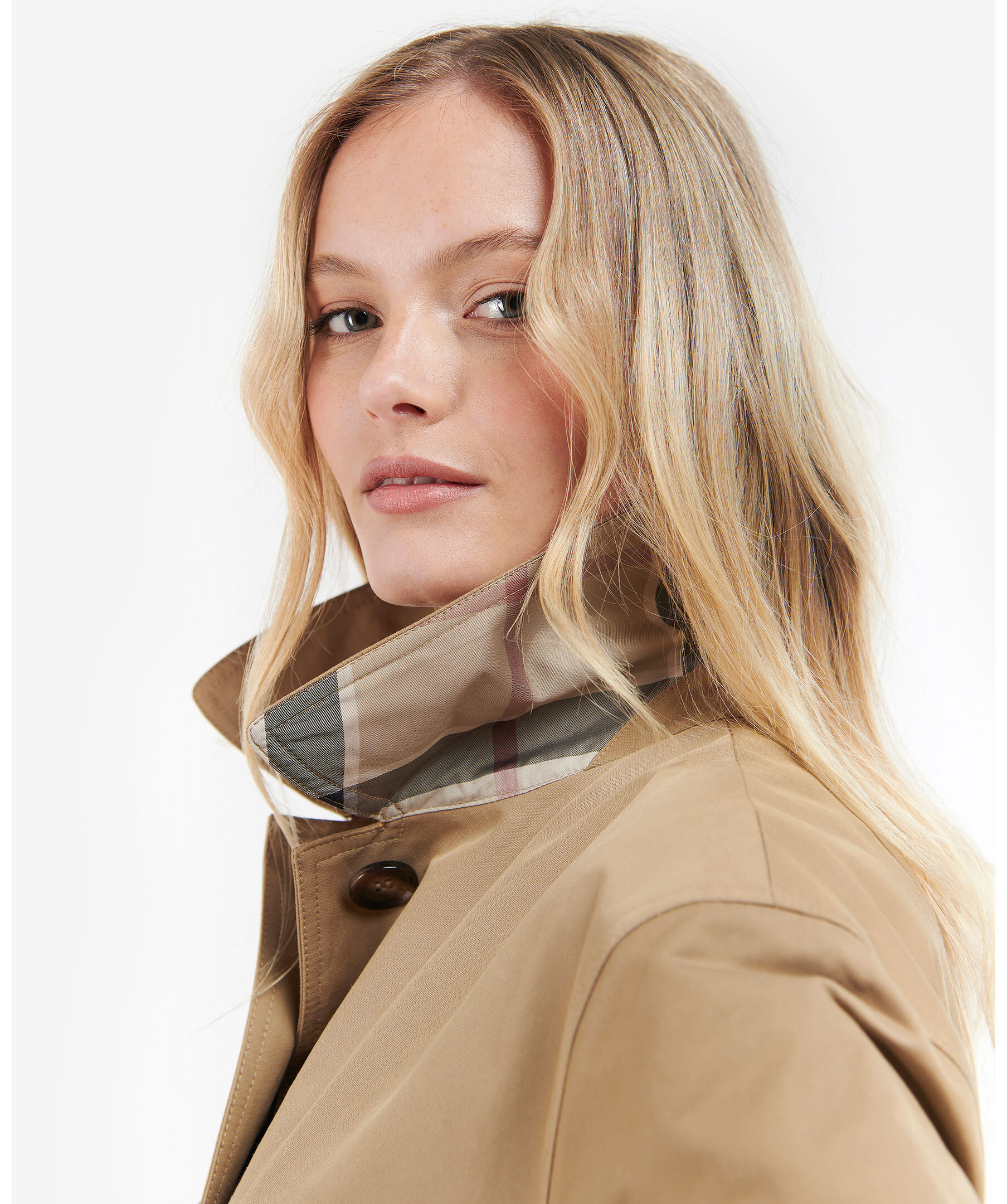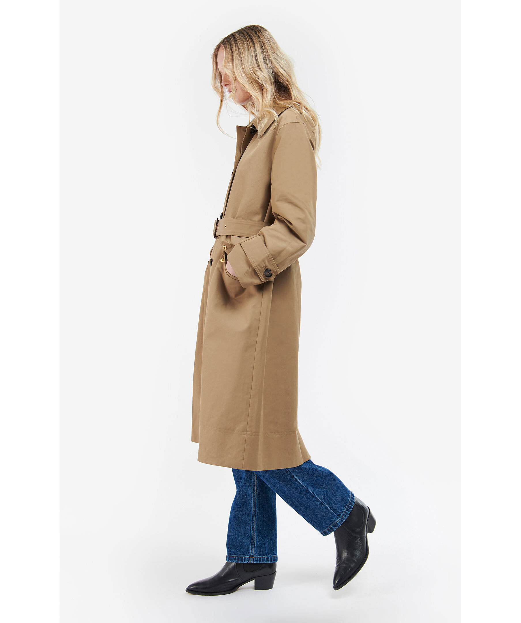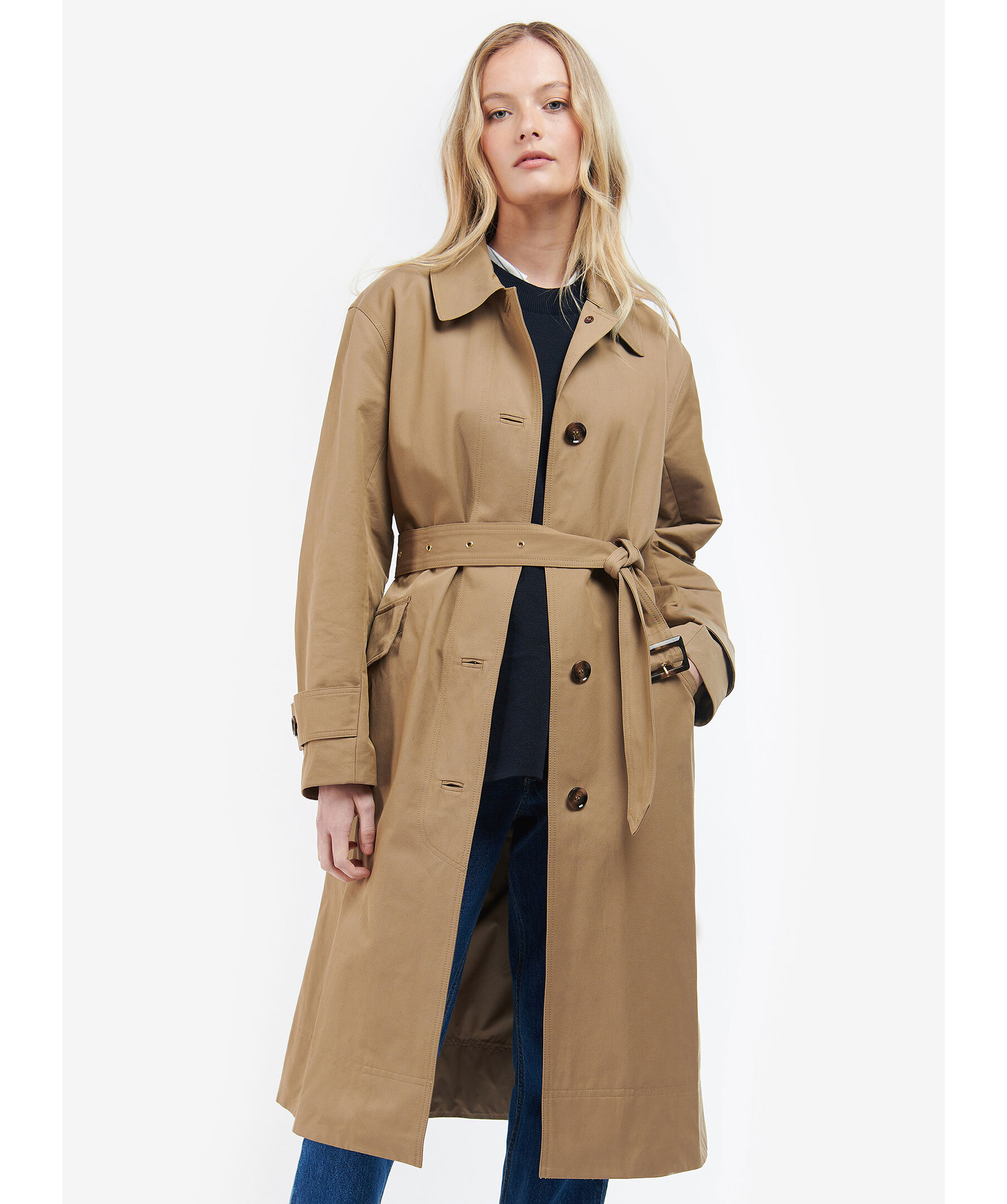 Beige trenchcoat från Barbour. Stora bruna knappar fram, klassiskt bälte i midjan, logotyp på vänster ficka. Tillverkad i bomullsmix.