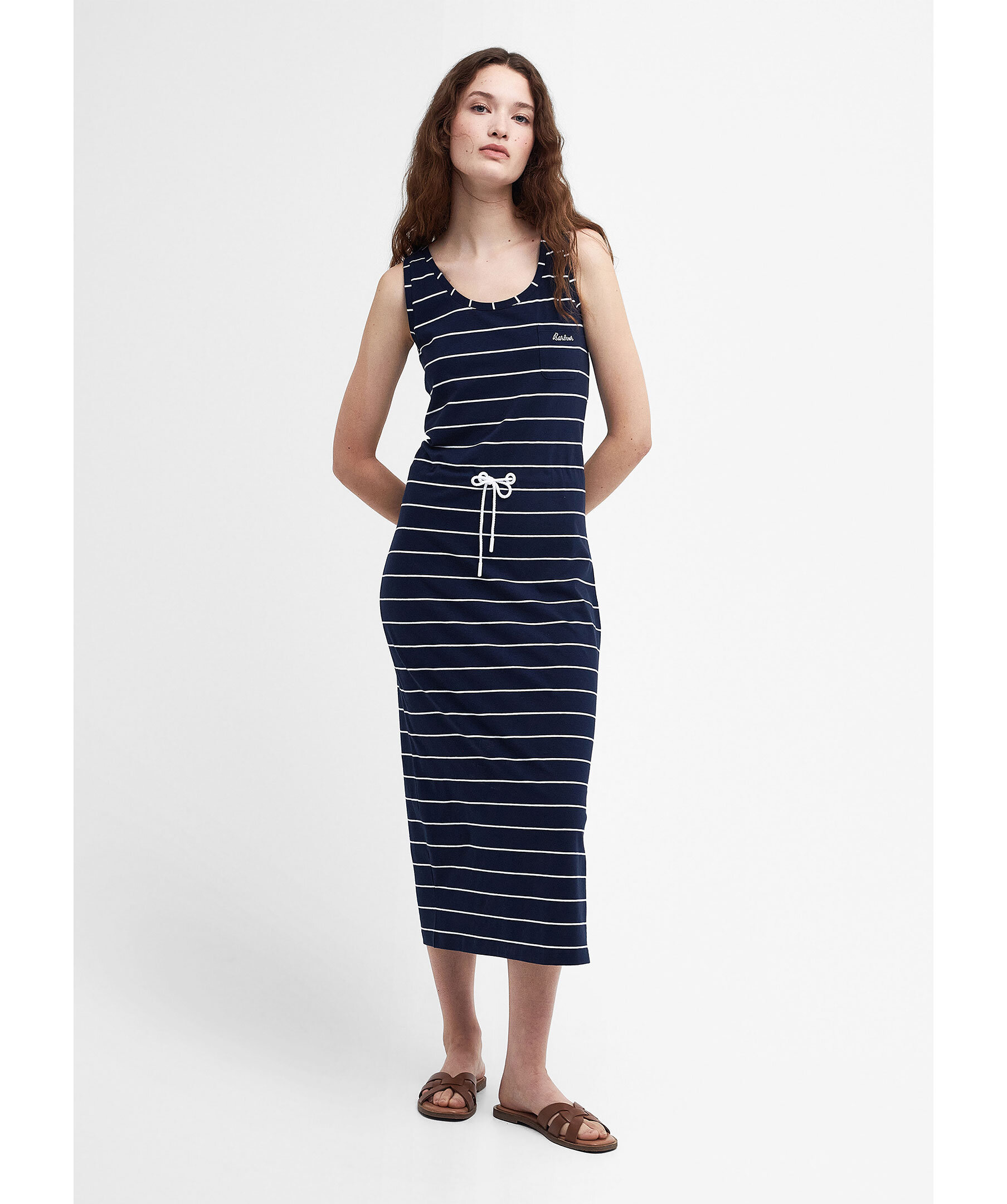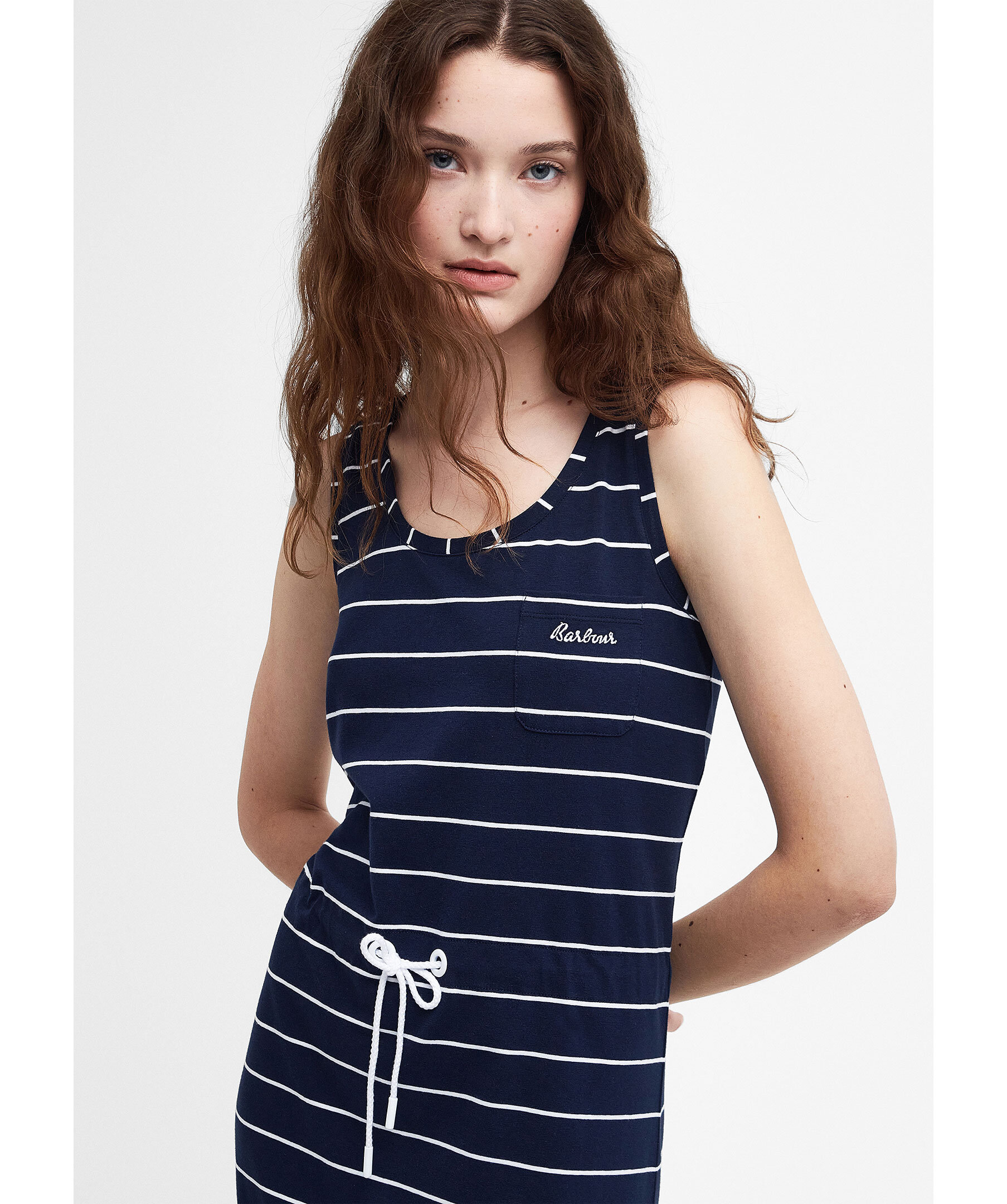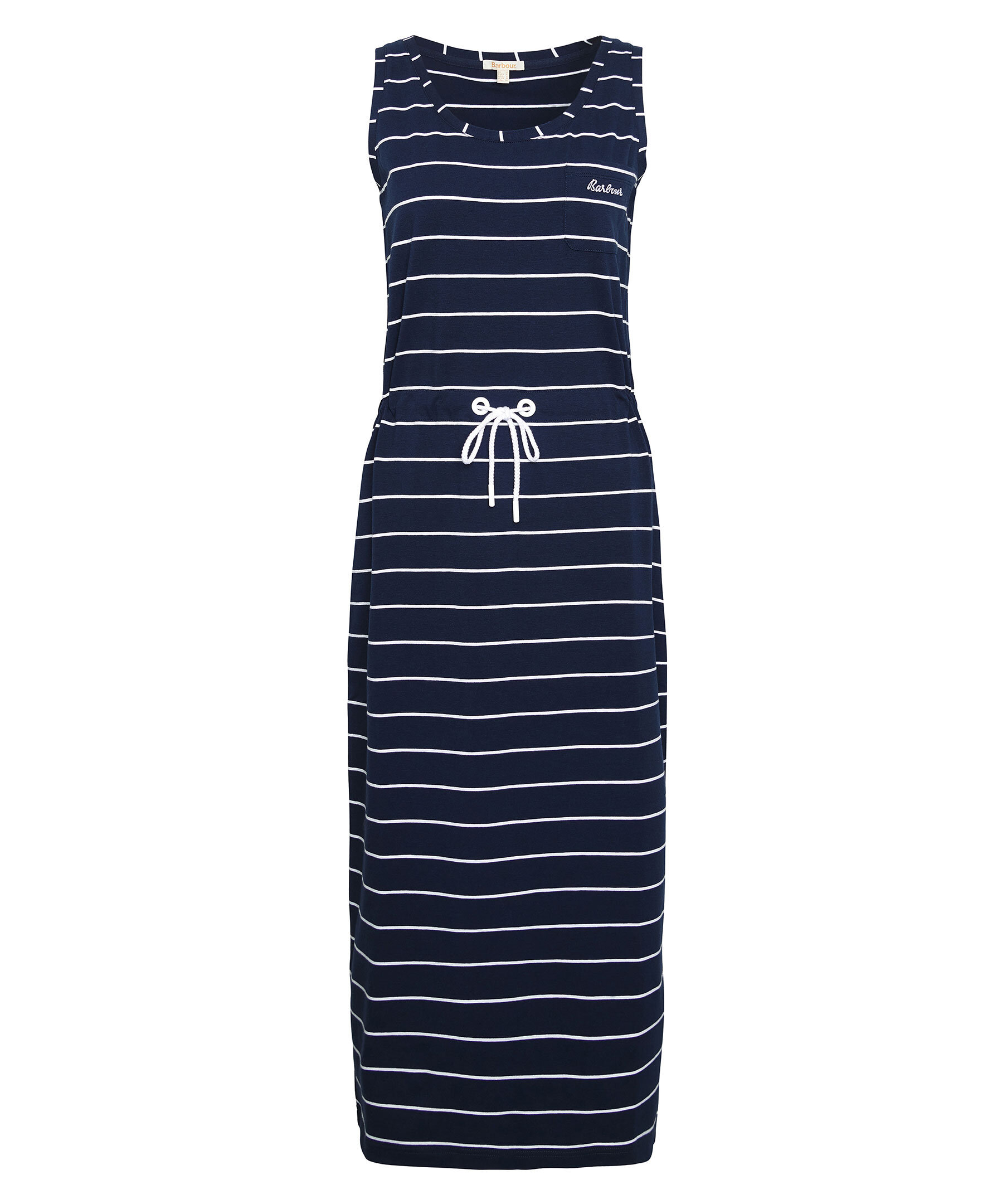 Marinblå, randig klänning från Barbour. Repinspirerad midja med dragsko för en smickrande siluett. Patch-ficka med broderad logotyp på. Tillverkad i en bomullsblandning. Avslappnad passform.
