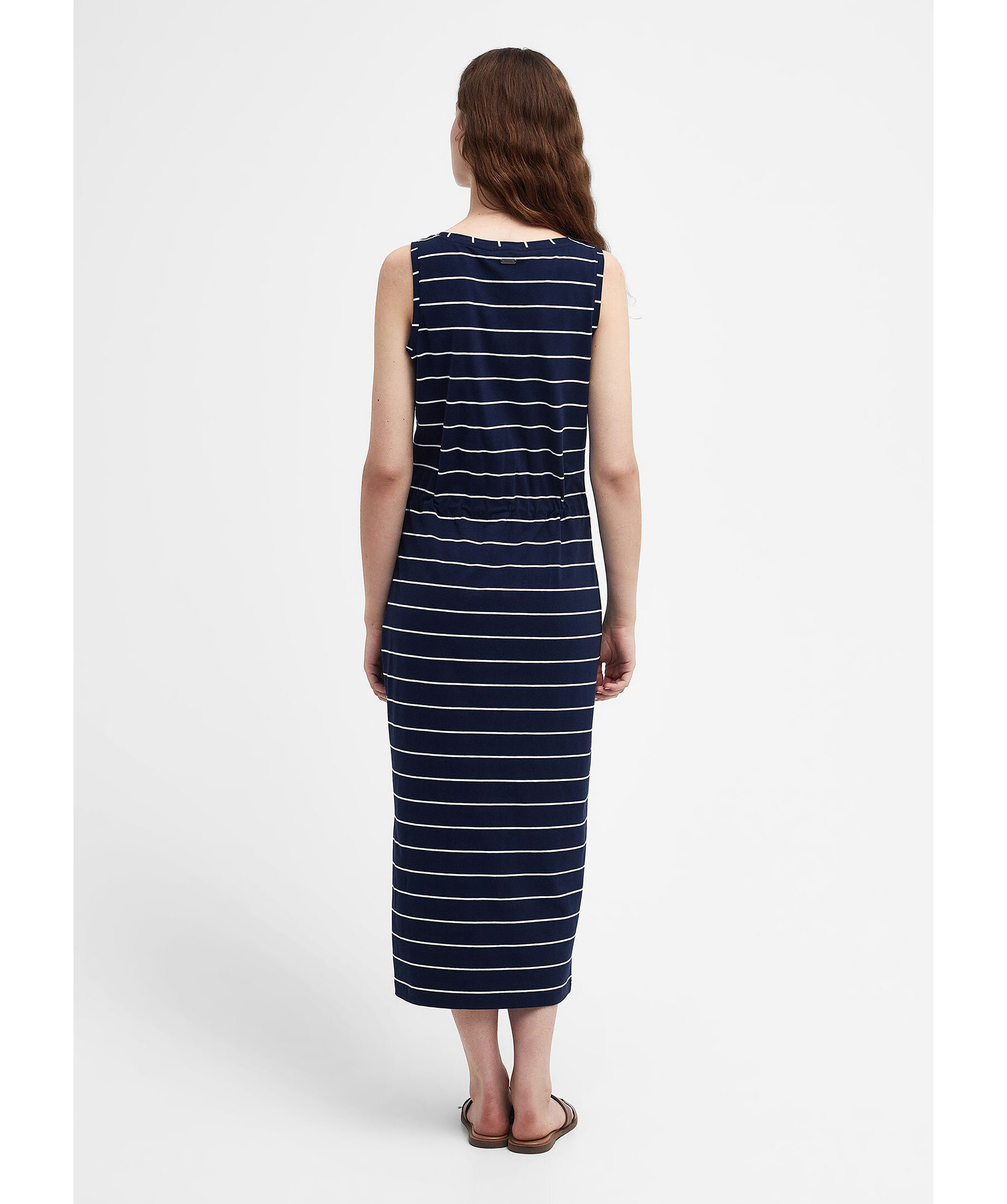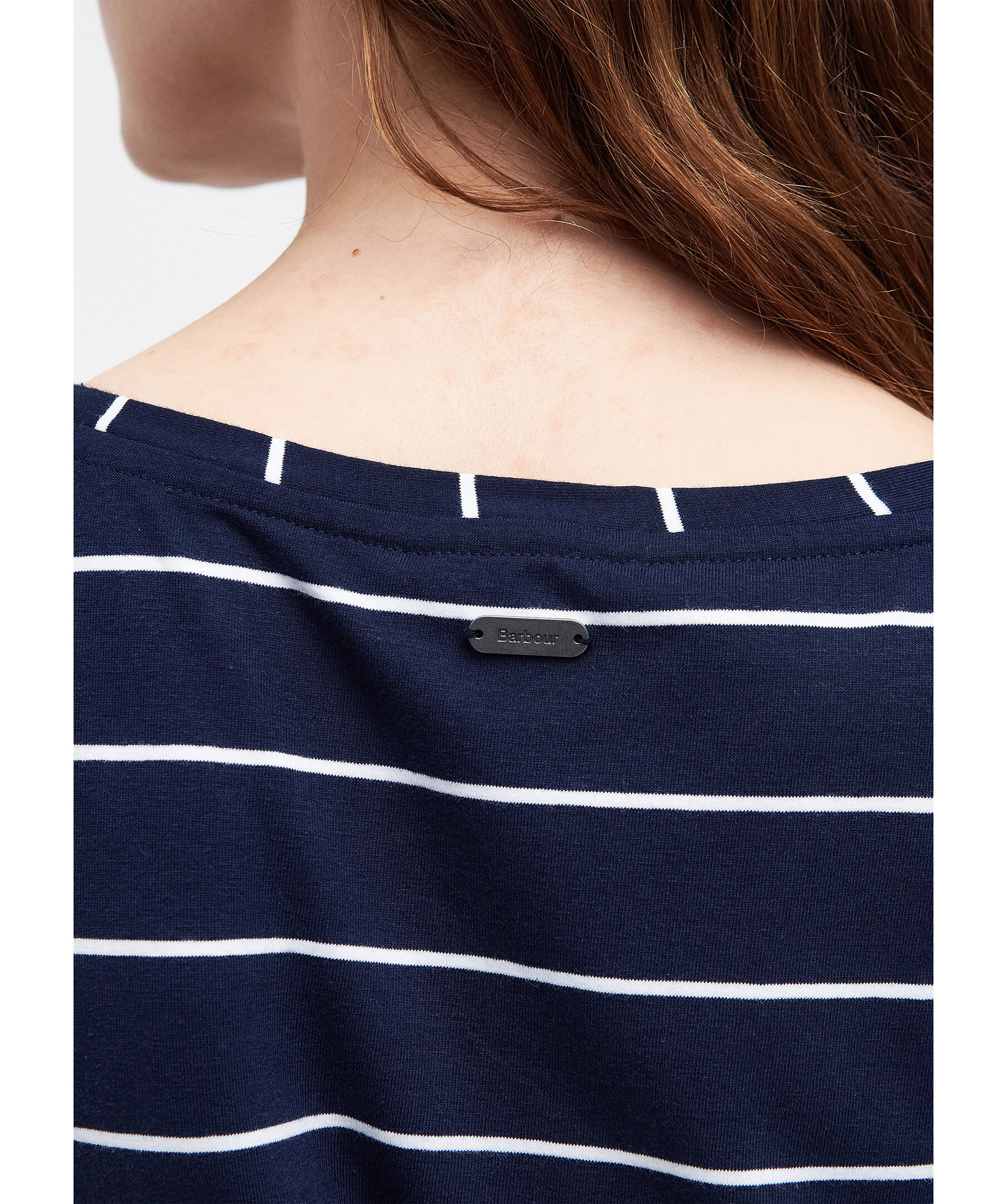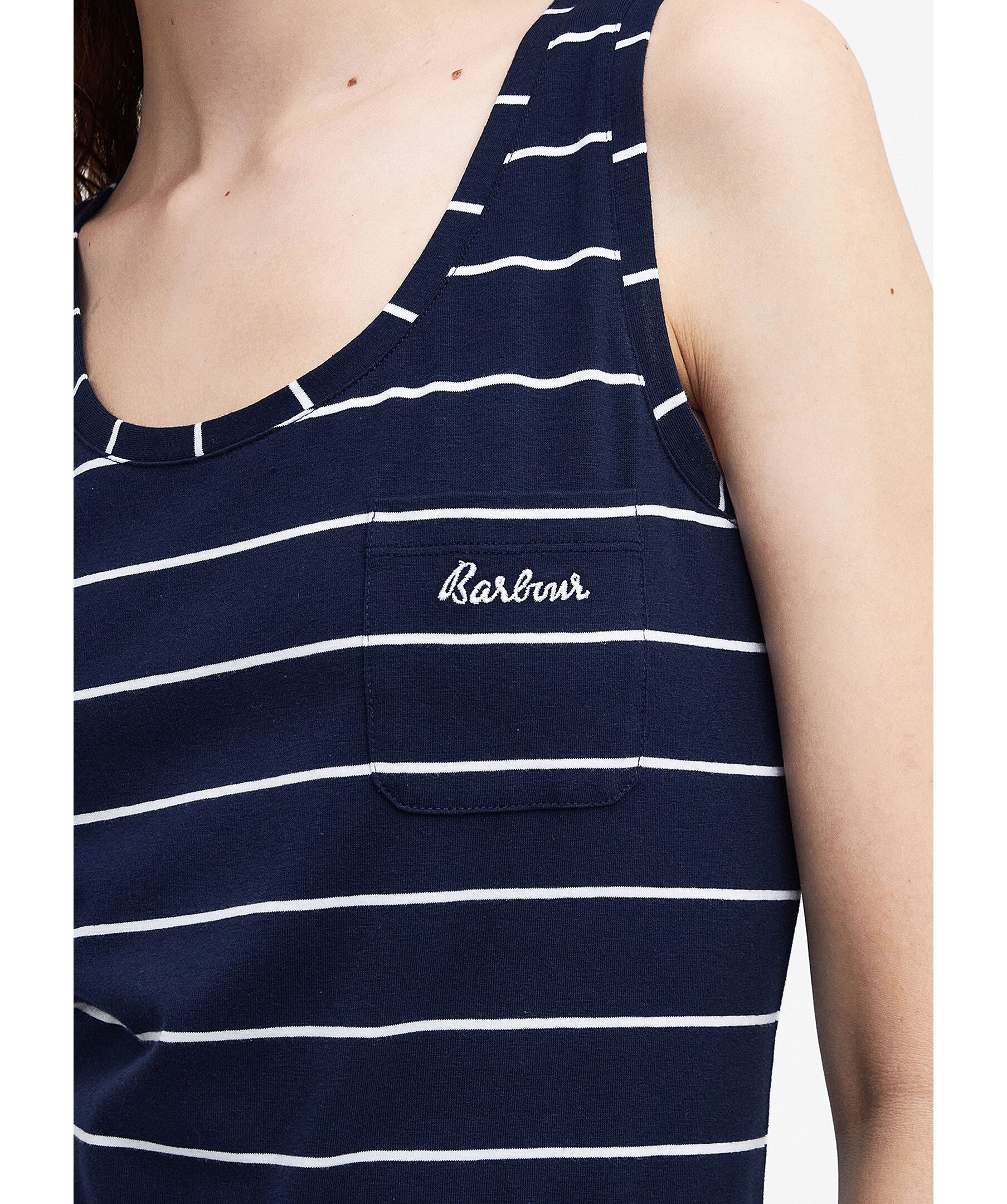 Marinblå, randig klänning från Barbour. Repinspirerad midja med dragsko för en smickrande siluett. Patch-ficka med broderad logotyp på. Tillverkad i en bomullsblandning. Avslappnad passform.