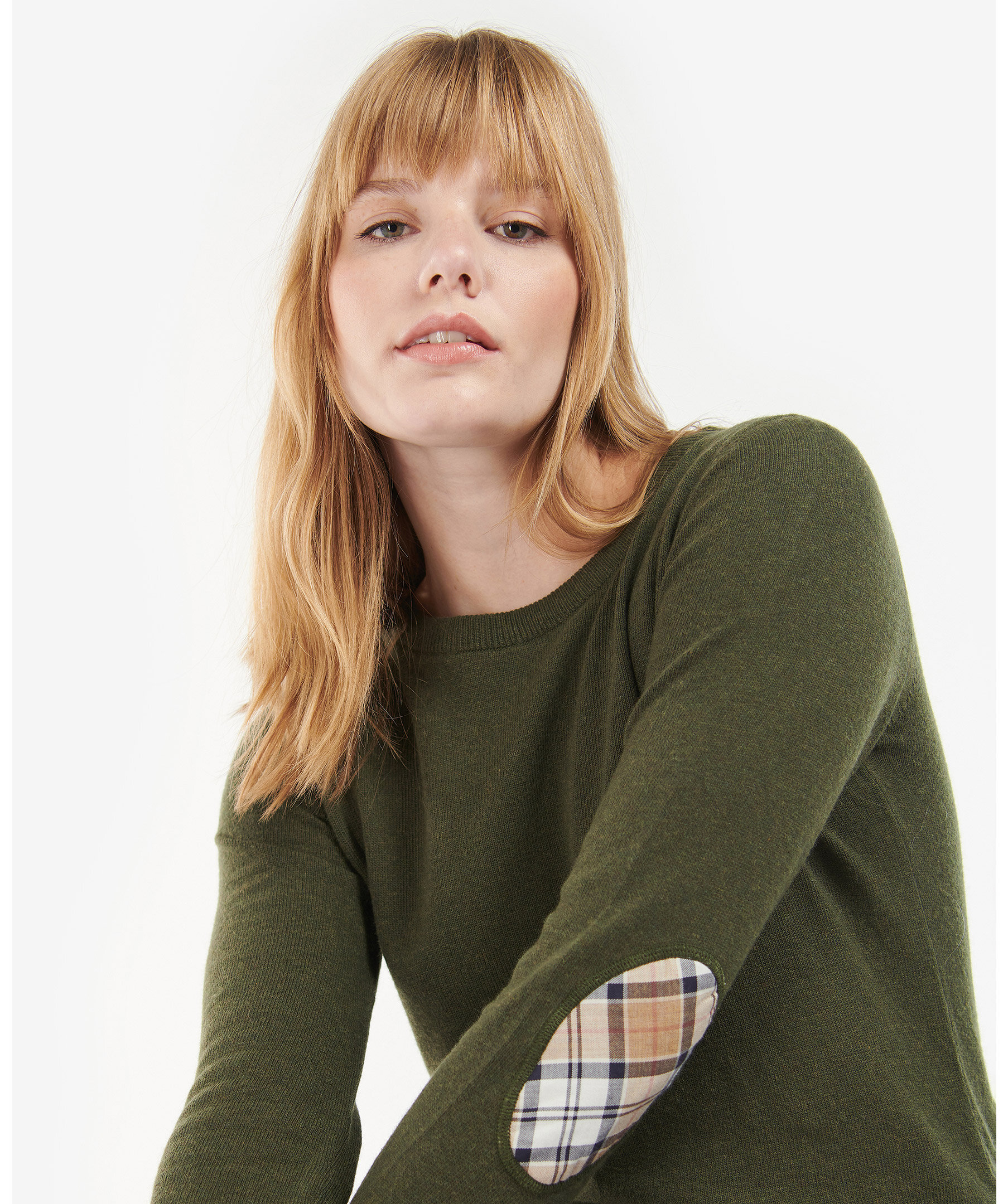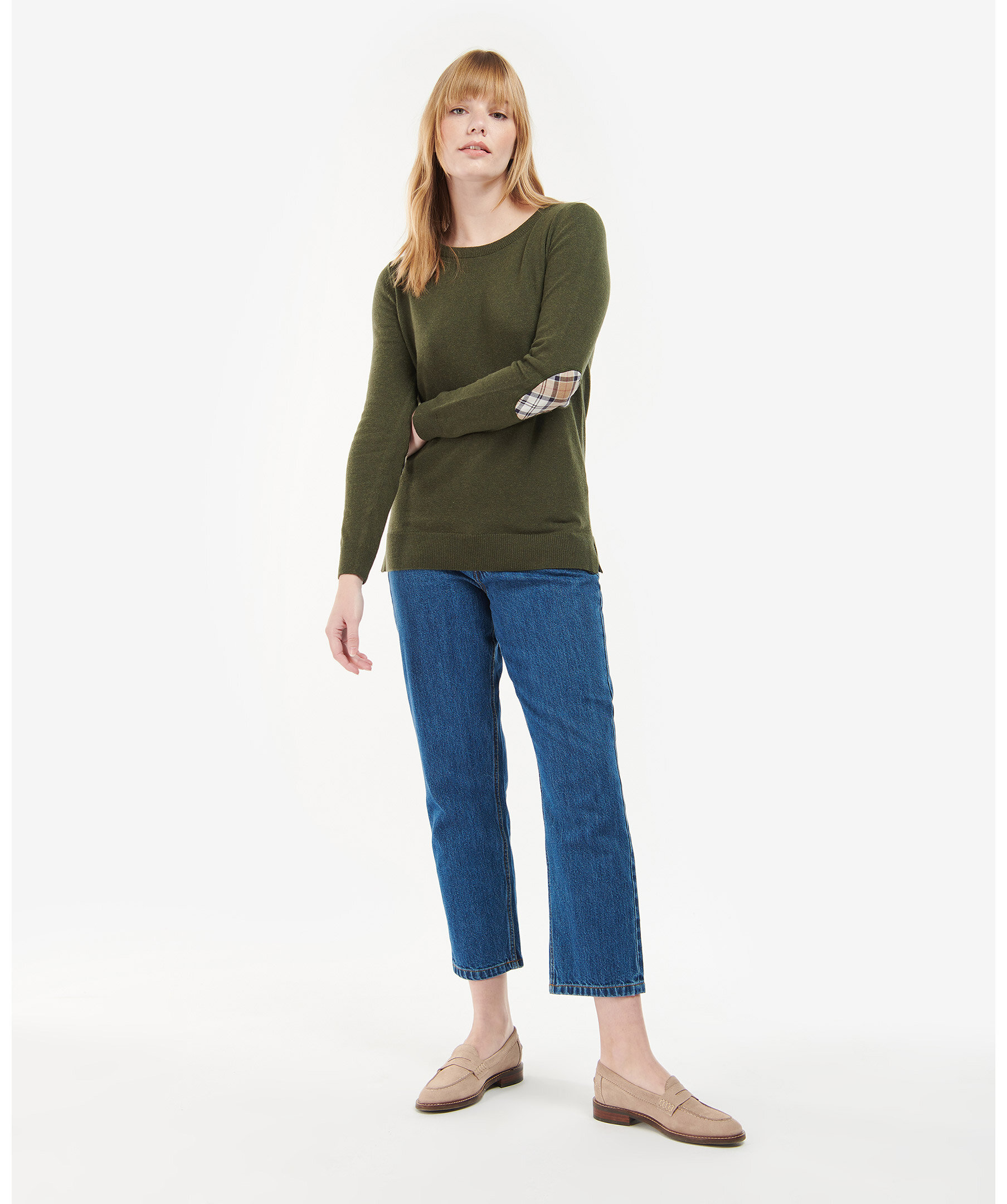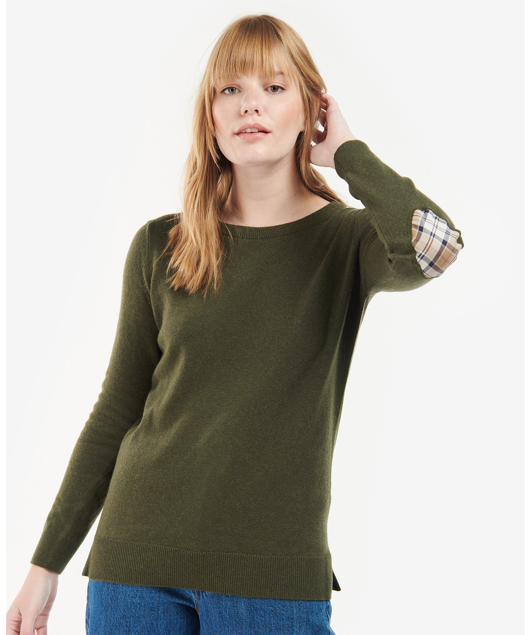 Finstickad tröja i normal passform och har rund halsringning från Barbour. Långa ärmar och ribbade kanter. Tillverkad i mjuk blandning av ull och bomull och har patchar på armbågar med rutigt tartanmönster.