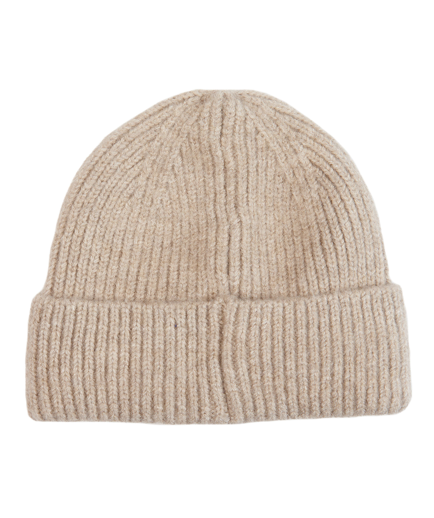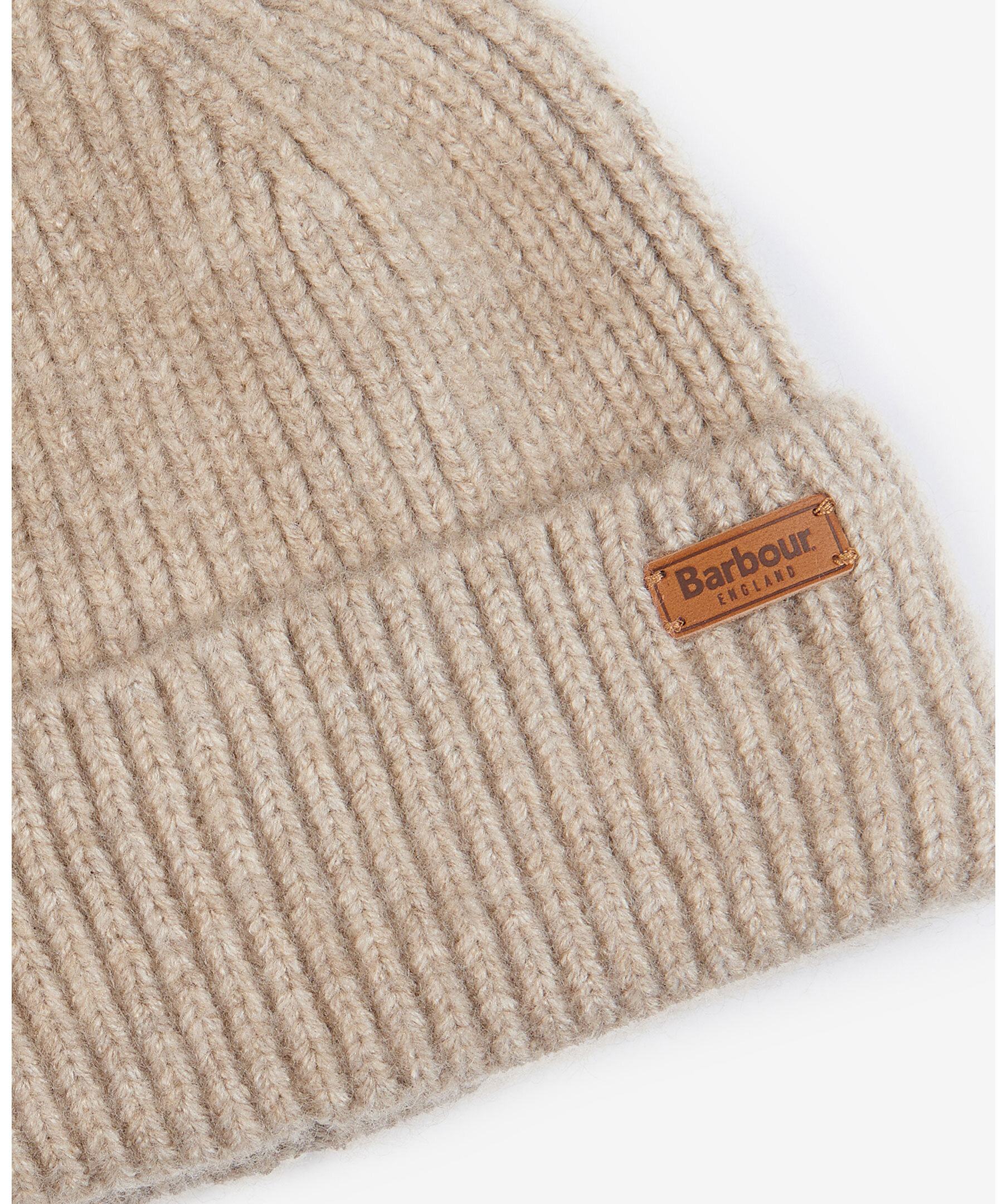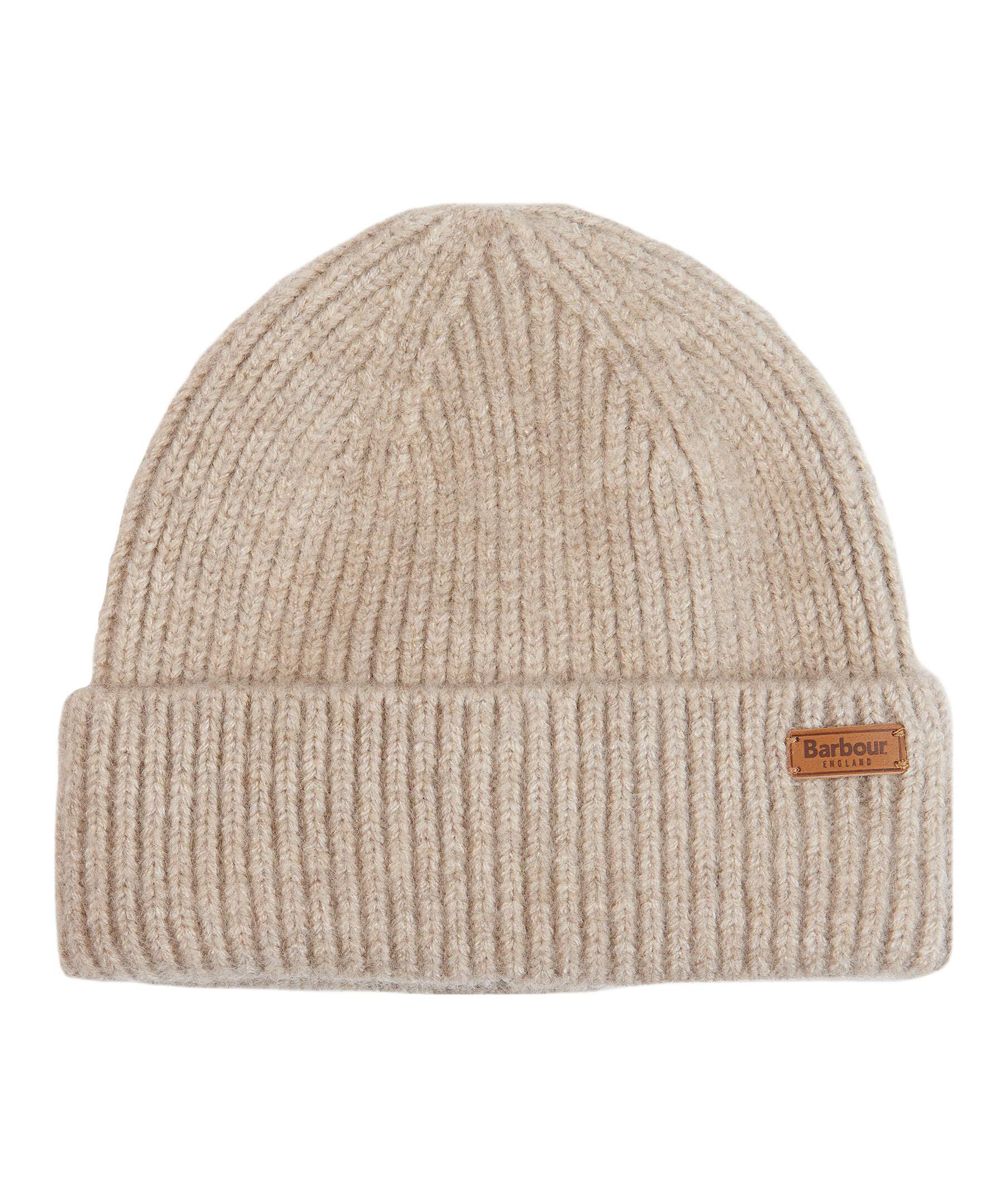 Beige melerad ribbstickad mössa från Barbour. Uppvikt kant med stansad logotyp i läder. Tillverkad i stretchig polyester.