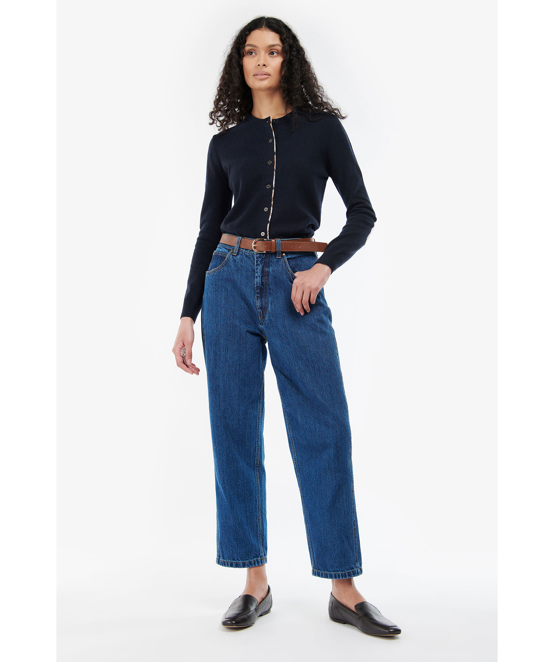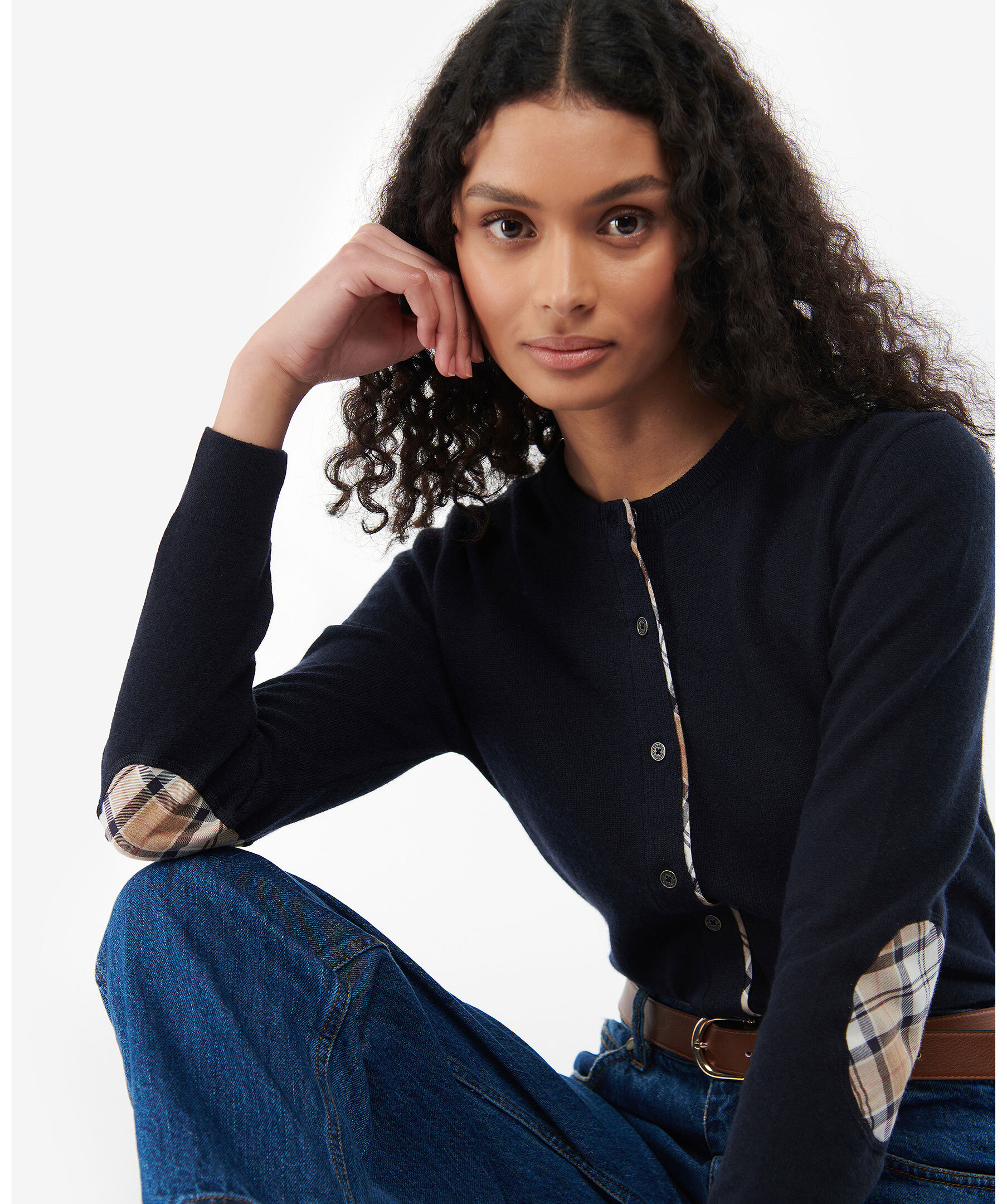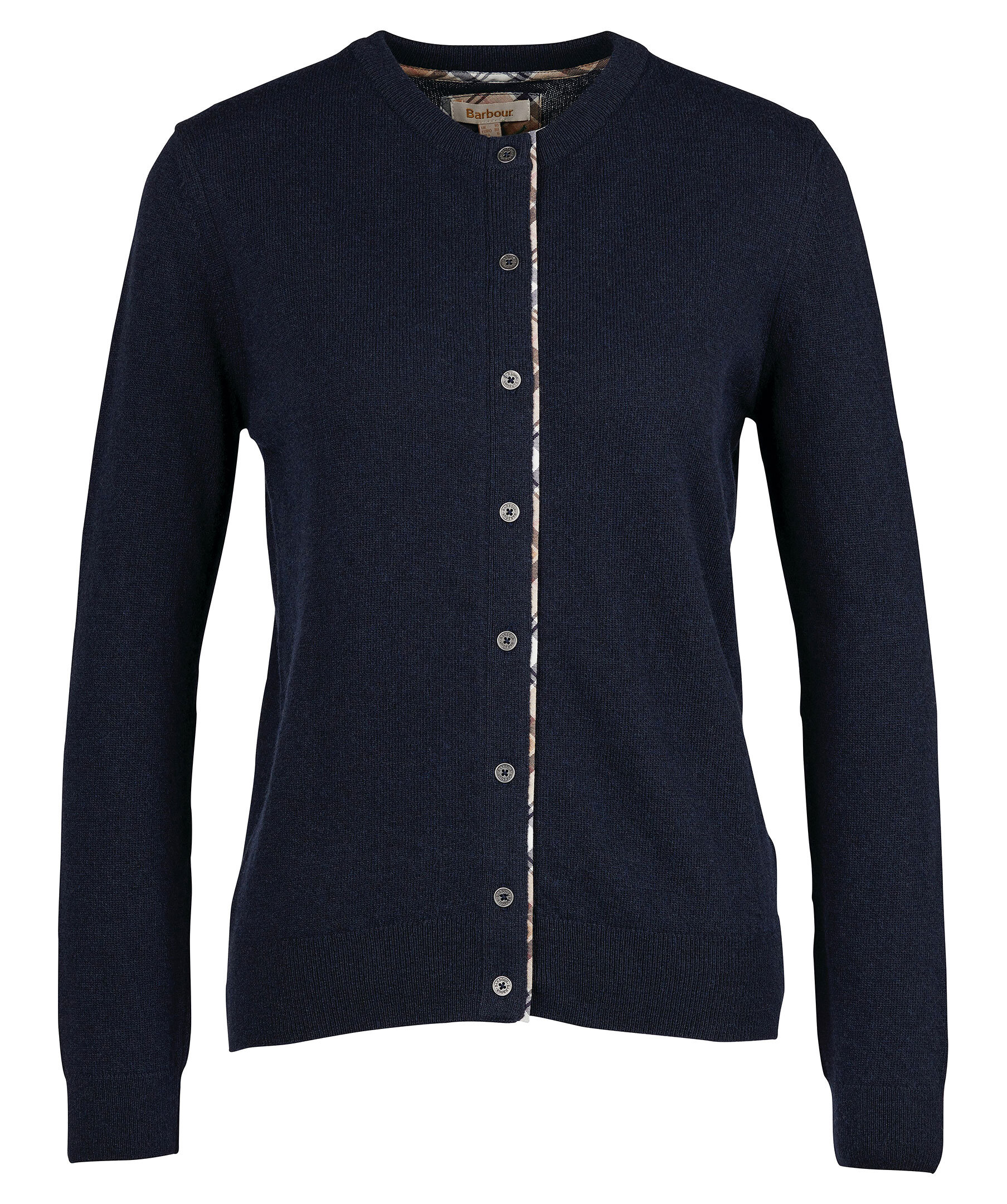 Svart långärmad cardigan från Barbour, tartan-mönstrade detaljer, stängs med kappar framtill, rundad hals. Tillverkad i ull och bomull.