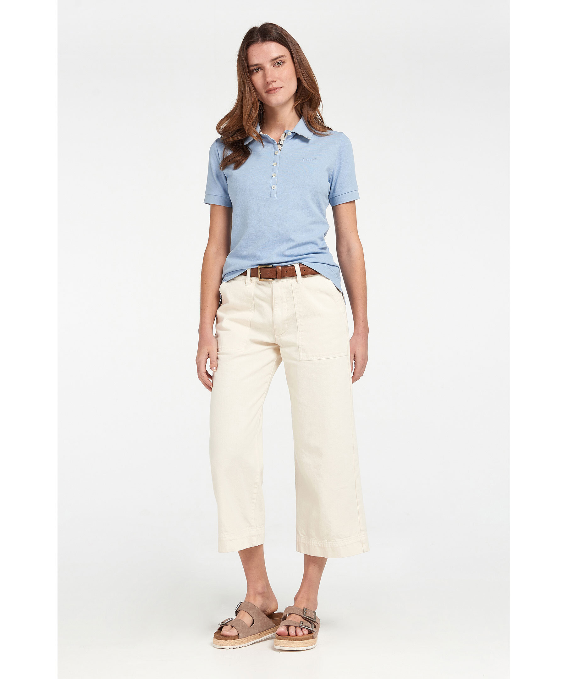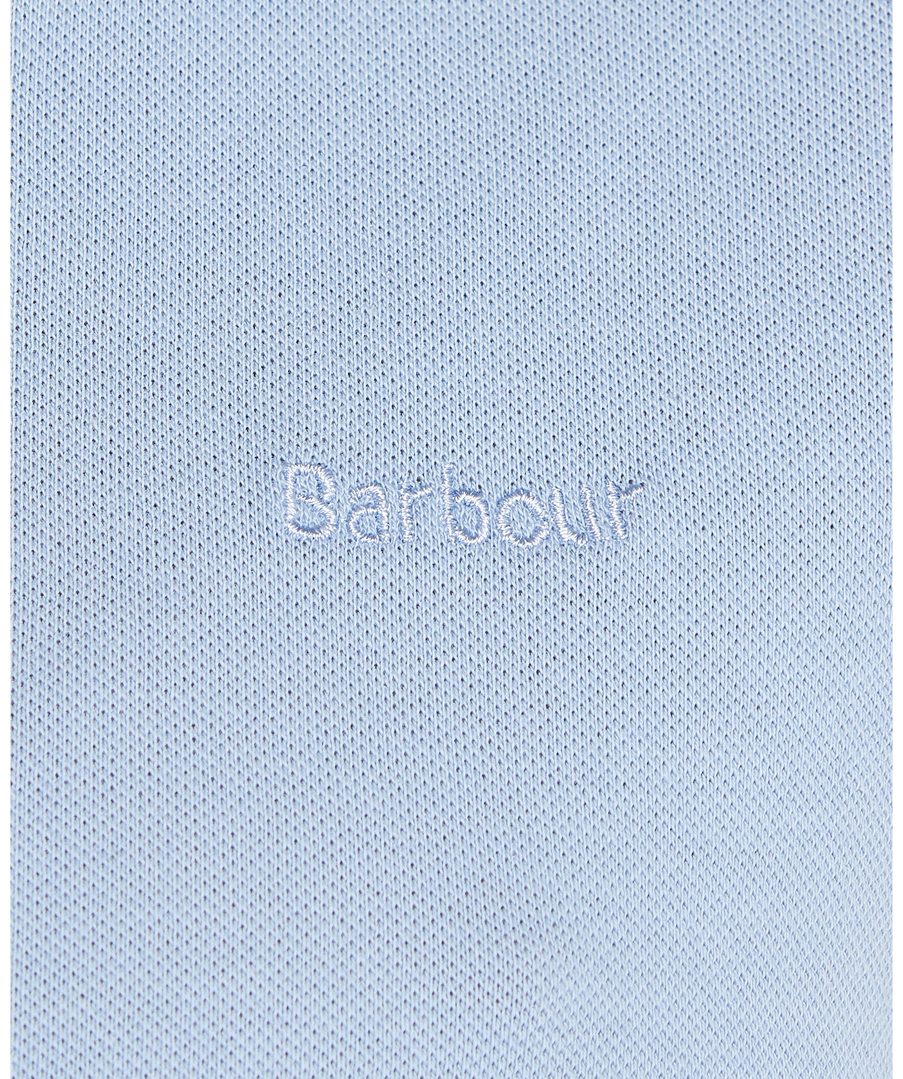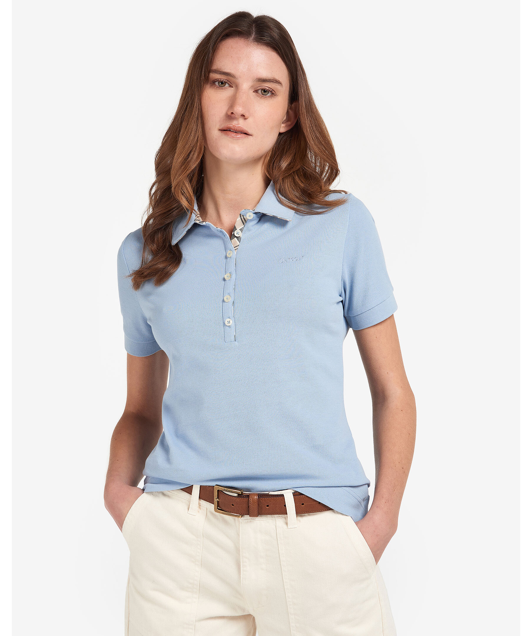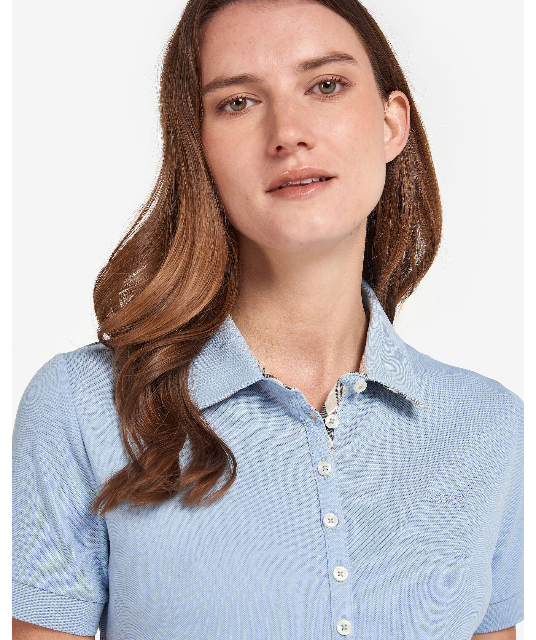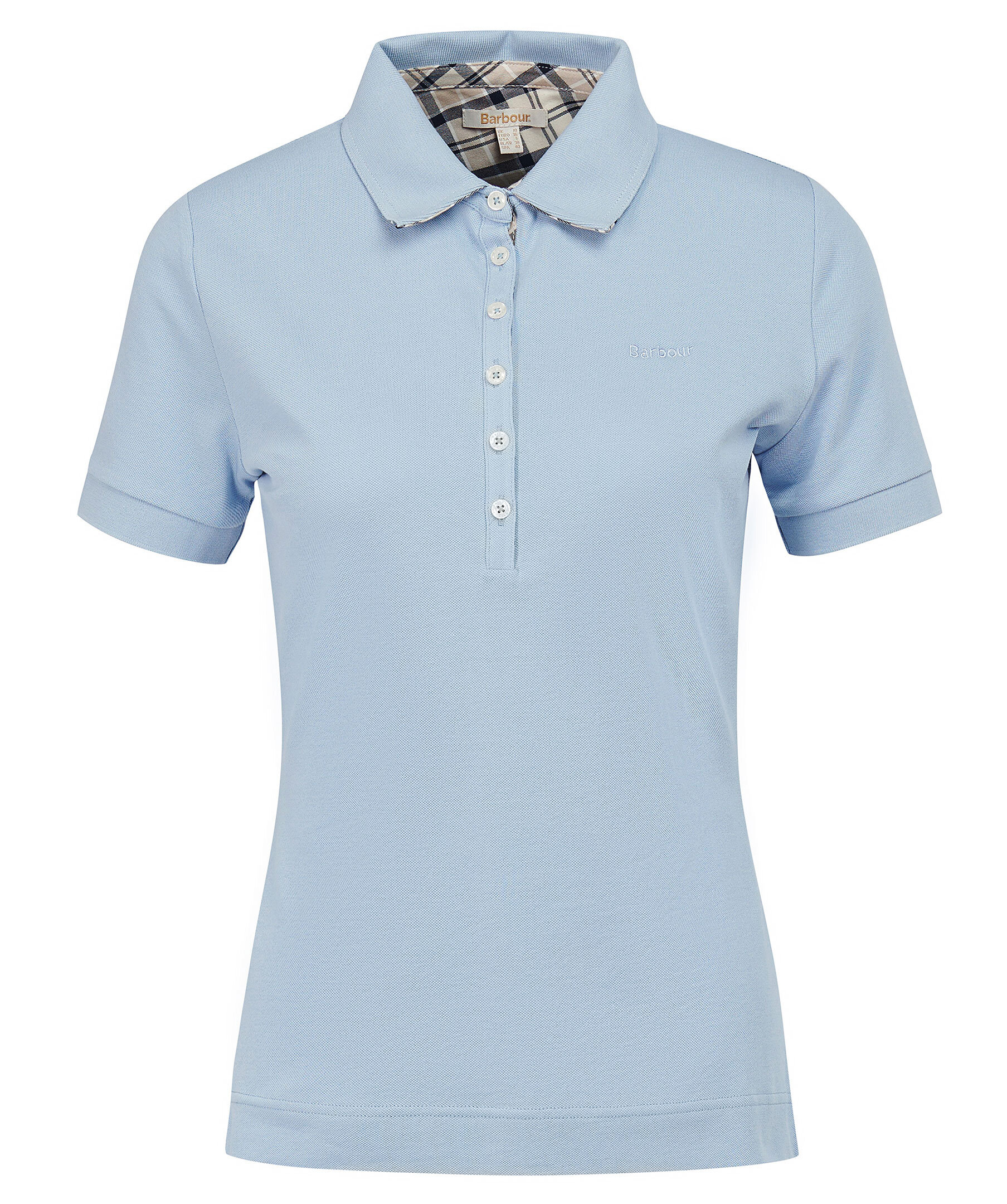 Ljusblå, klassisk pikétröja i en feminin passform från Barbour. Tillverkad av ett mjuk stretchigt bomulltyg. Krage med rutigt tartan-mönster undertill som även finns under knappslån som syns när man öppnar upp den djupa knäppningen som har sex vita knappar fram. Ribbad kant i ärmsluten och en tonalt broderad Barbour-logga på vänster sida av bröstet.
