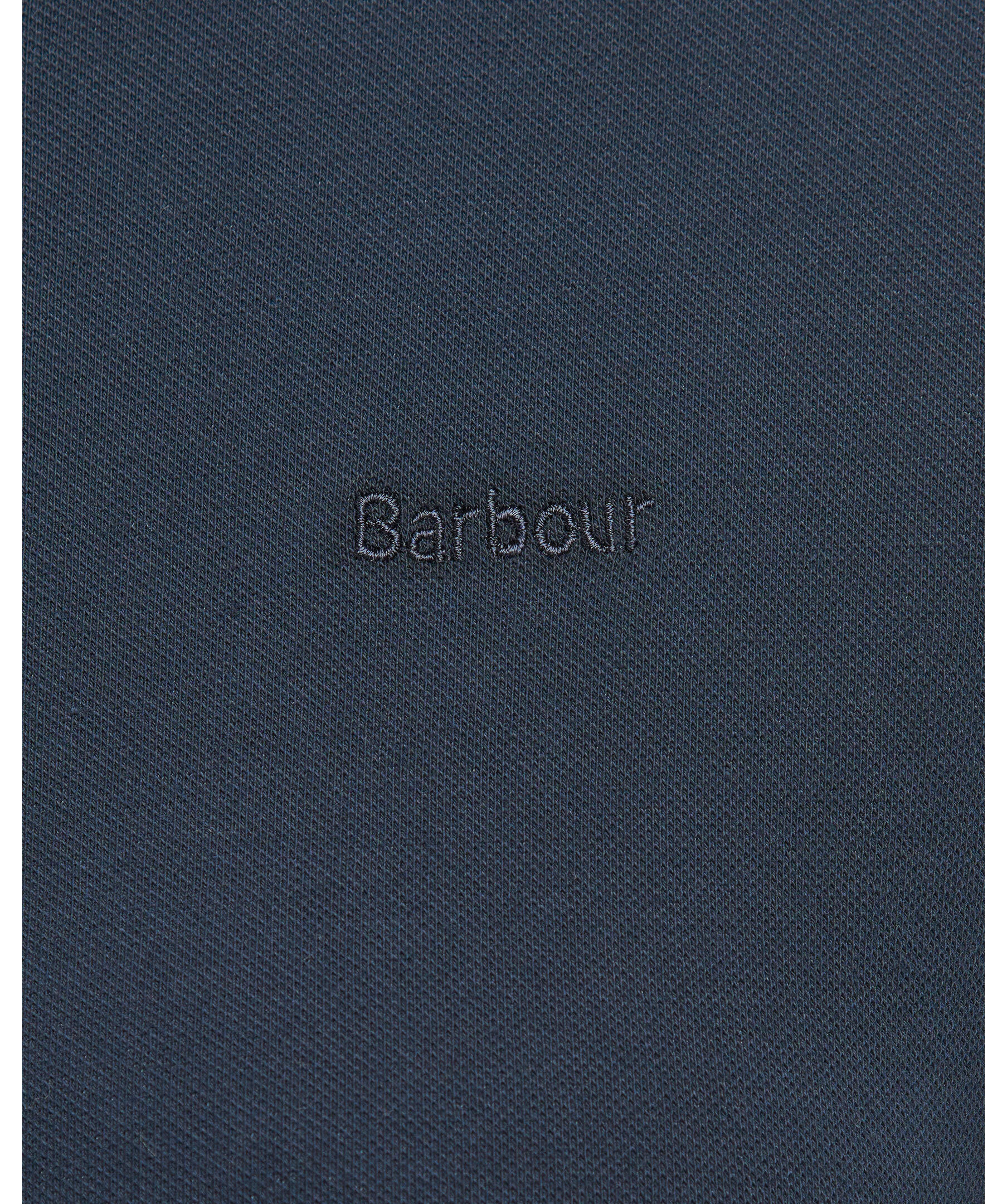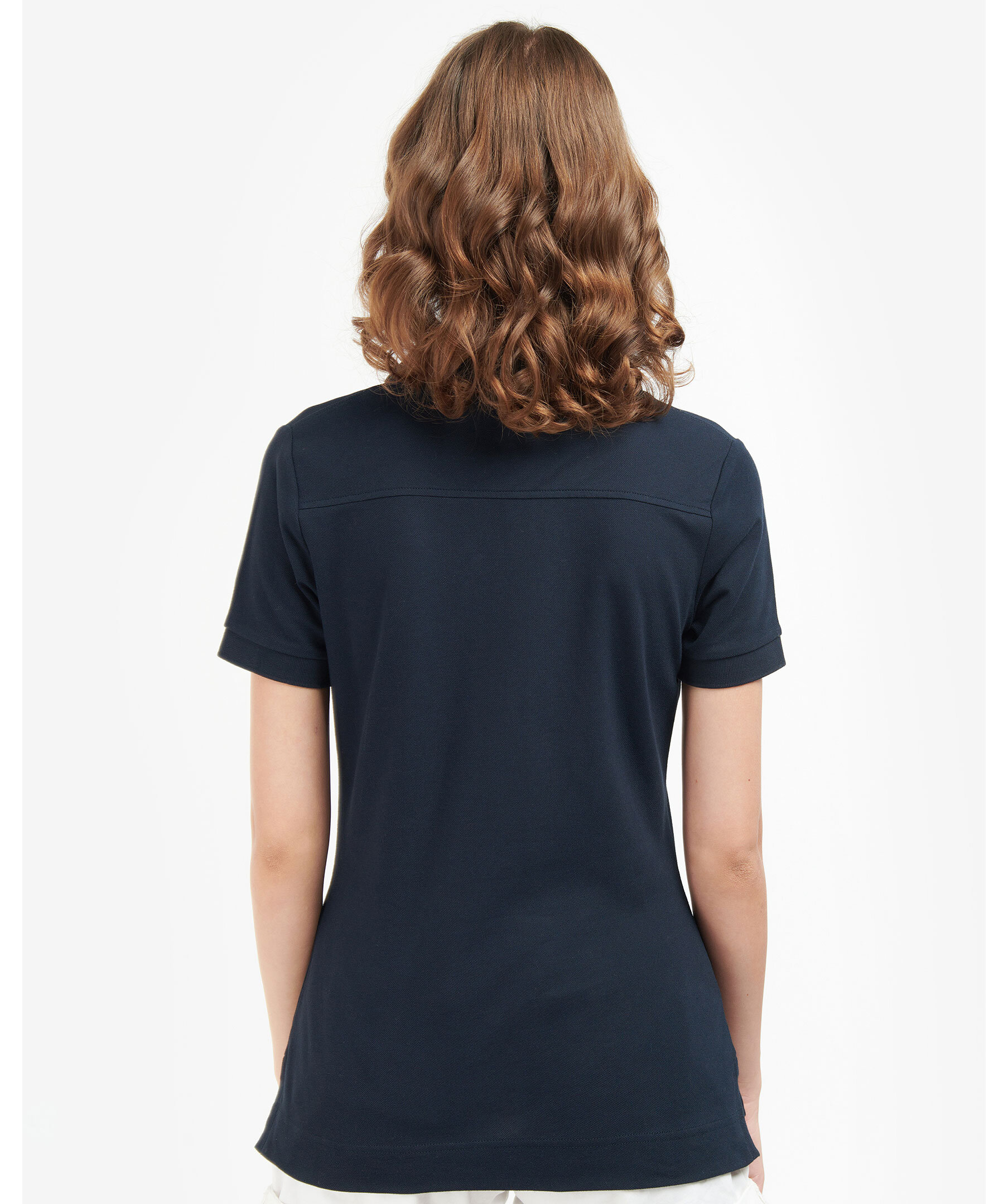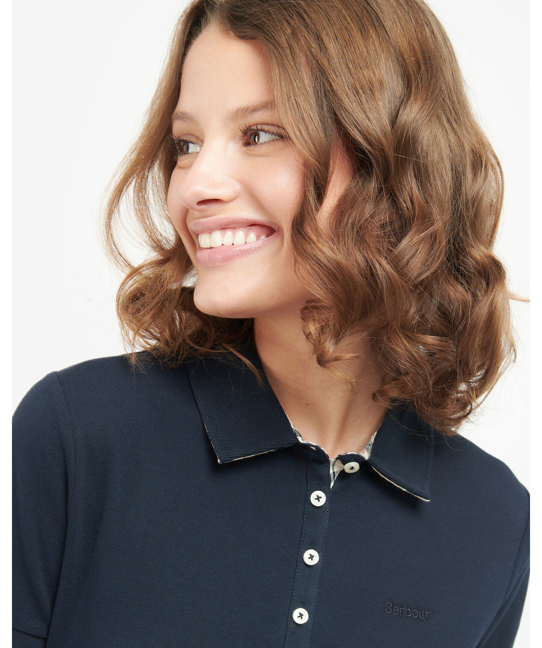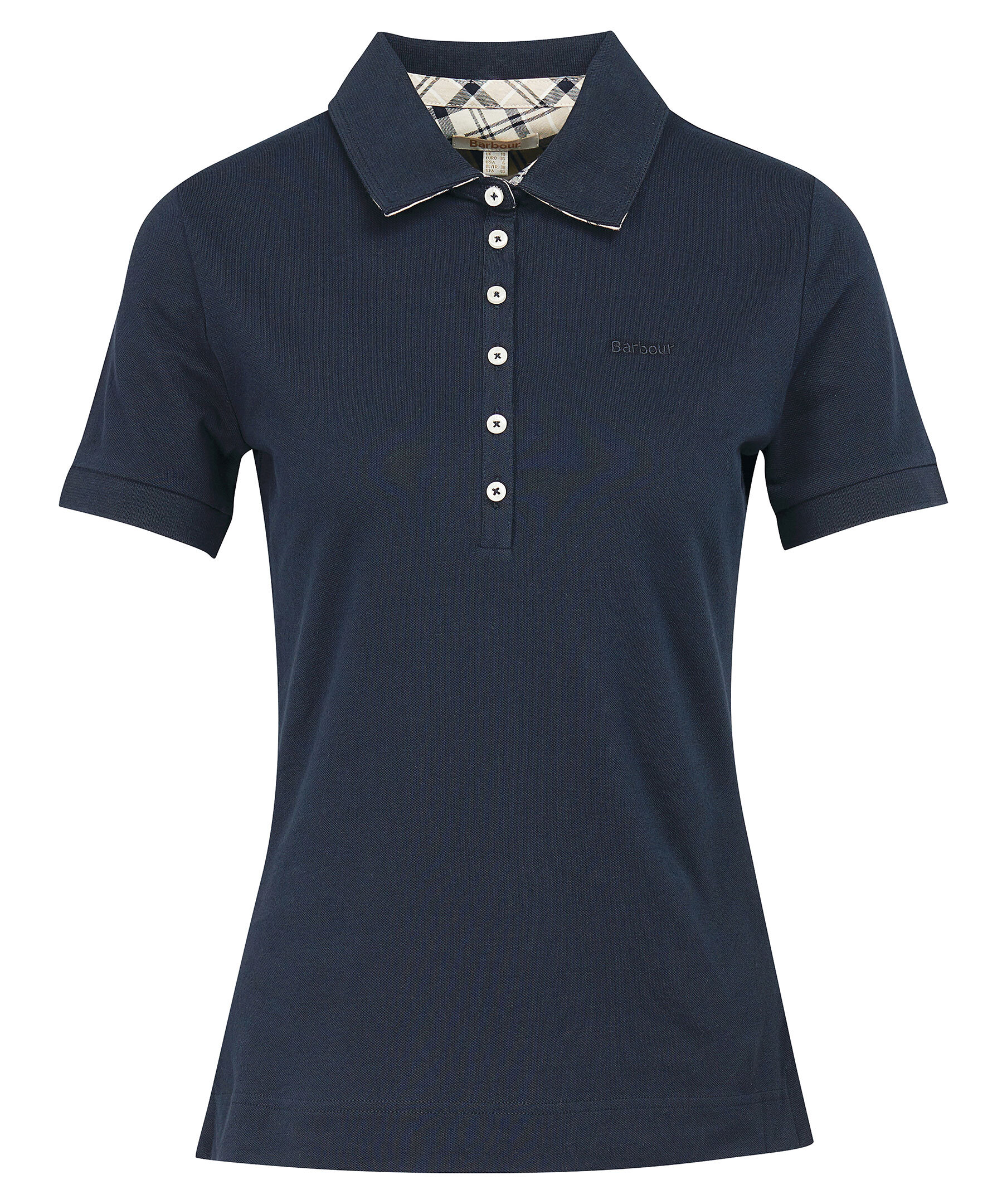 Marinblå, klassisk pikétröja i en feminin passform från Barbour. Tillverkad av ett mjuk stretchigt bomulltyg. Krage med rutigt tartan-mönster undertill som även finns under knappslån som syns när man öppnar upp den djupa knäppningen som har sex vita knappar fram. Ribbad kant i ärmsluten och en tonalt broderad Barbour-logga på vänster sida av bröstet.