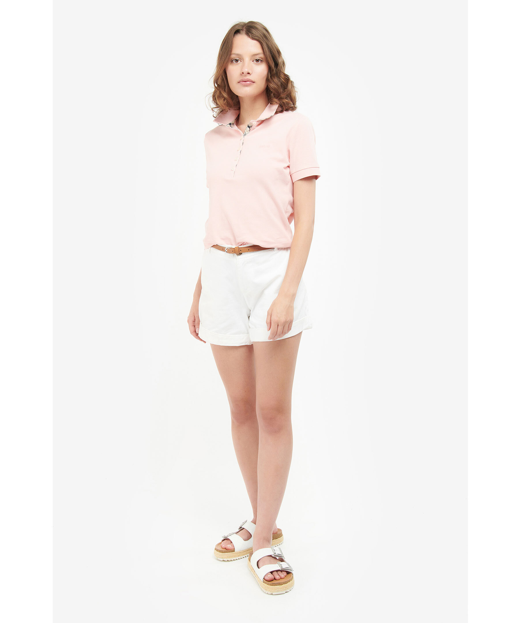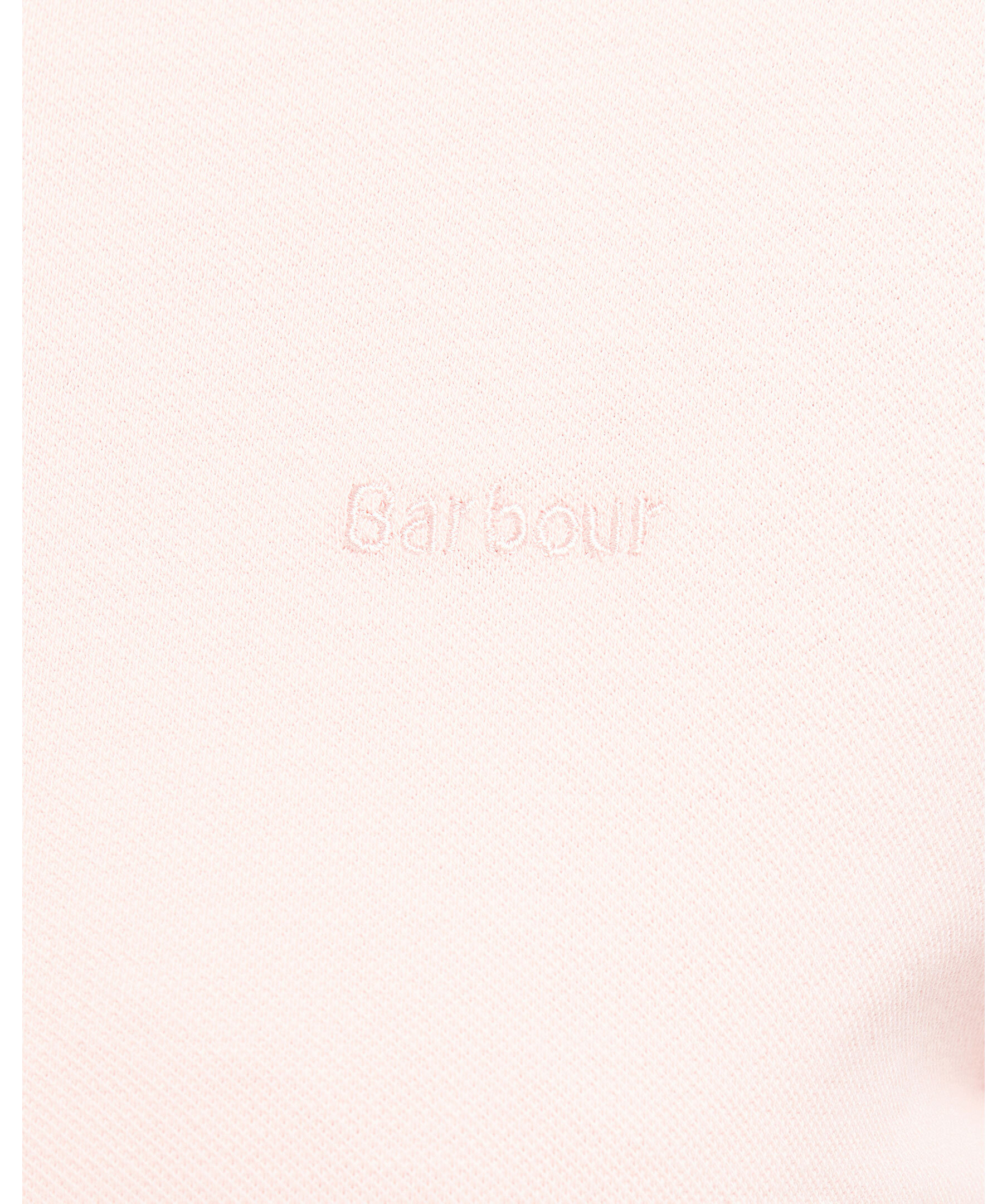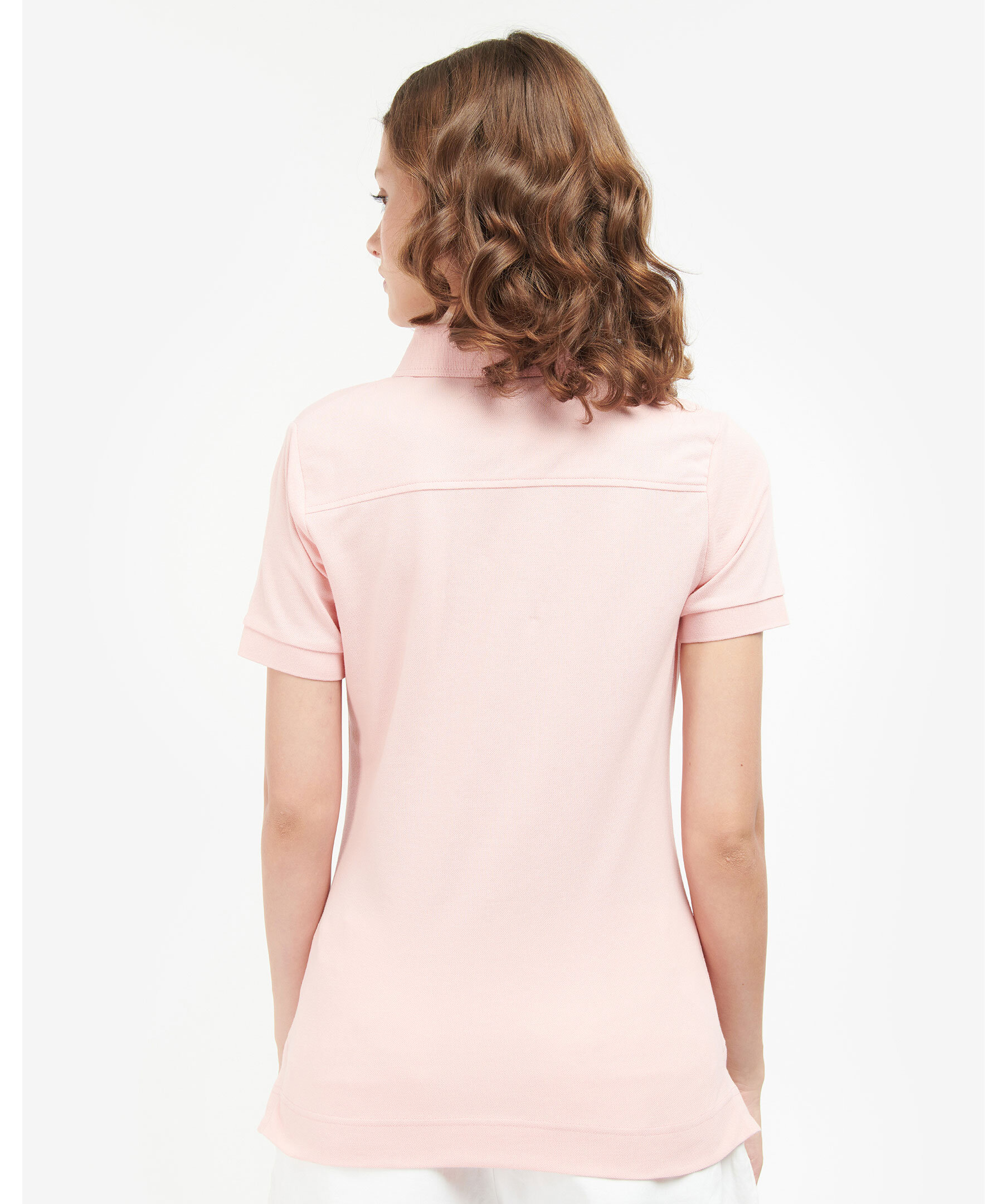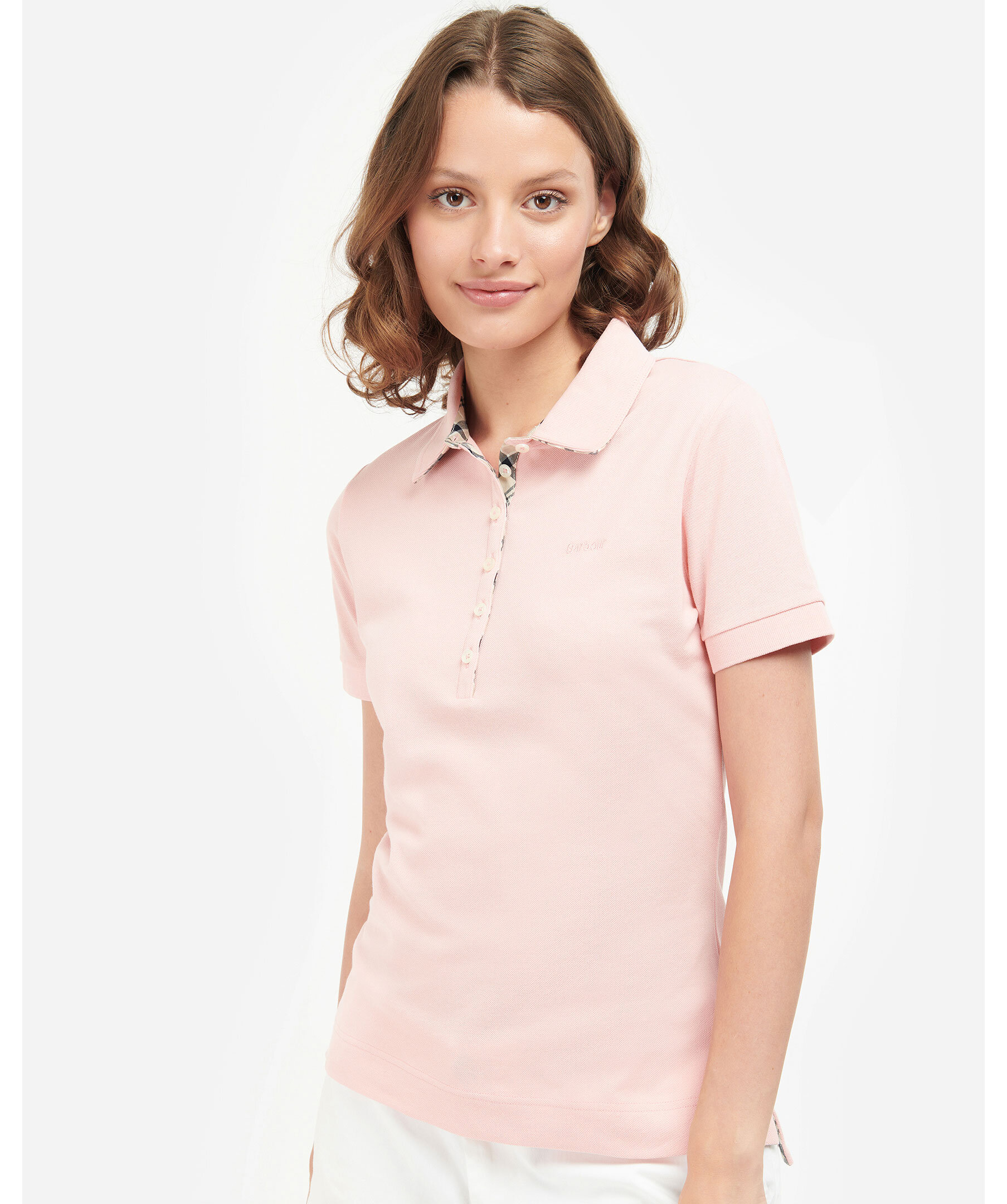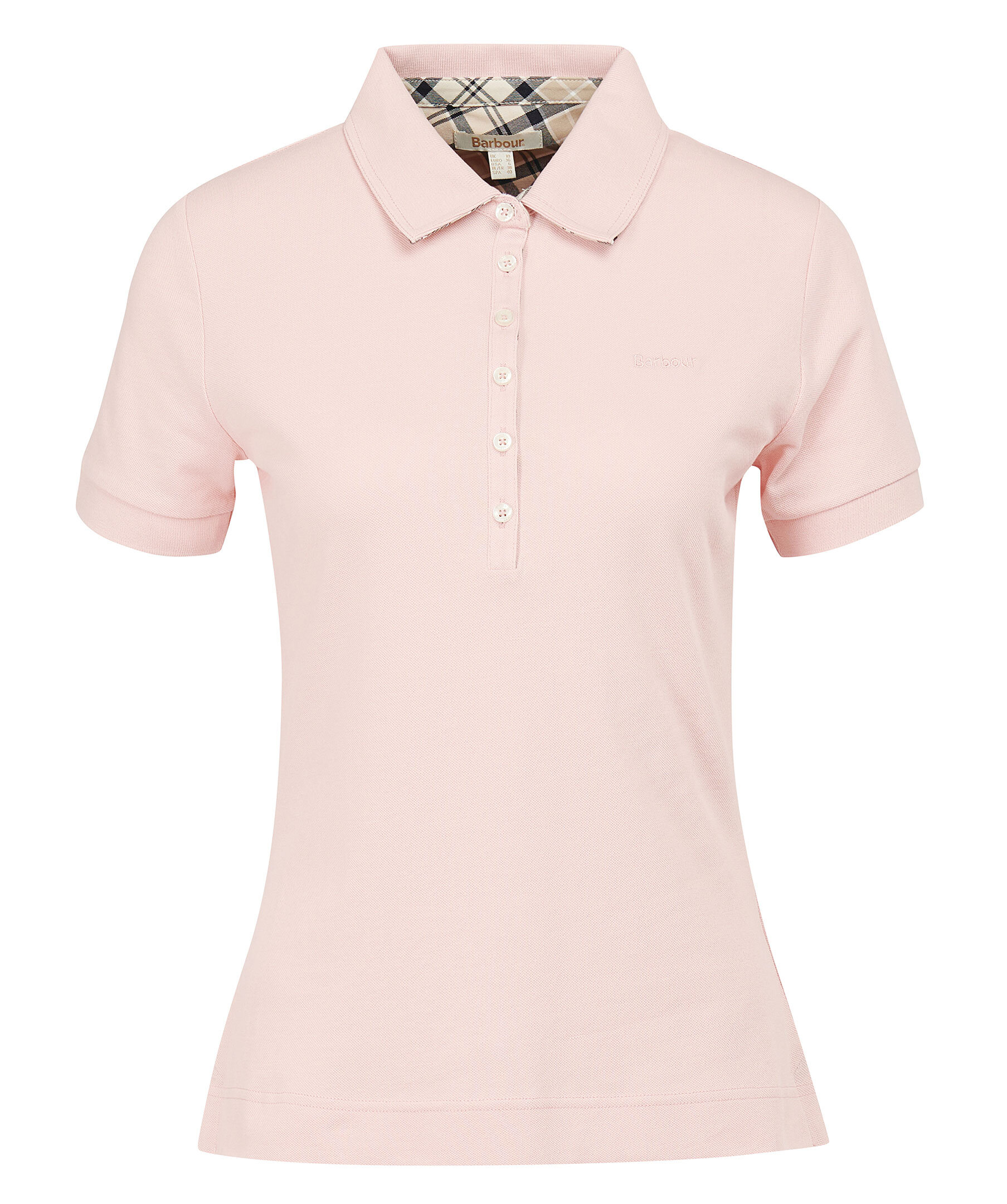 Rosa, klassisk pikétröja i en feminin passform från Barbour. Tillverkad av ett mjuk stretchigt bomulltyg. Krage med rutigt tartan-mönster undertill som även finns under knappslån som syns när man öppnar upp den djupa knäppningen som har sex vita knappar fram. Ribbad kant i ärmsluten och en tonalt broderad Barbour-logga på vänster sida av bröstet.
