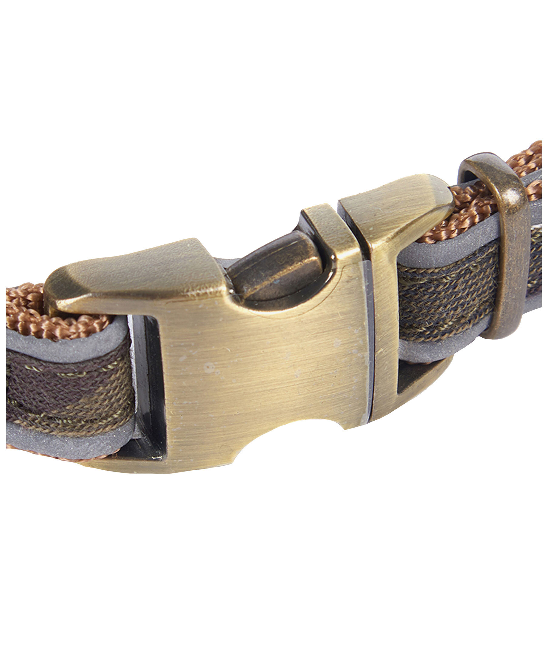 Hundhalsband från Barbour. Klassiskt, grönt mönster med reflex på kanterna. Den är helt justerbar och fästs med ett märkeslås. Tillverkad i polypropen och bomull. Liten, brun patch i läder med logotyp på utsidan.