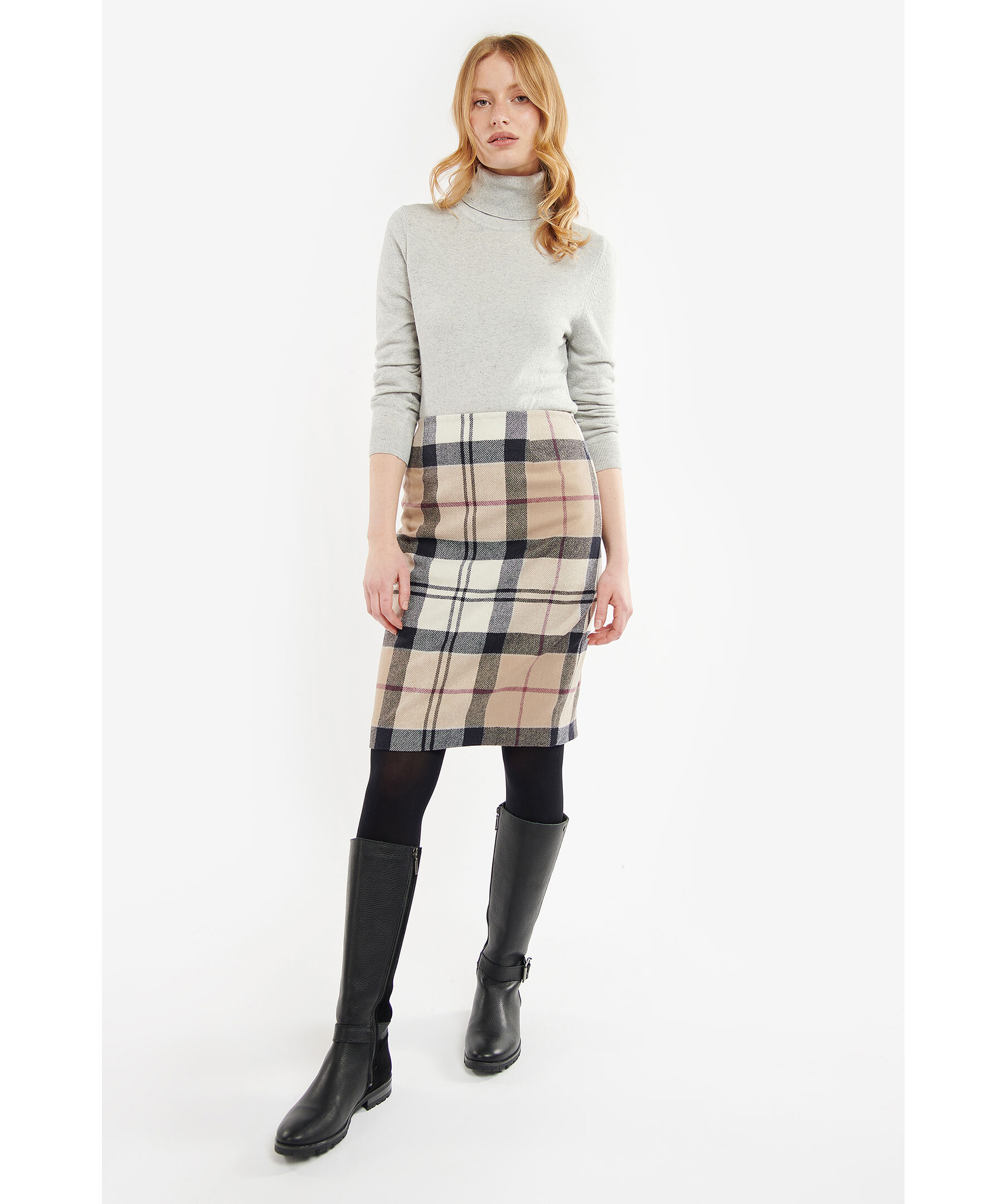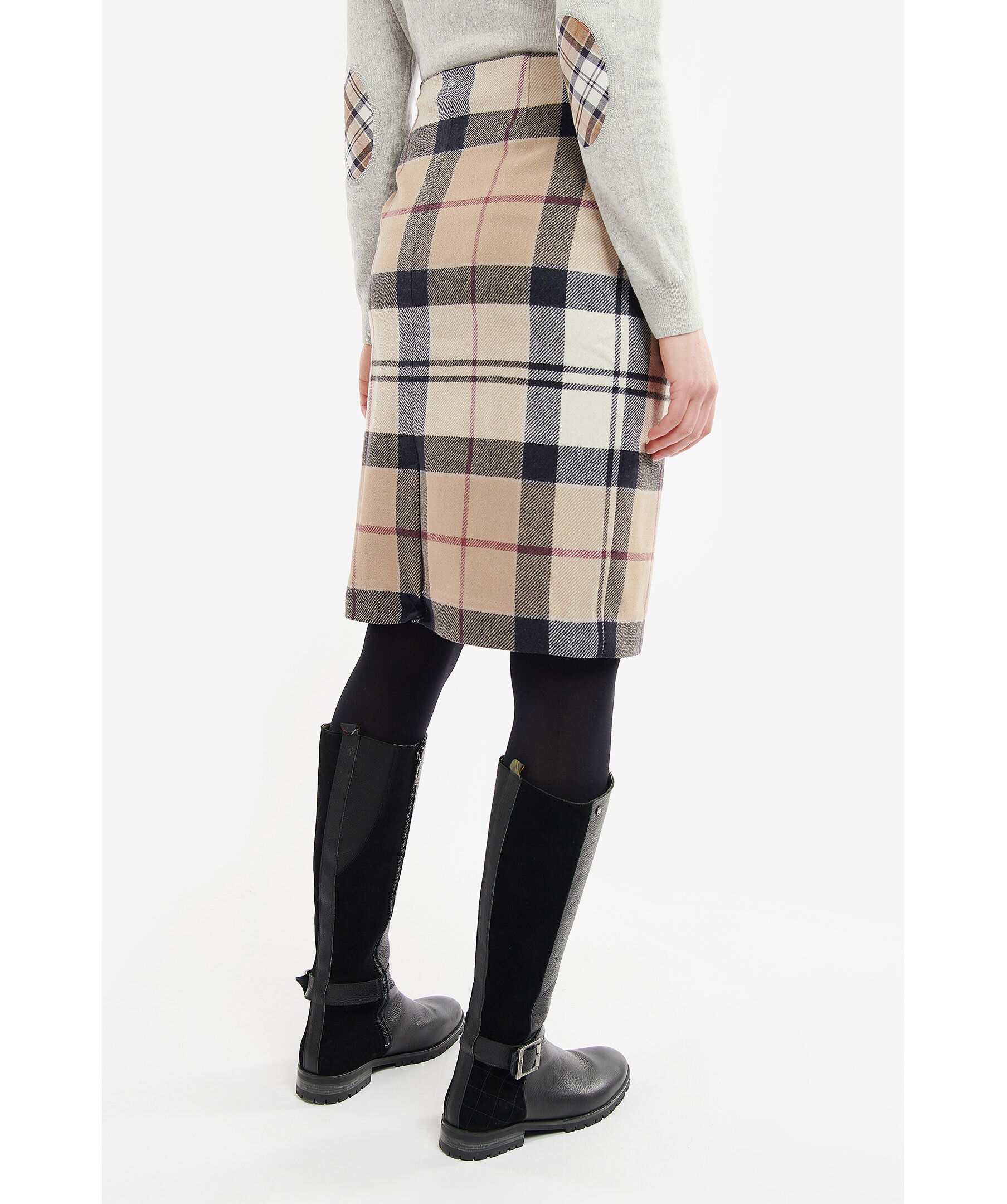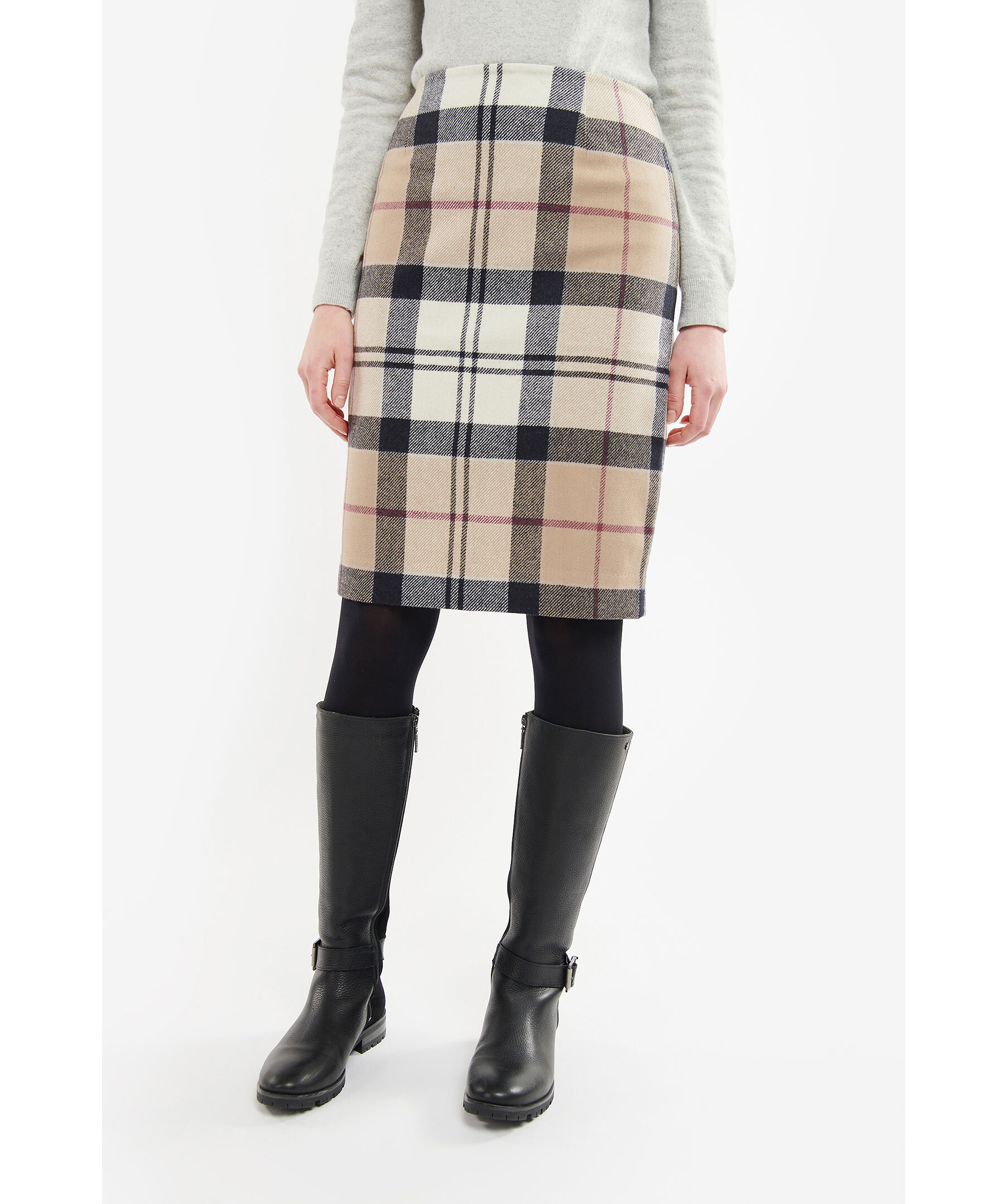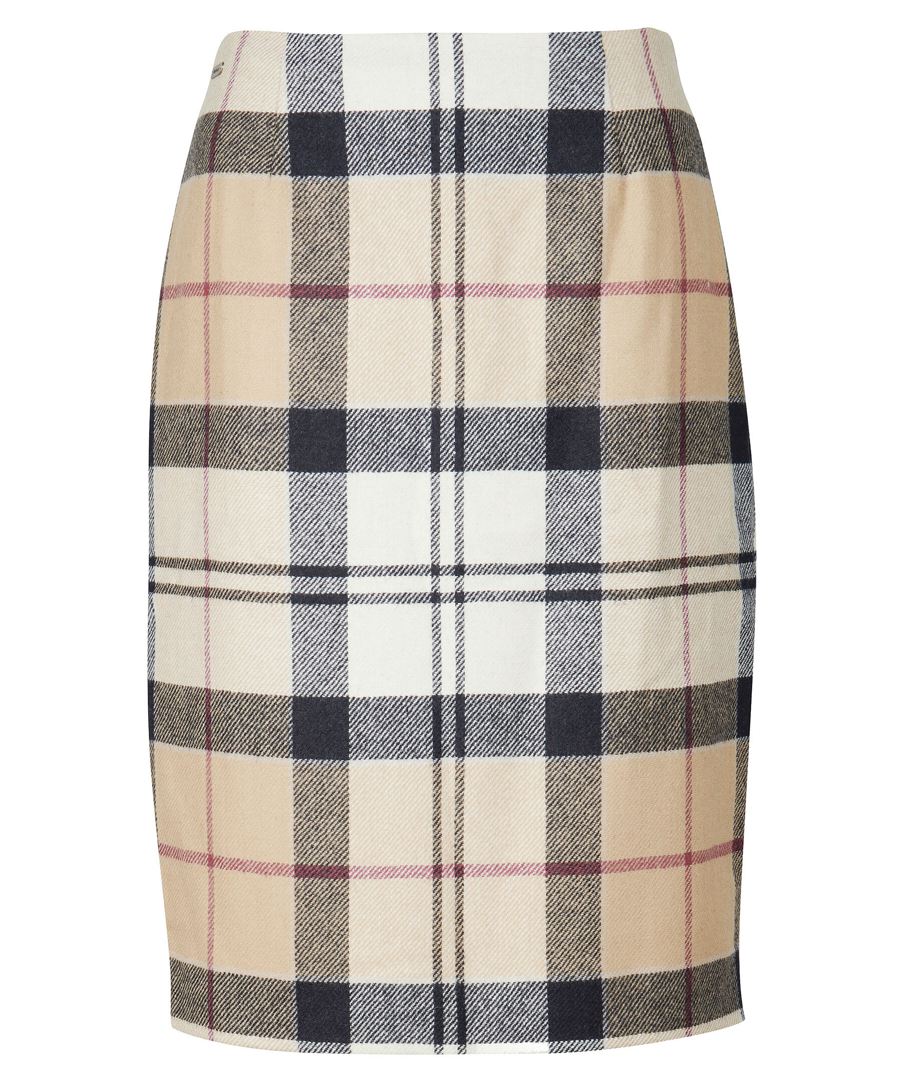 Beige, svart och röd tartanmönstrad kjol från Barbour. Tillverkad i 100% ull. Guldfärgad bricka med stansad logotyp. Kjolen är designad för att sluta strax över knäna.
