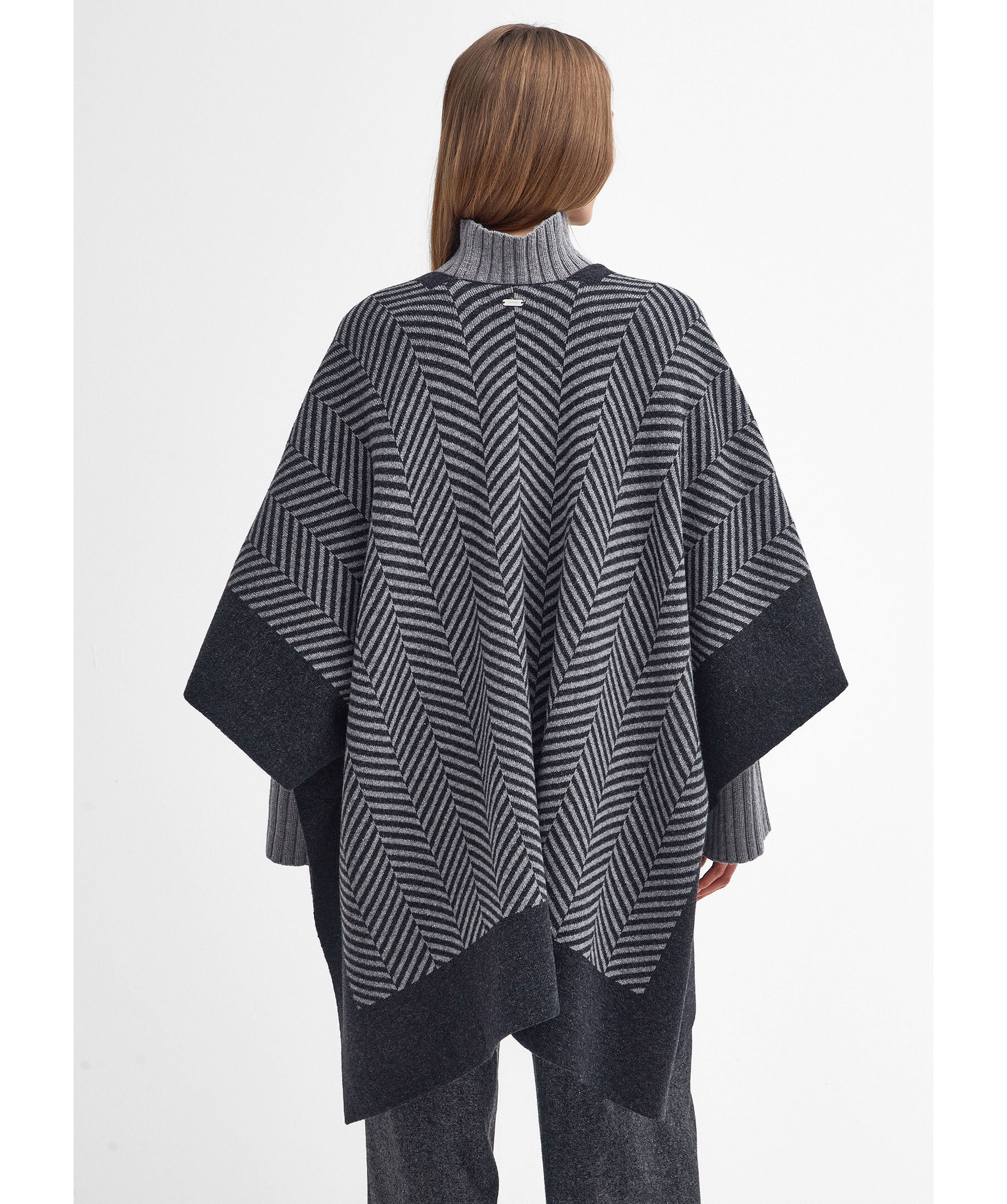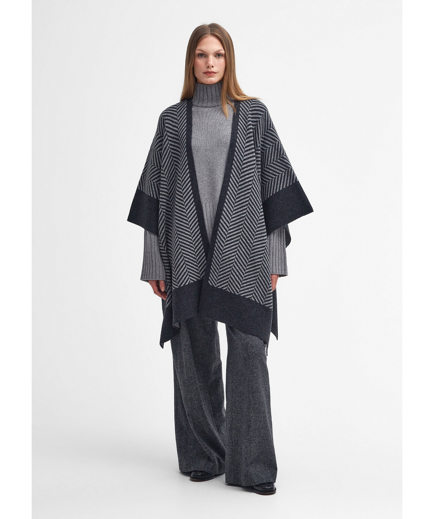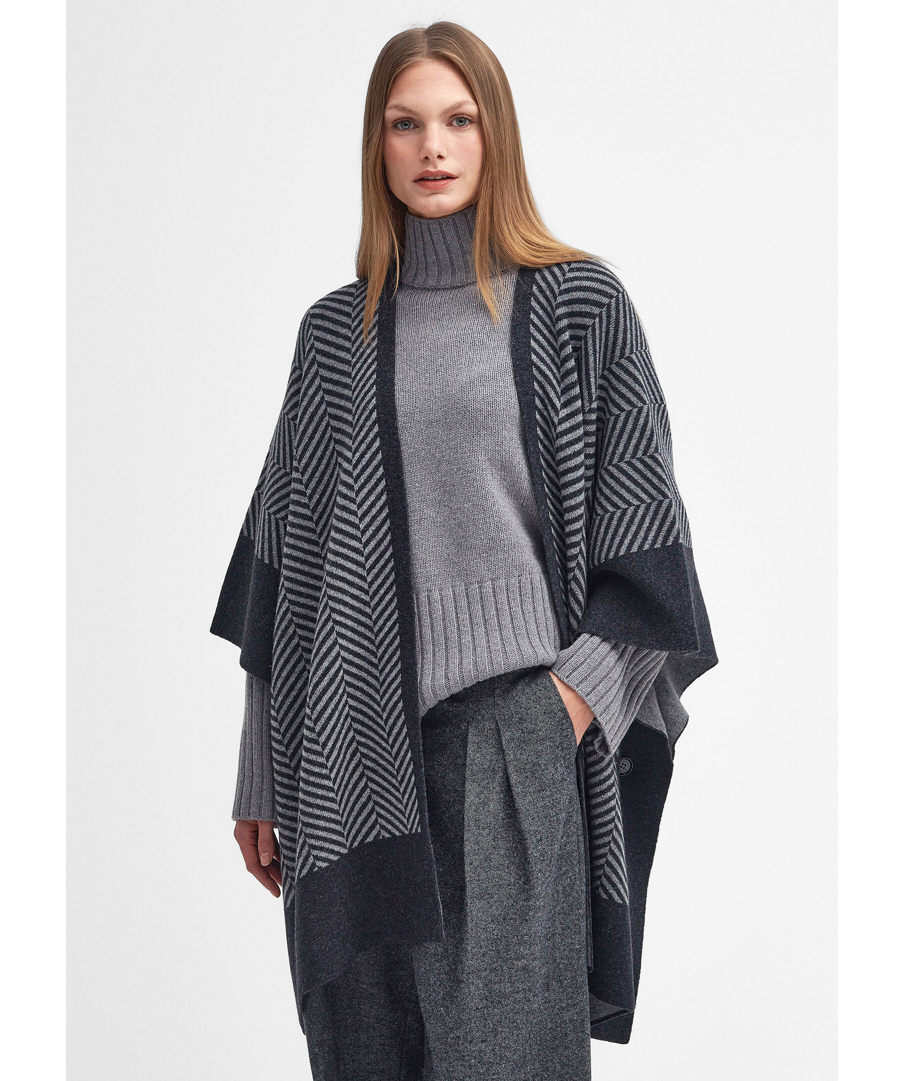 Grå och svart mönstrad poncho från Barbour. Denna stickade ponchon har en jacquard-chevrondesign, sidoknappsfästning och logotyp i nacken. Tillverkad i en ullblandning.