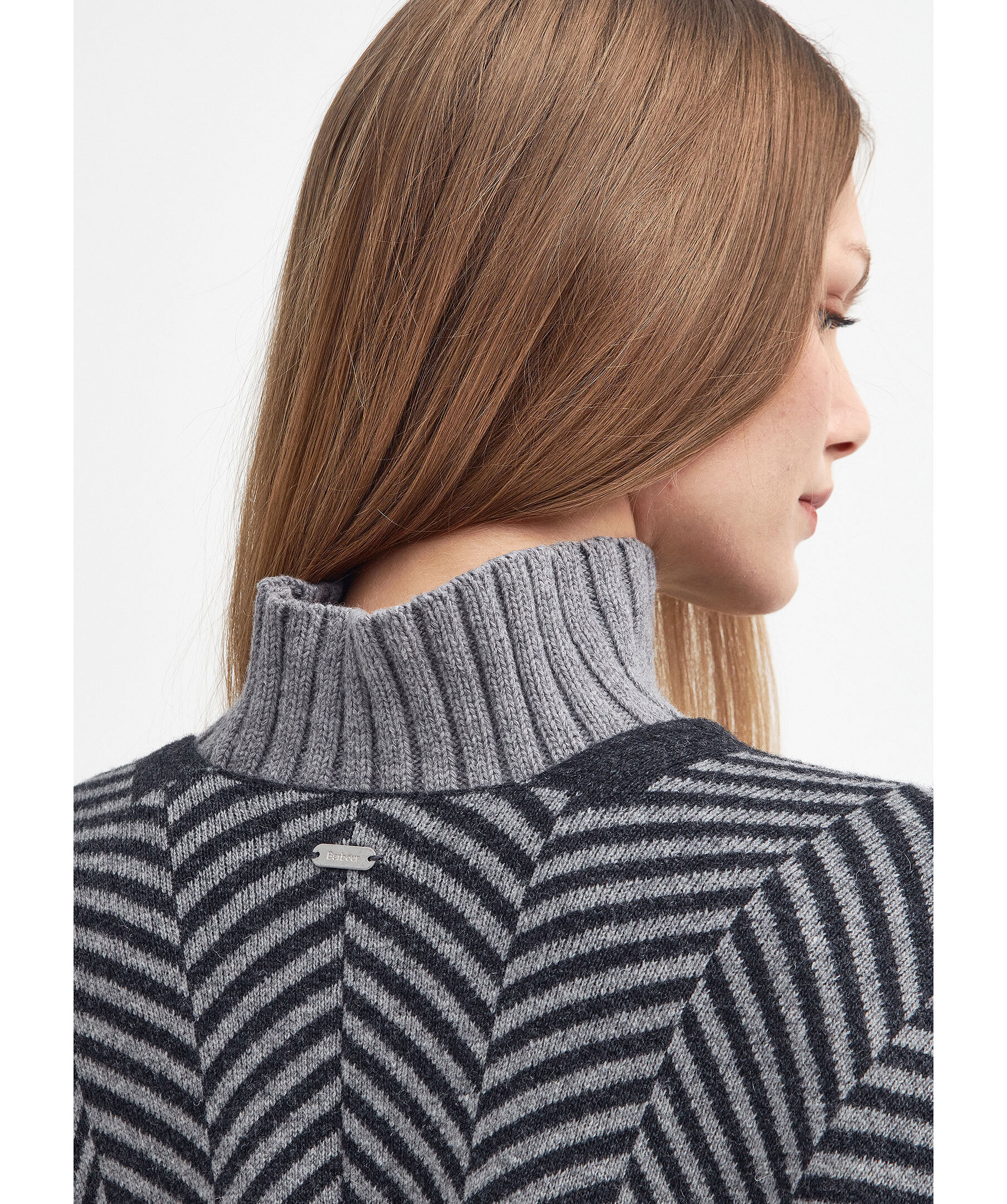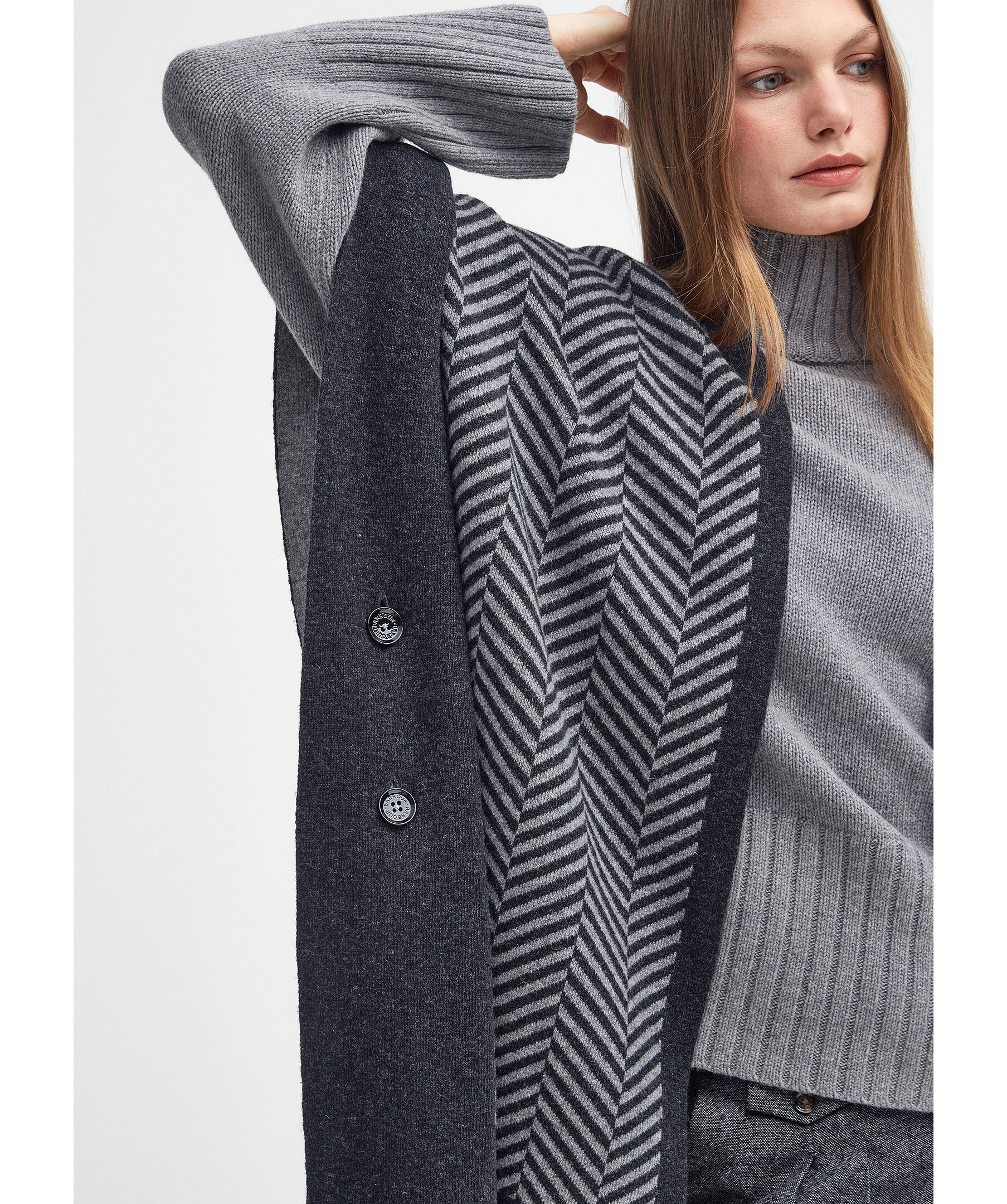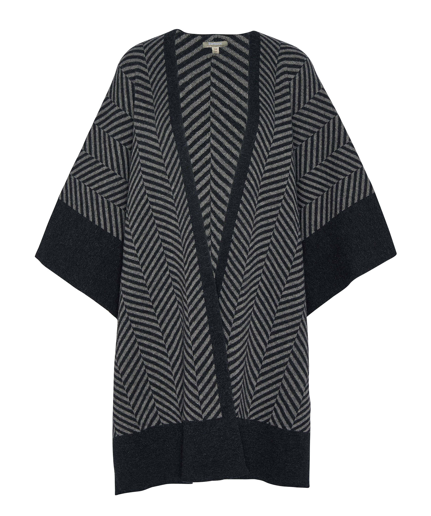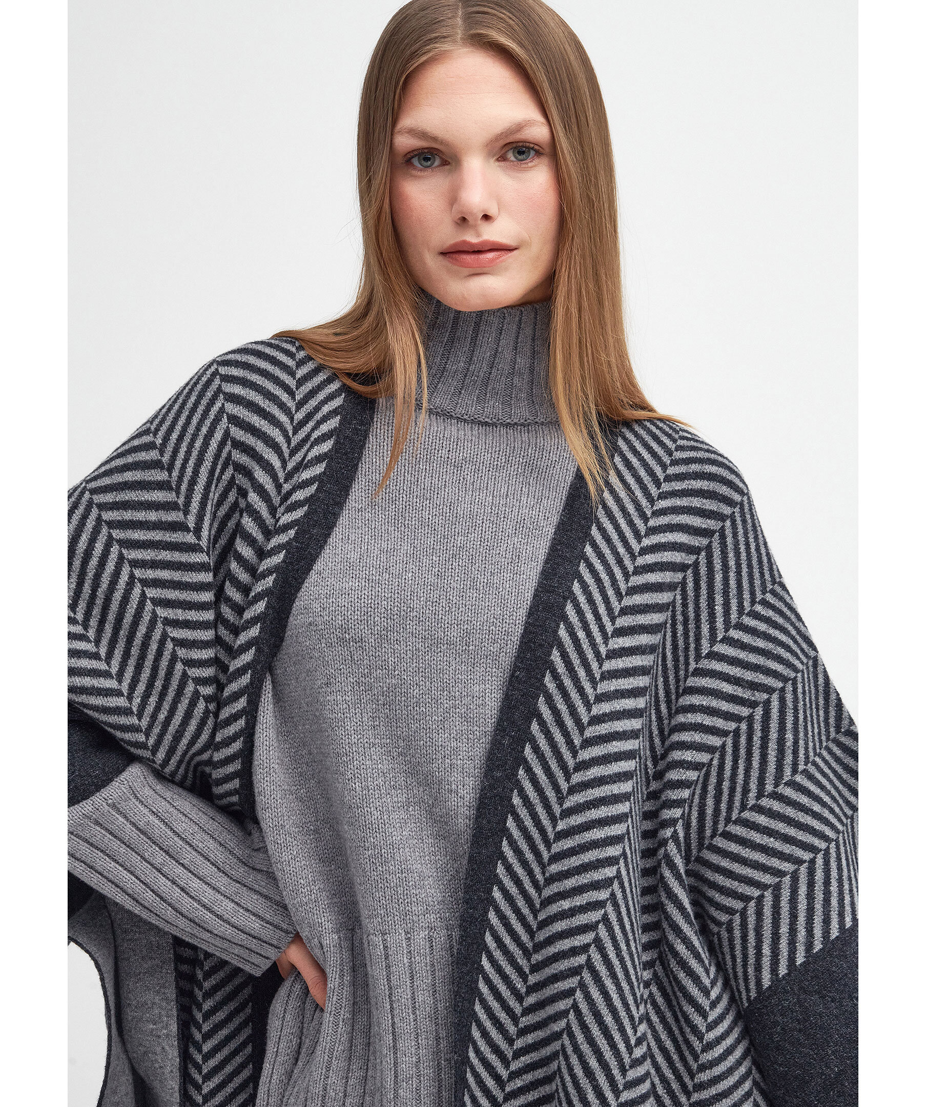 Grå och svart mönstrad poncho från Barbour. Denna stickade ponchon har en jacquard-chevrondesign, sidoknappsfästning och logotyp i nacken. Tillverkad i en ullblandning.