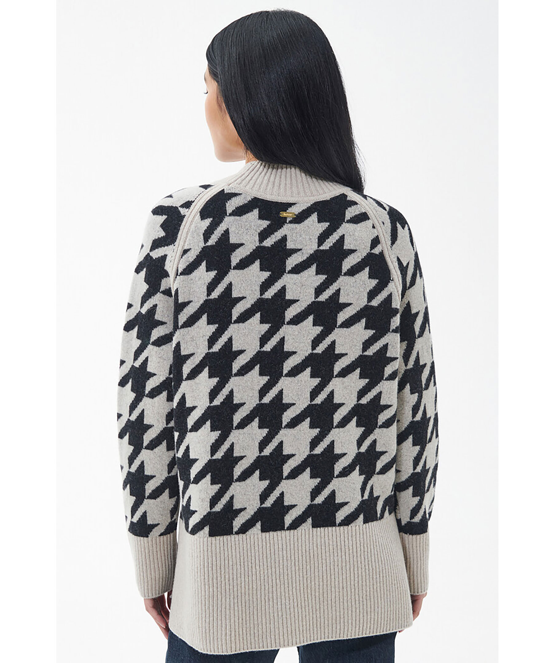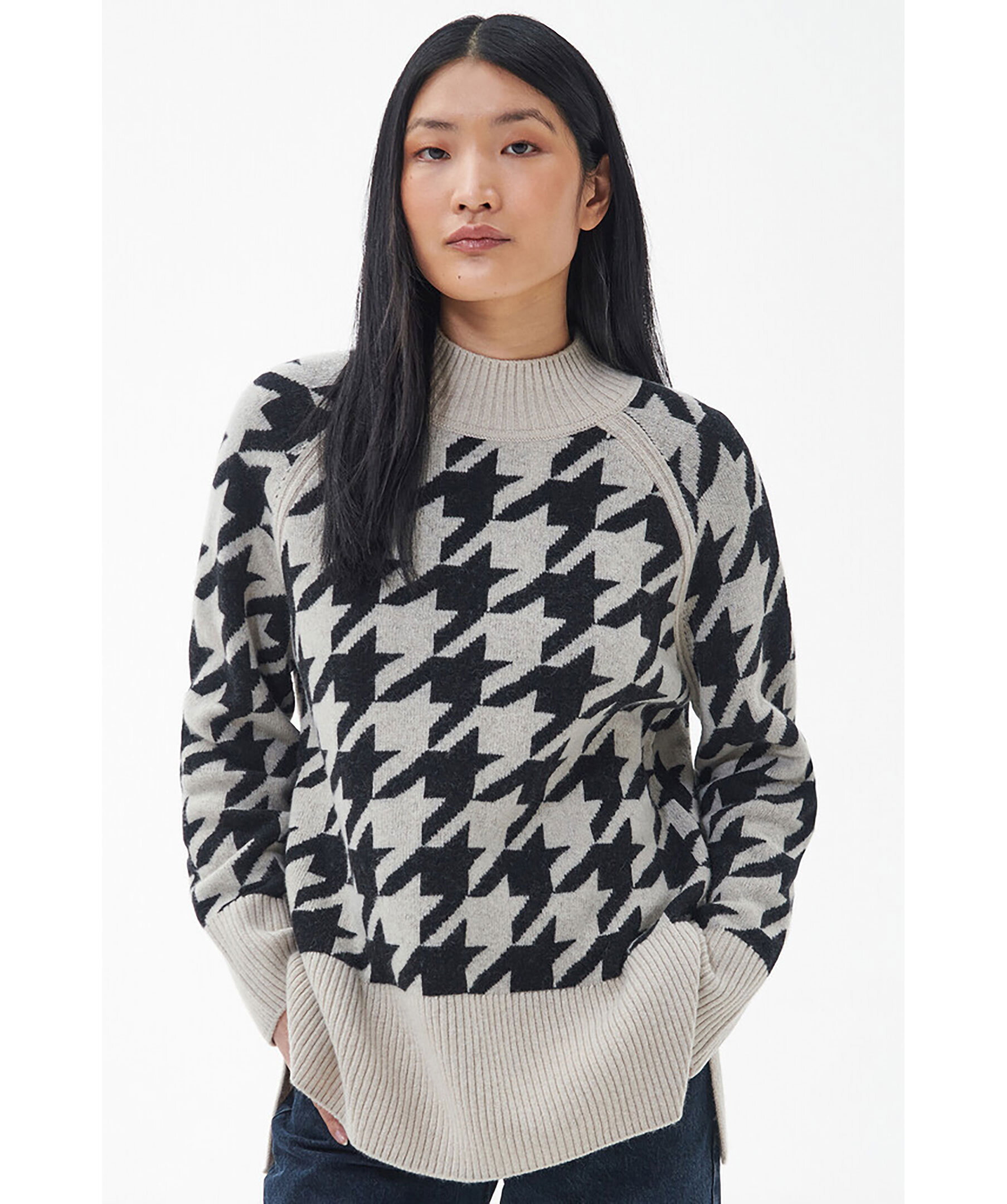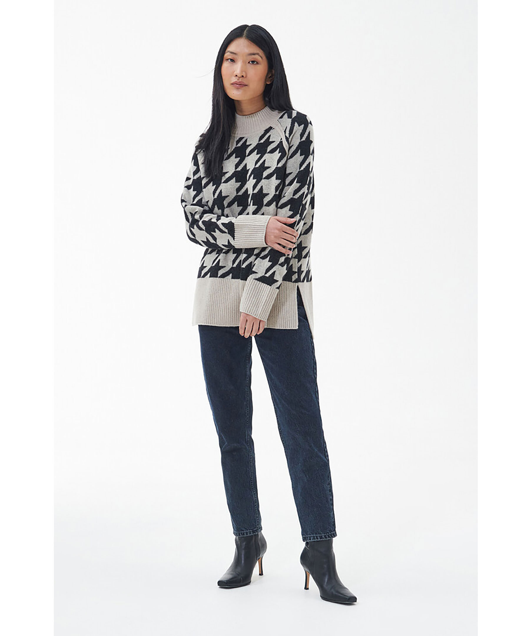 Beige stickad tröja från Barbour. Högre ribbstickad hals, ribbstickade muddar vid ärm- och plaggslut. Tröjan har en fairisle-design i svart. Korta slitsar vid plaggslut. Tillverkad i en ullblandning.