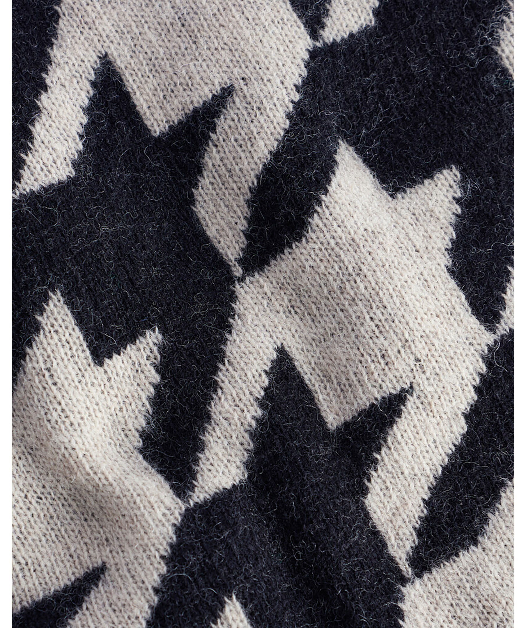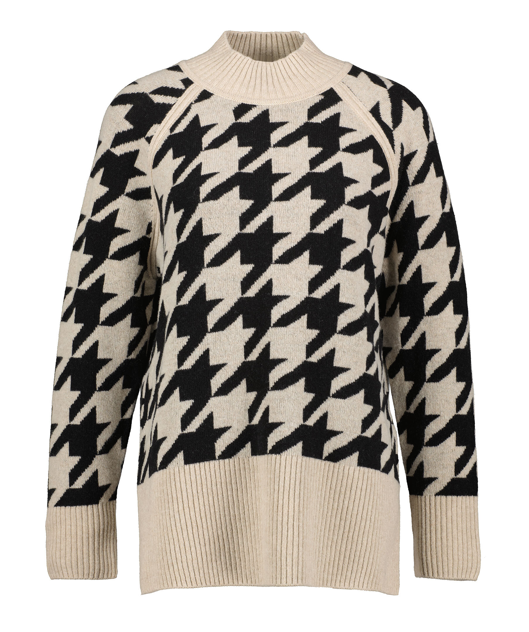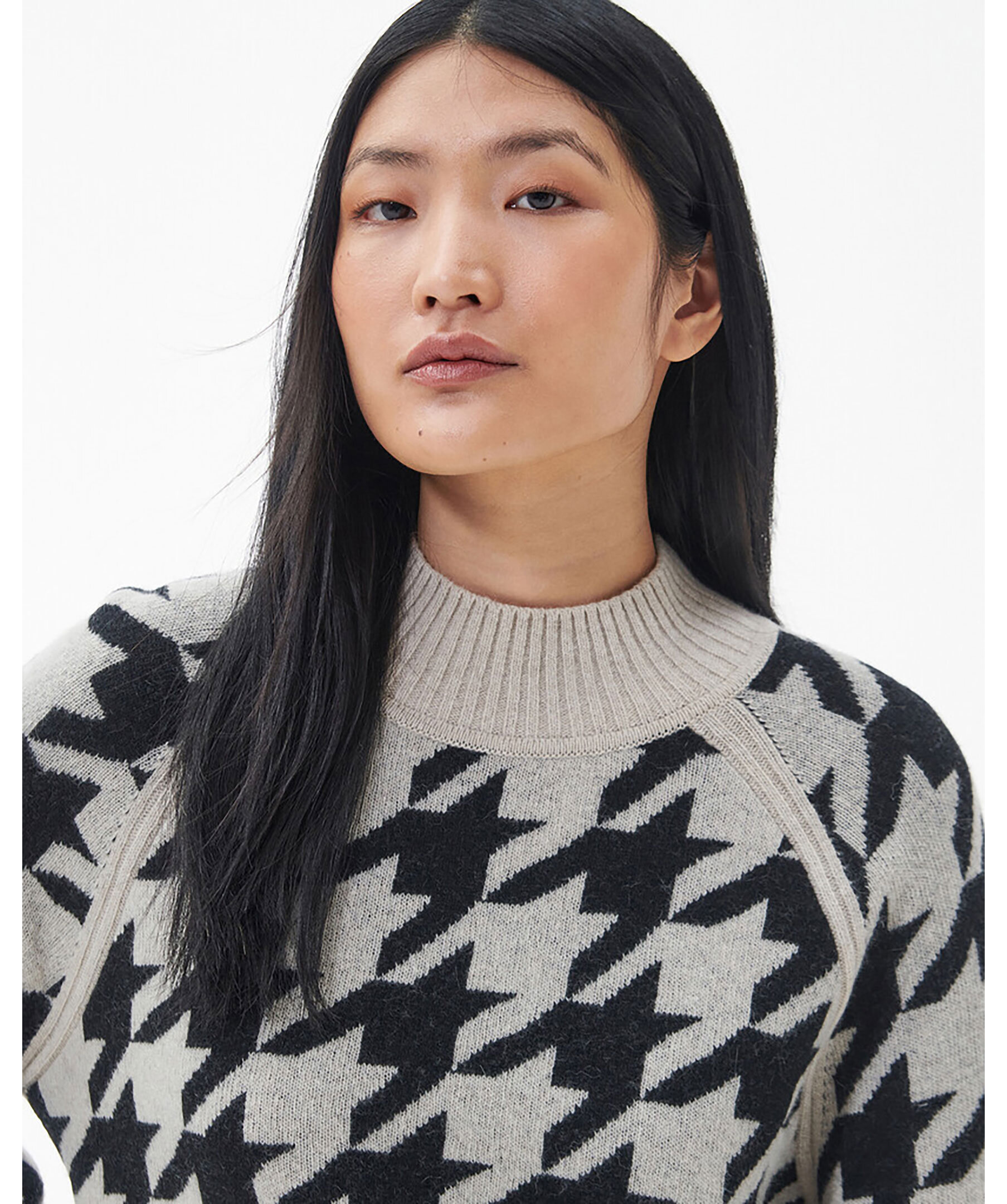 Beige stickad tröja från Barbour. Högre ribbstickad hals, ribbstickade muddar vid ärm- och plaggslut. Tröjan har en fairisle-design i svart. Korta slitsar vid plaggslut. Tillverkad i en ullblandning.