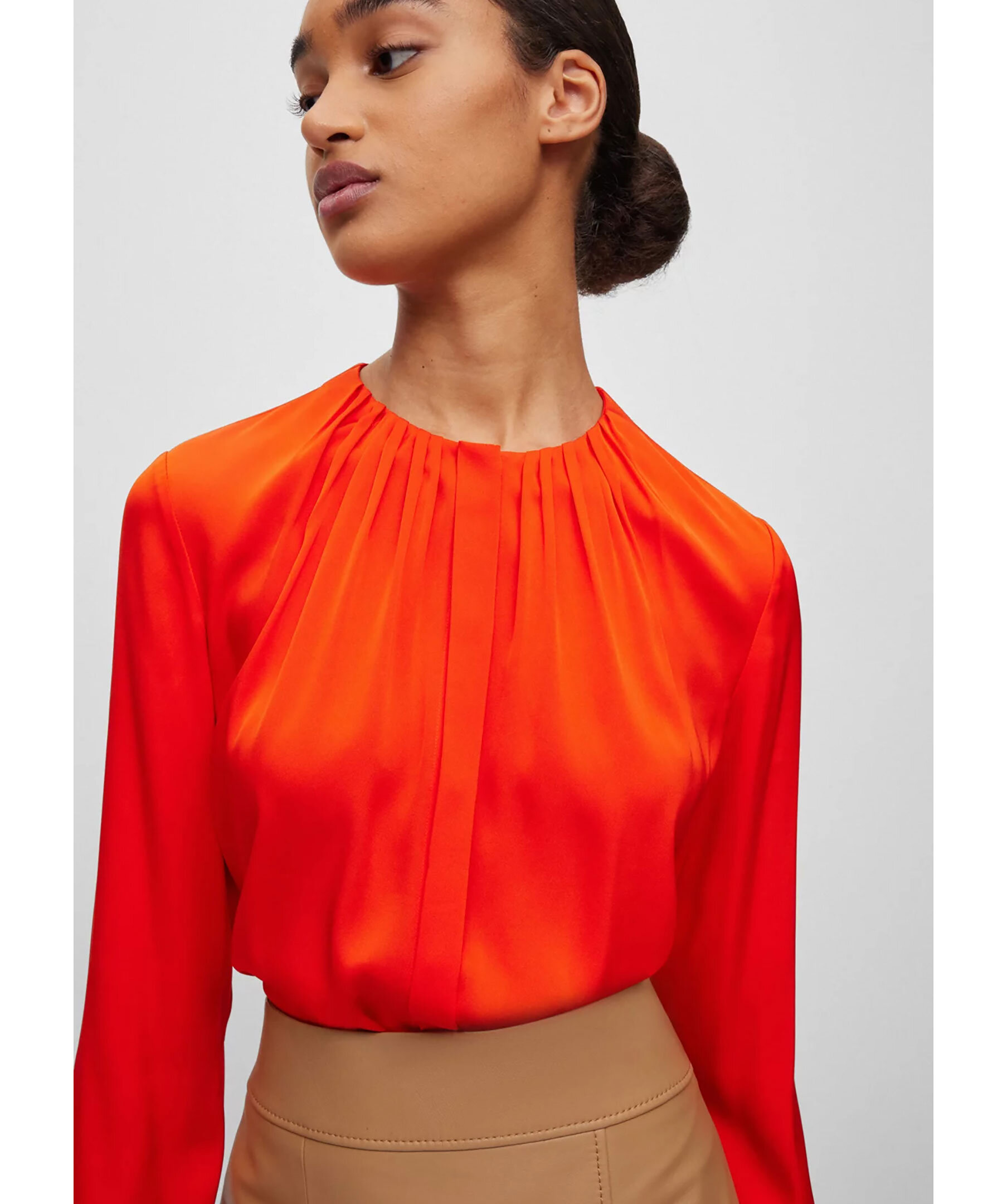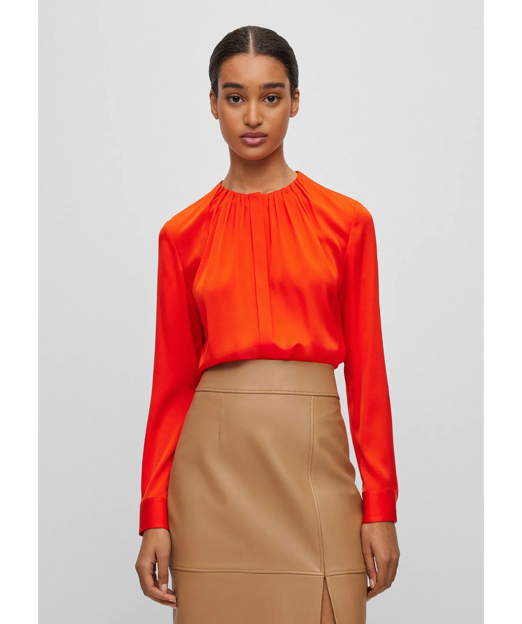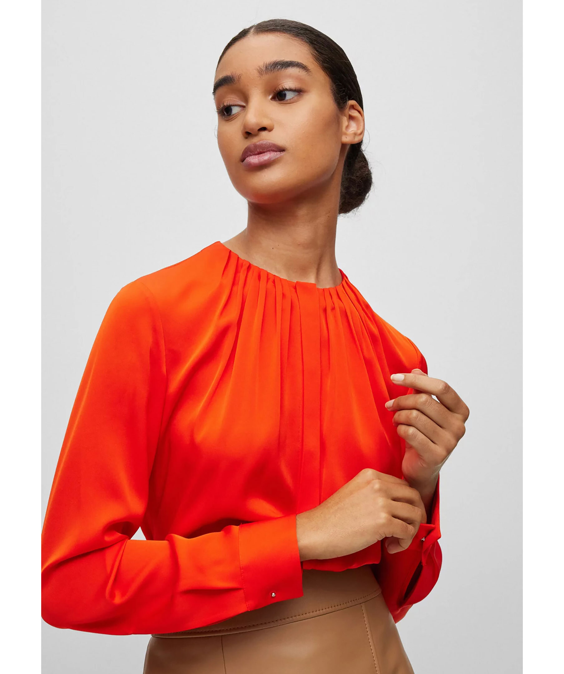 Orange blus från BOSS Black. En ogenomskinlig blus i lyxigt stretch-silke crepe de Chine från BOSS Womenswear, med rynkad halsringning, dold stängning och logga bak. Manschetter med knapp.