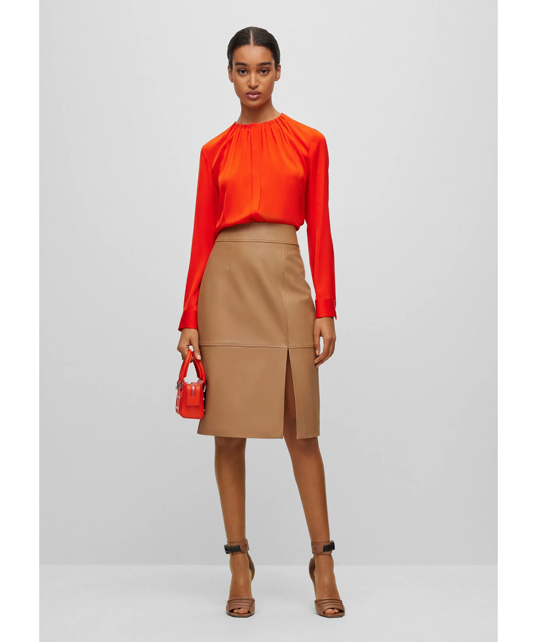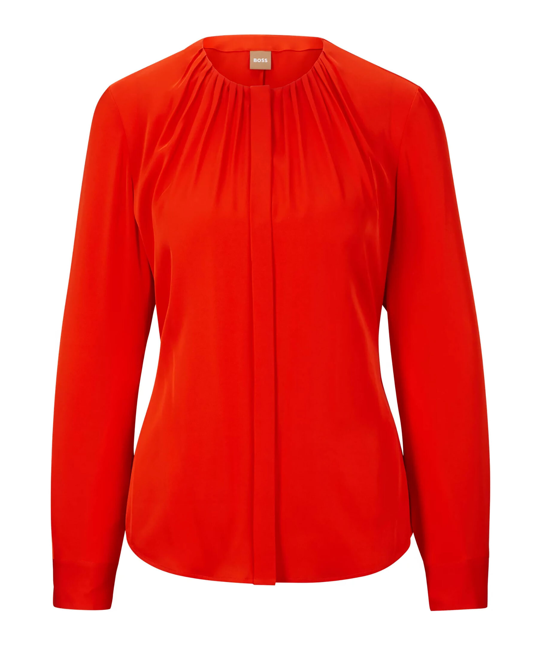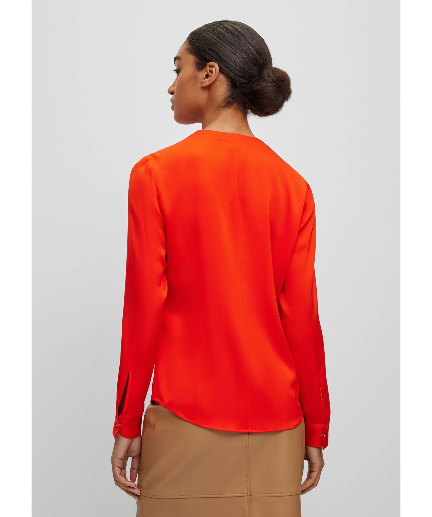 Orange blus från BOSS Black. En ogenomskinlig blus i lyxigt stretch-silke crepe de Chine från BOSS Womenswear, med rynkad halsringning, dold stängning och logga bak. Manschetter med knapp.