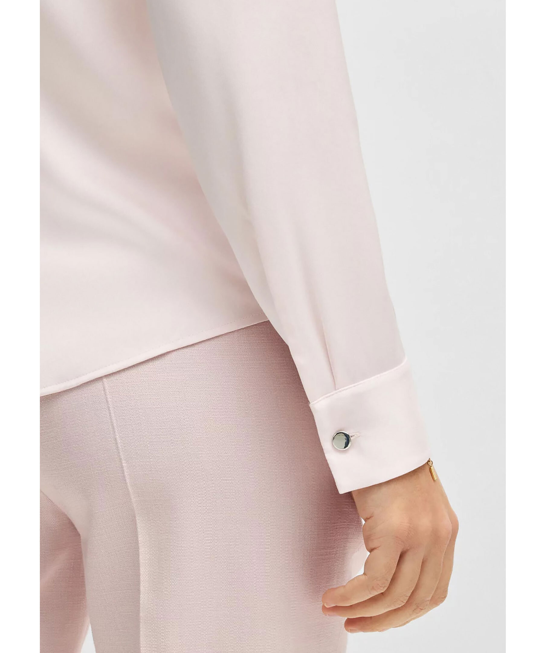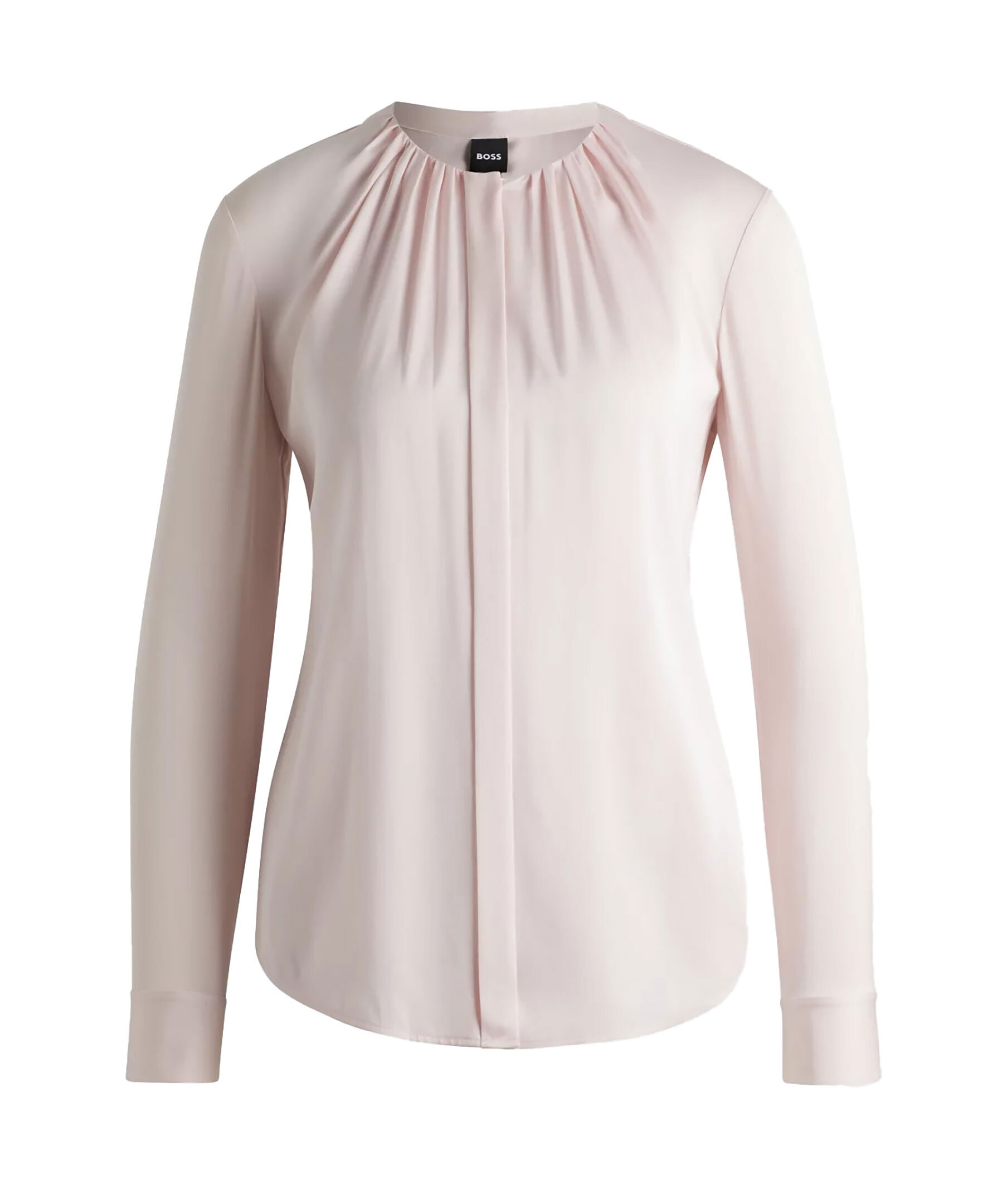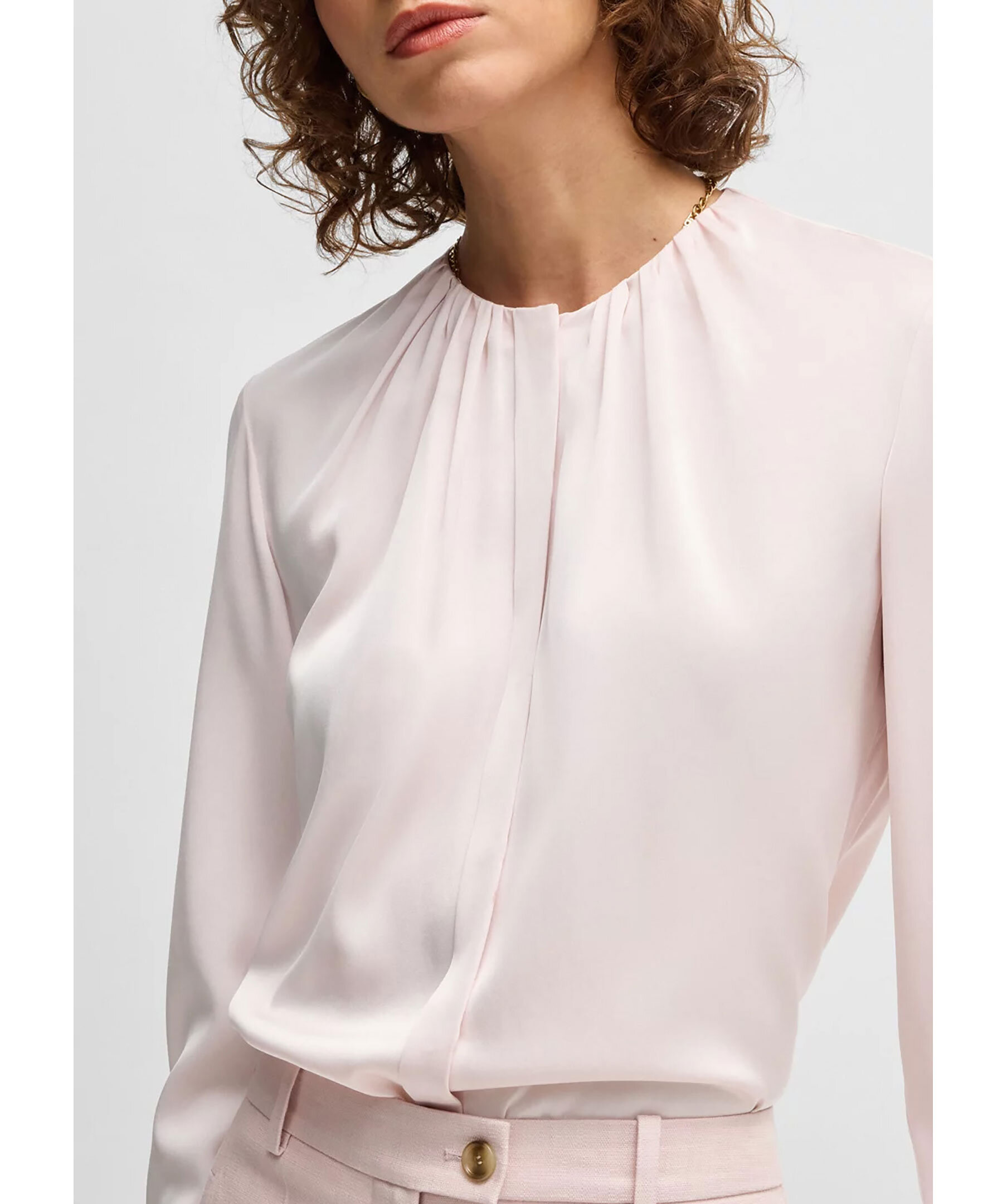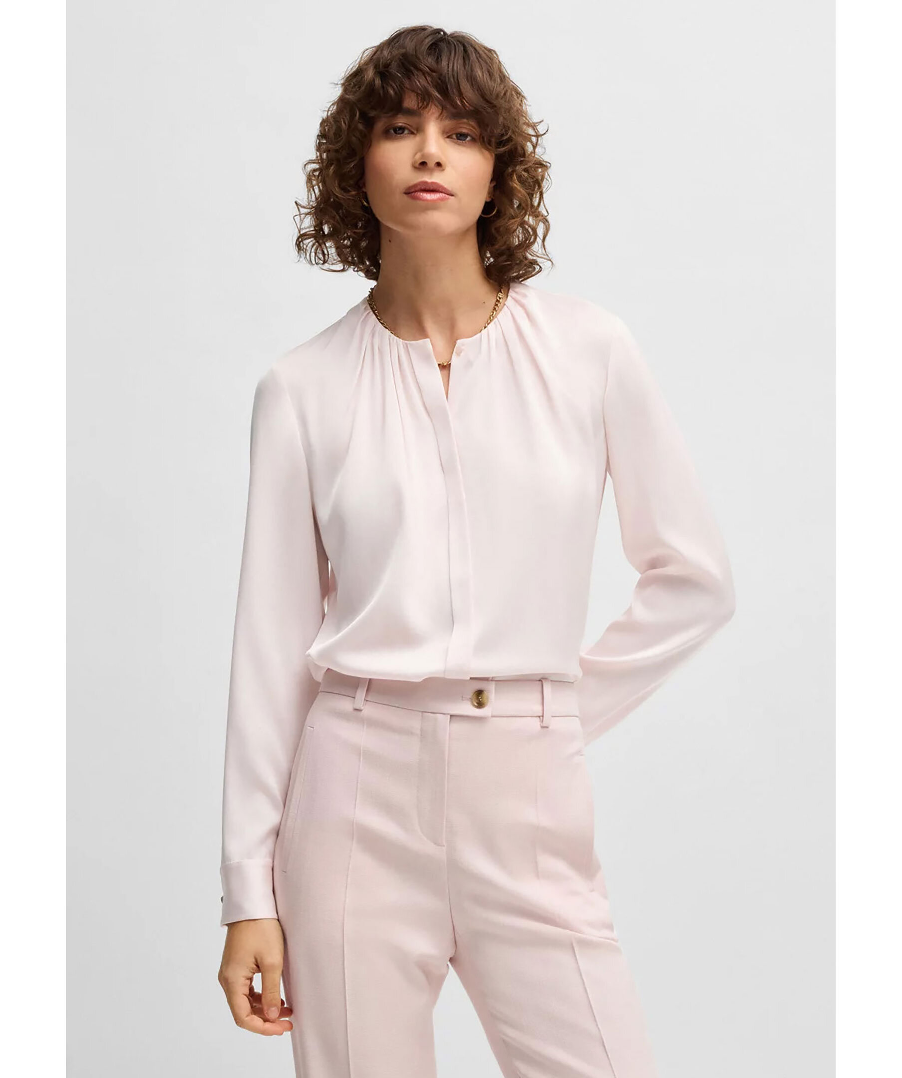 Ljusrosa blus utan krage från BOSS Black. Designad med rynkad halsringning samt dolda knappar framtill. Tillverkad i en sidenblandning.