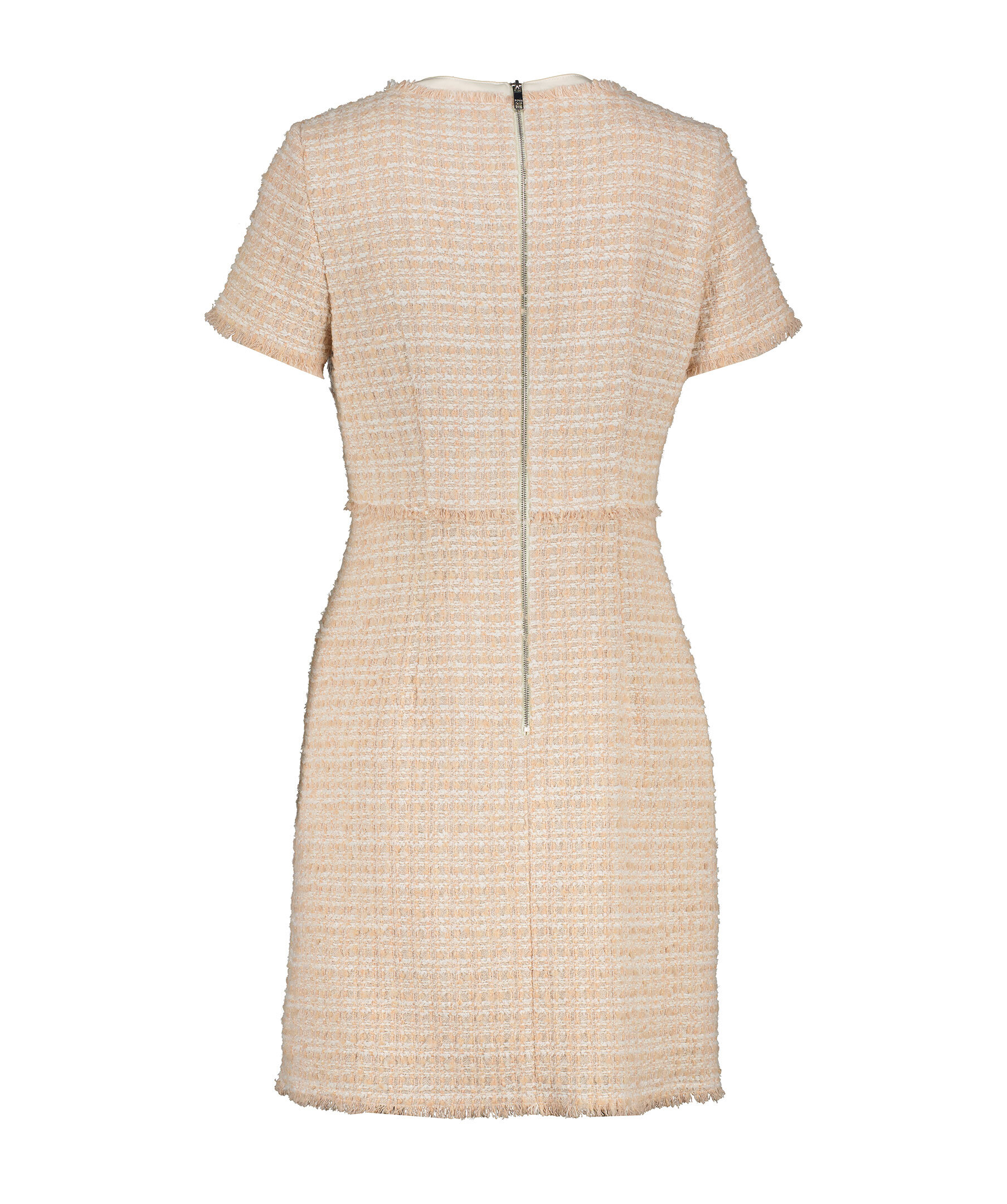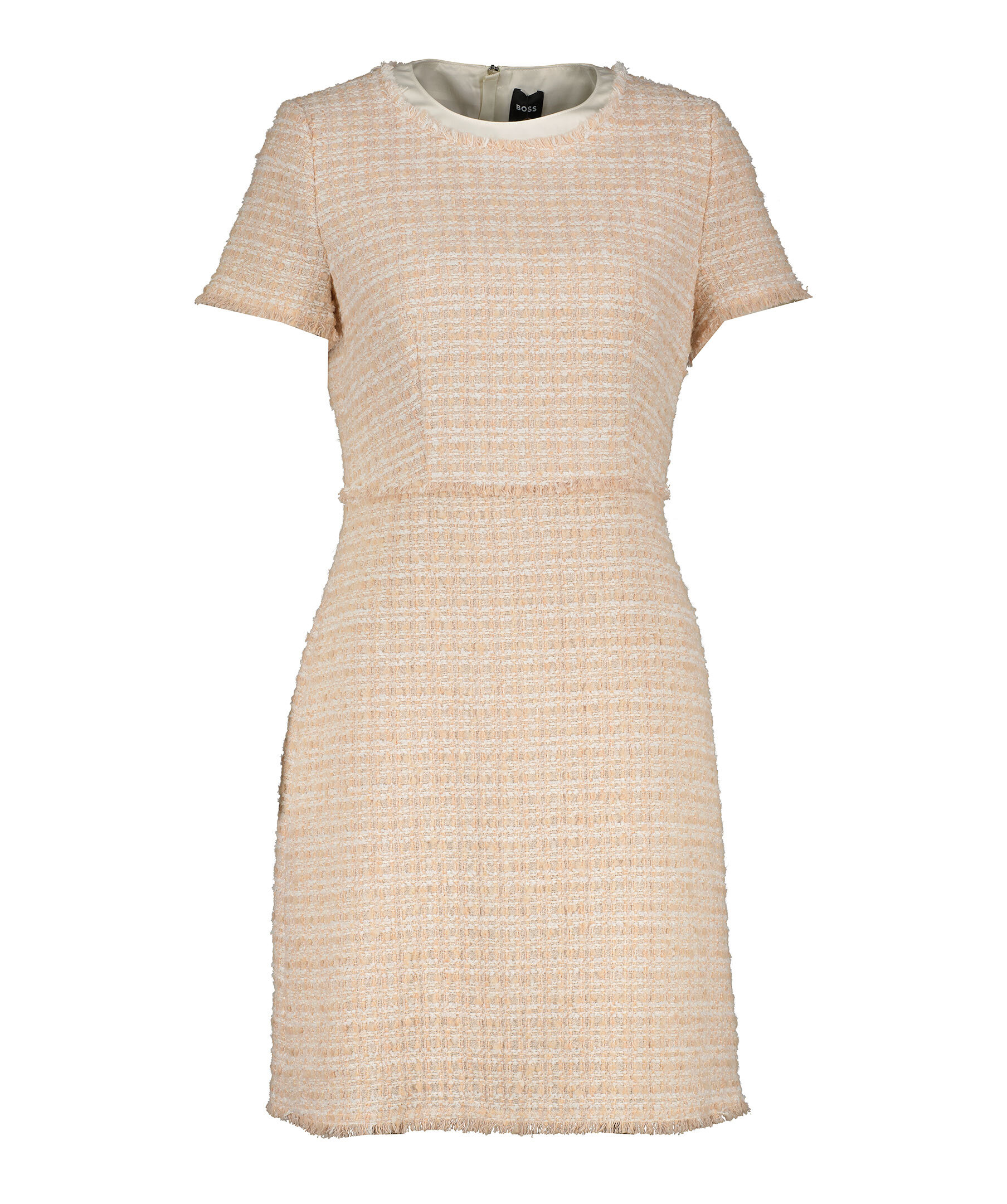 Ljusrosa, vävd klänning med korta ärmar från BOSS Black. Klänningen har rundad halsringning, dragkedja längs ryggen, foder i en polyesterblandning samt fransdetaljer. Tillverkad i en bomullsblandning.