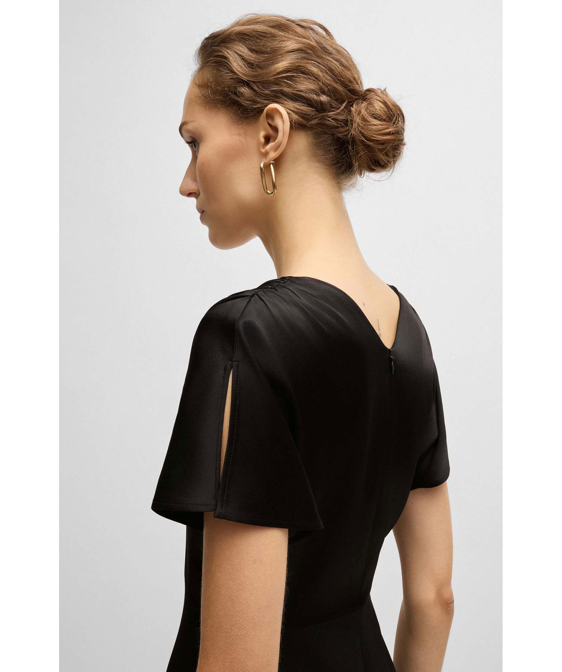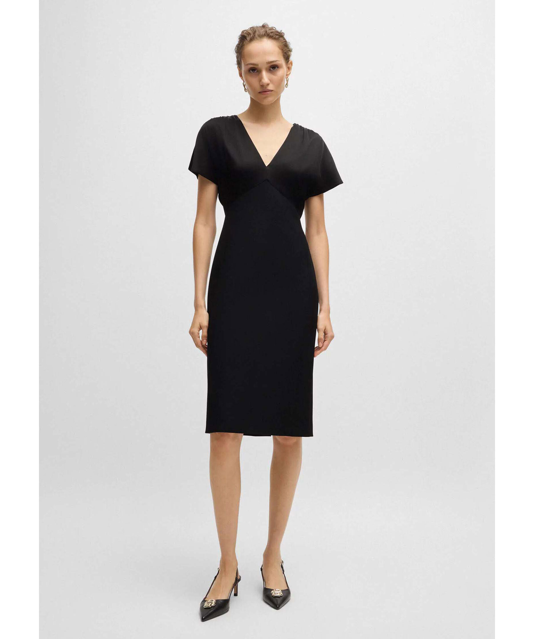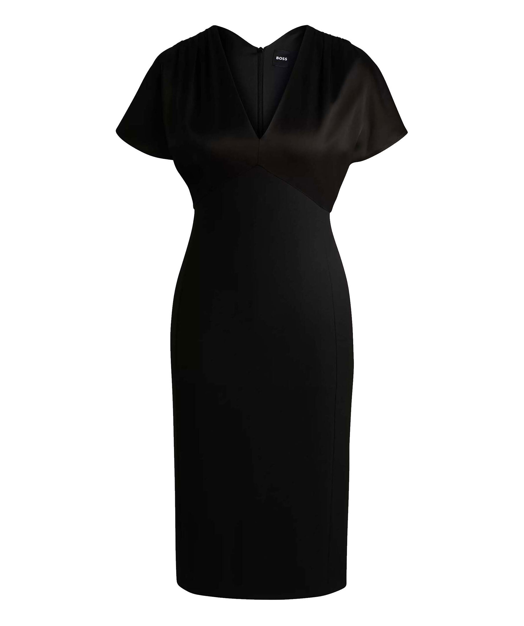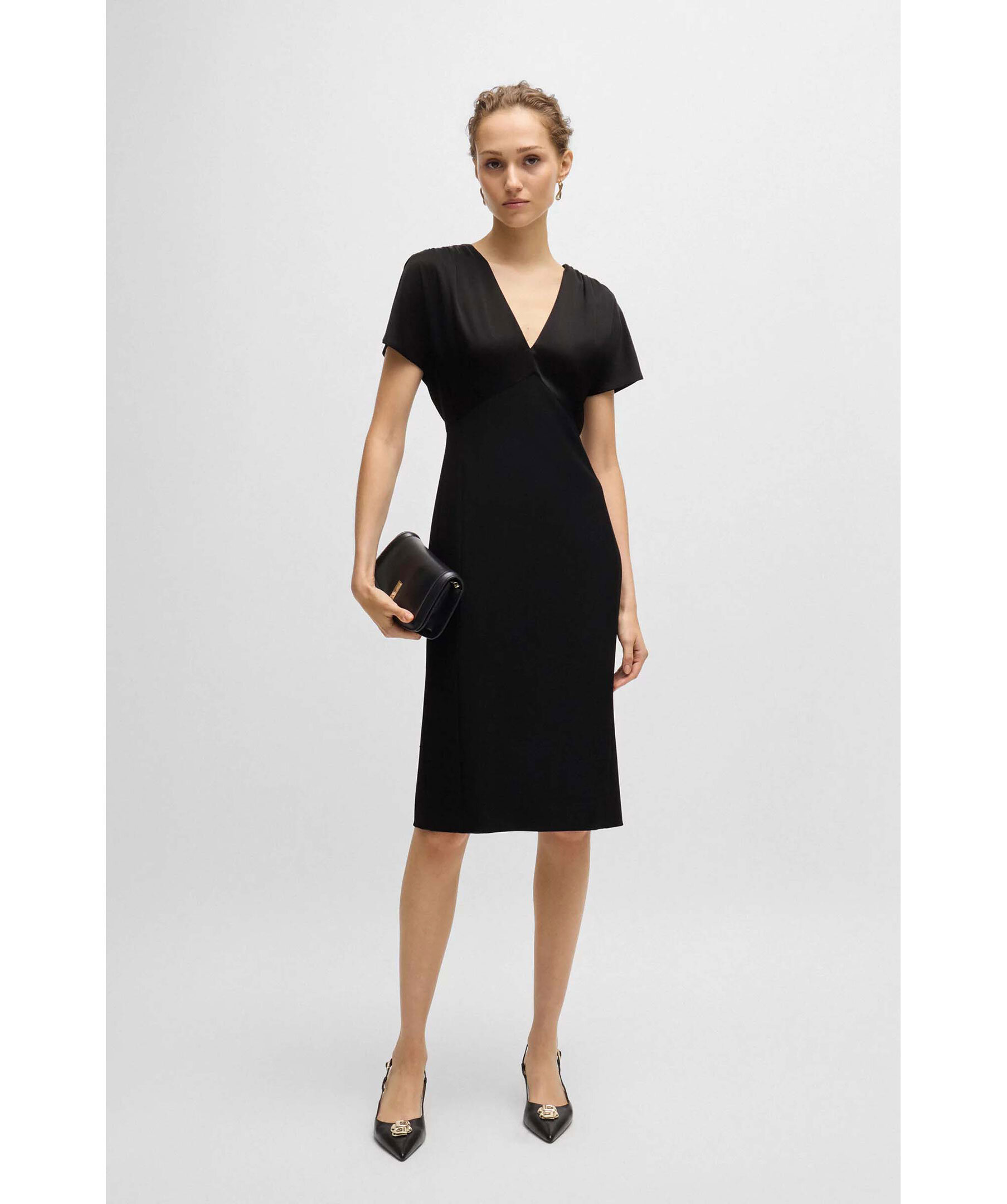 Svart klänning från BOSS Black. Klänningen är V-ringad, stängs med subtil dragkedja i bak och har slits vid ärmarna. Tyget är blandat med både glansigt och matt material, tillverkad av en viskos blandning.