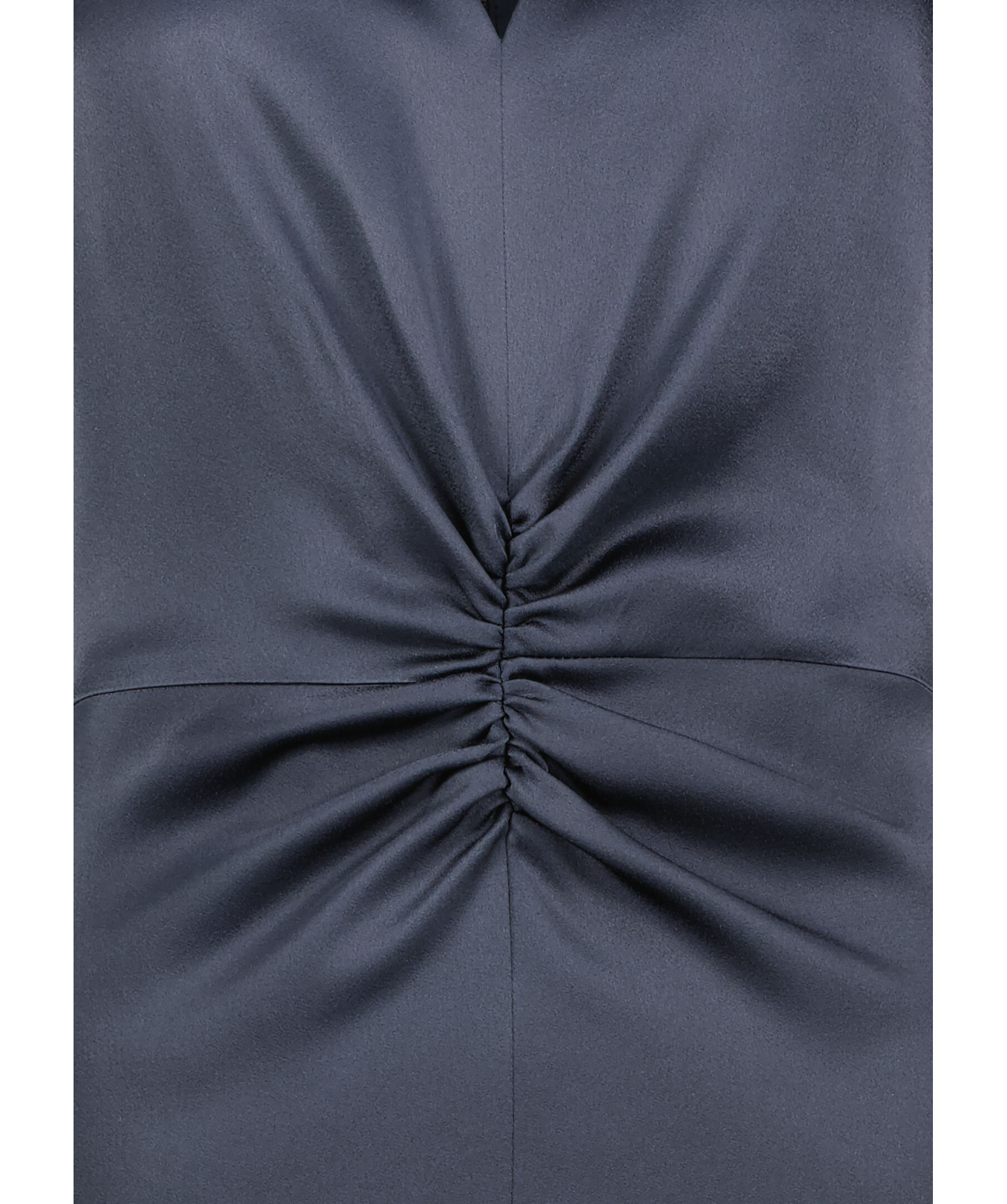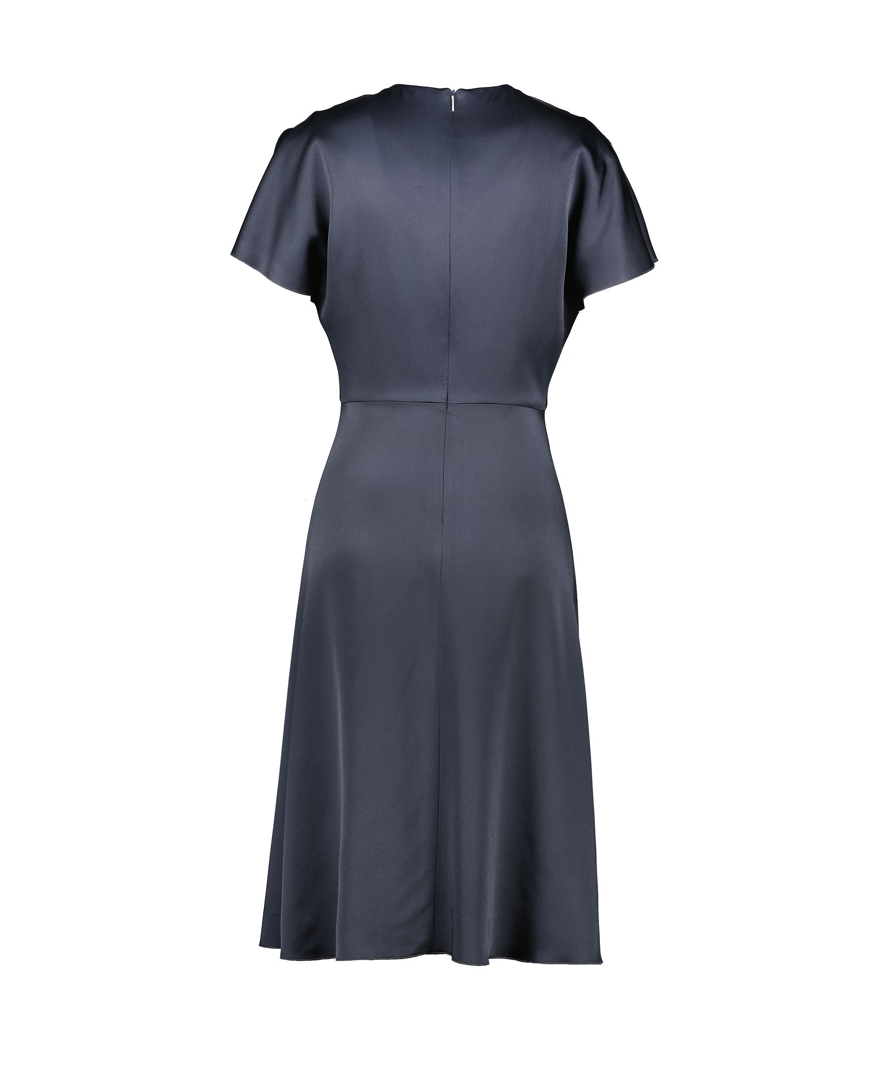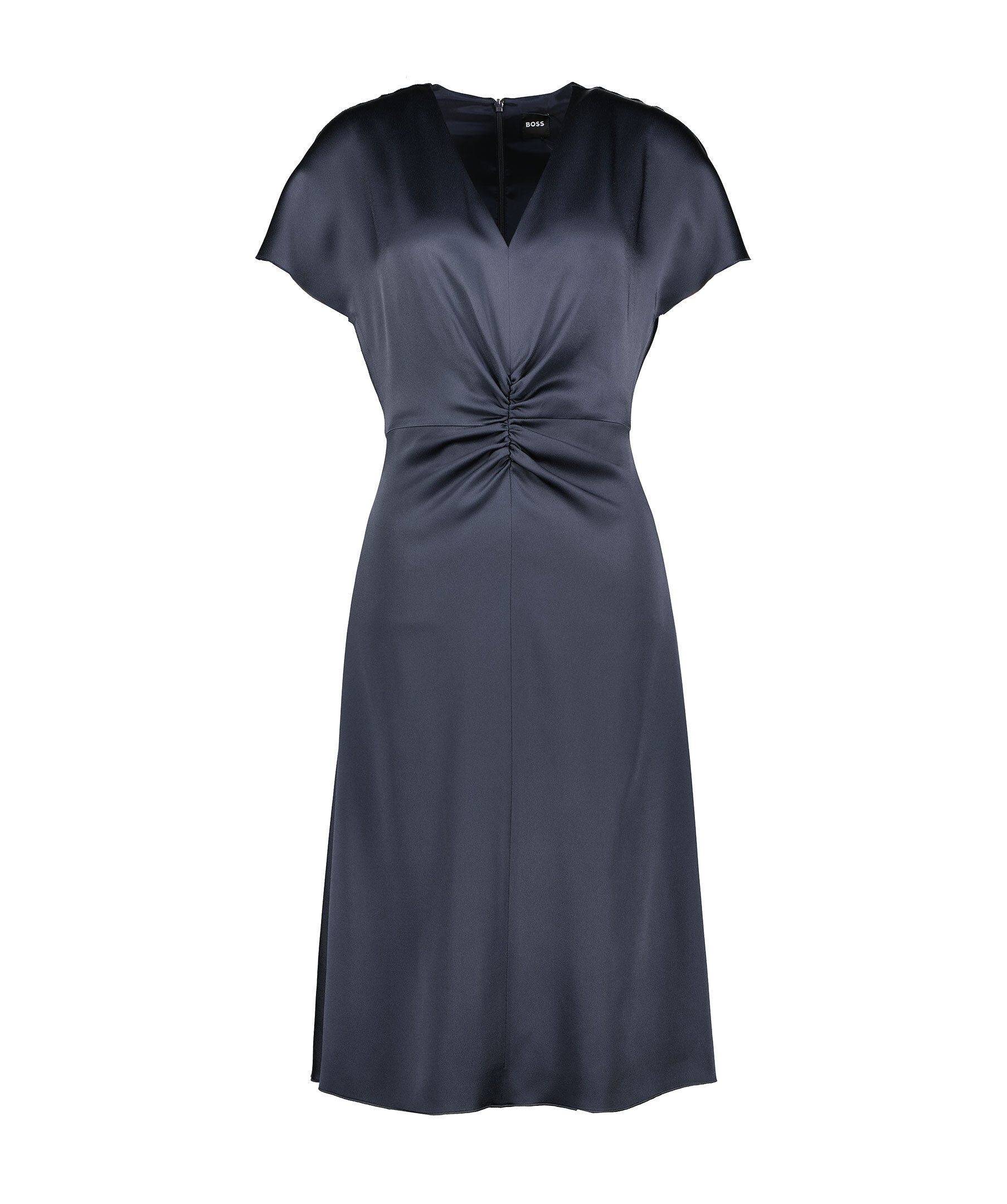 Mörkblå klänning från Boss Black. Klänningen har draperade detaljer vid midjan, V-ringning och korta lösa ärmar med slits. Stängs med dold dragkedja bak. Midilängd. Tillverkad av en acetatbladning.
