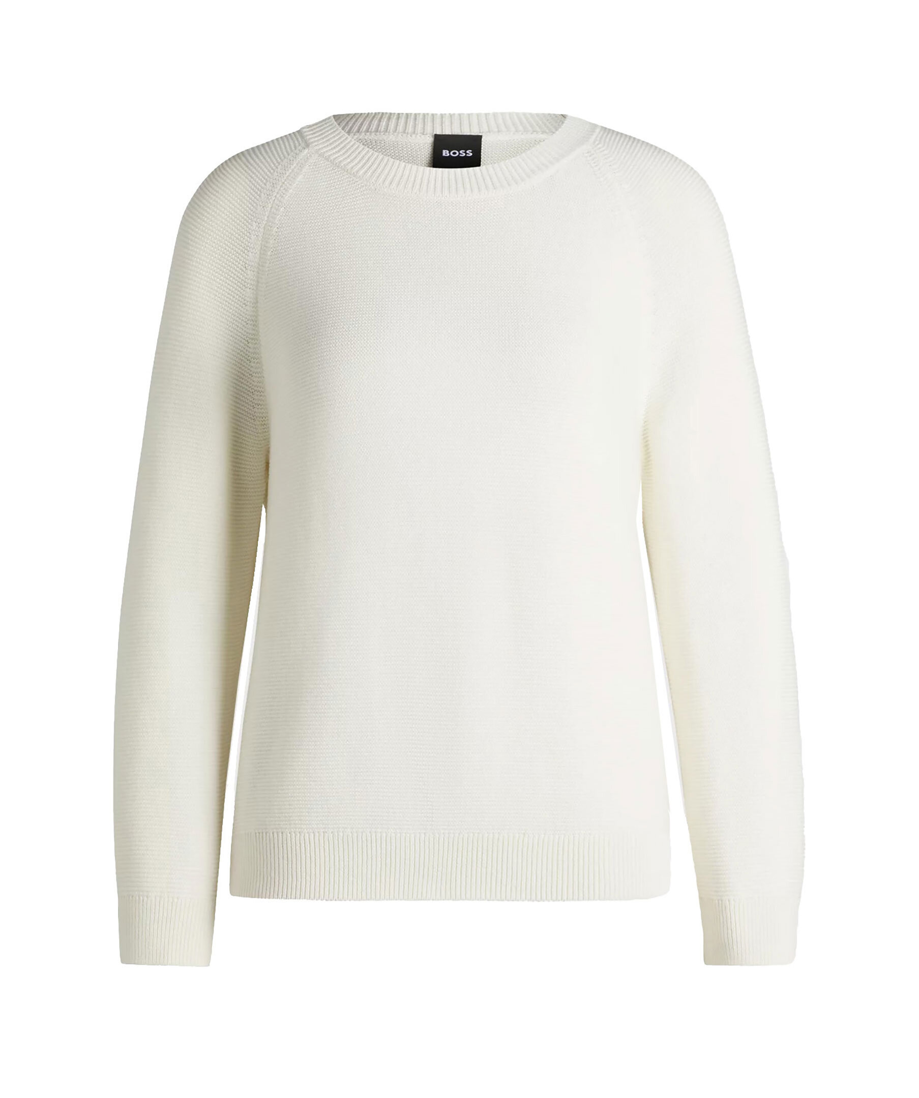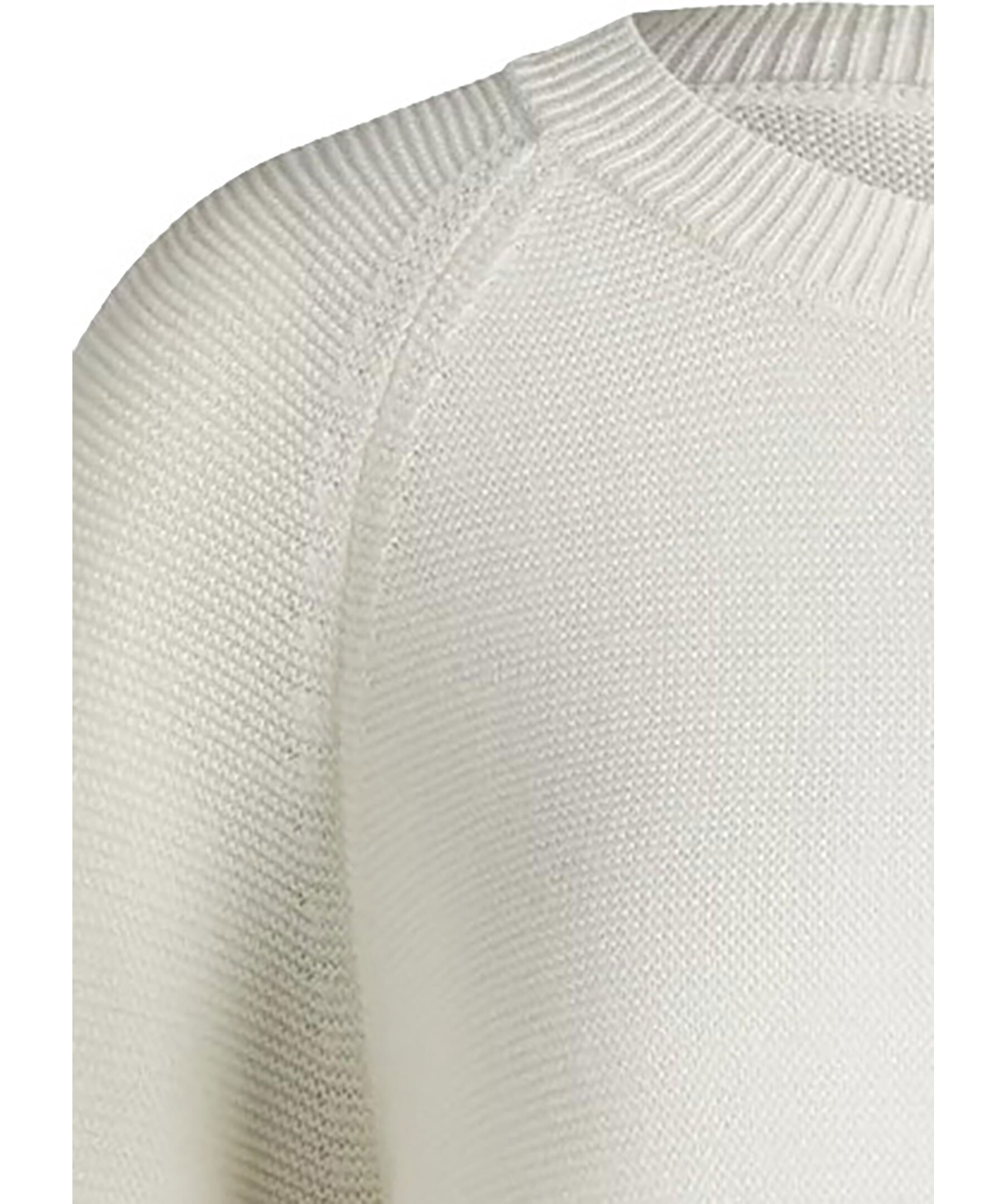 Vit stickad tröja från Boss Black. Tröjan har ribbstickad halsringning samt ribbstickade ärm- och tröjslut. Tillverkad av 100% bomull.