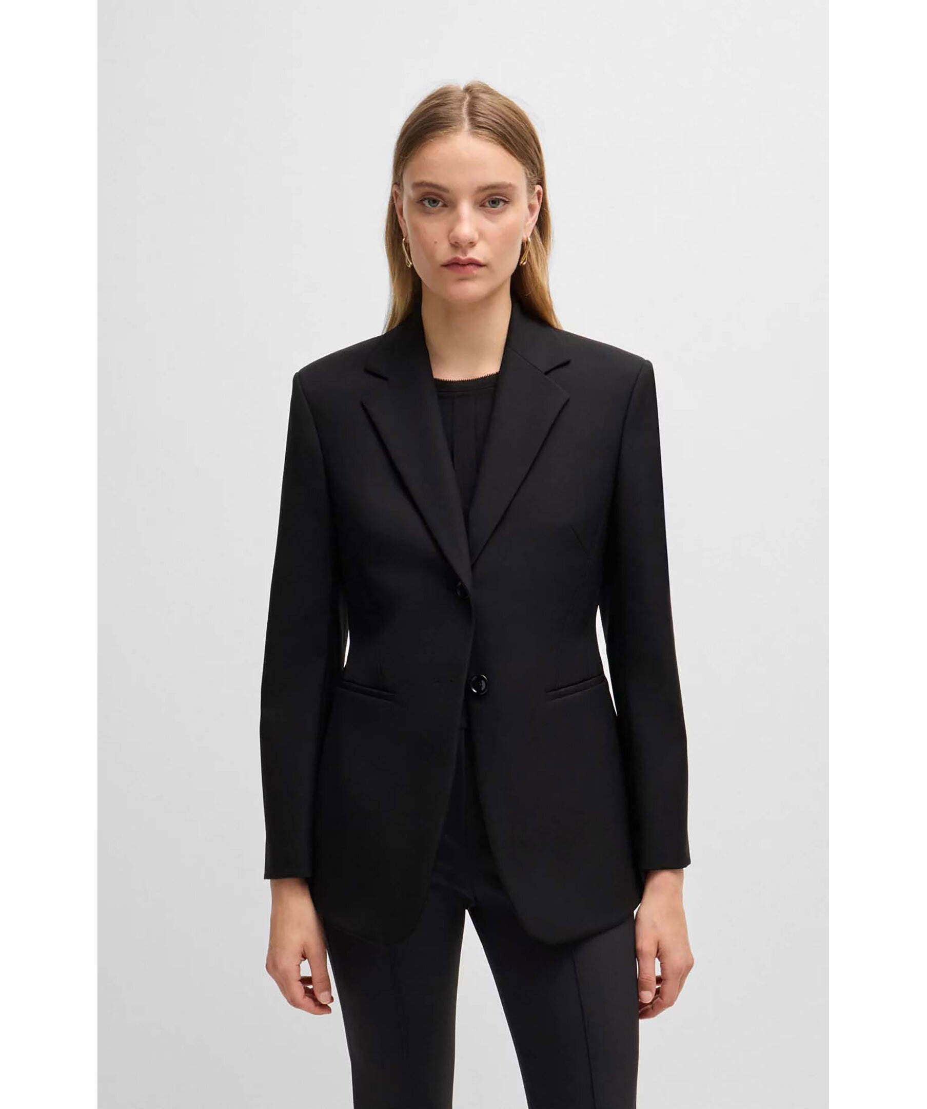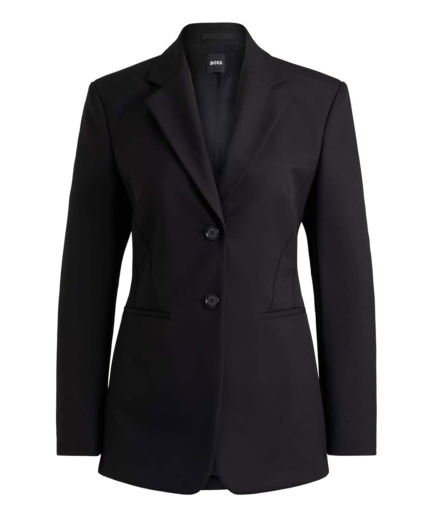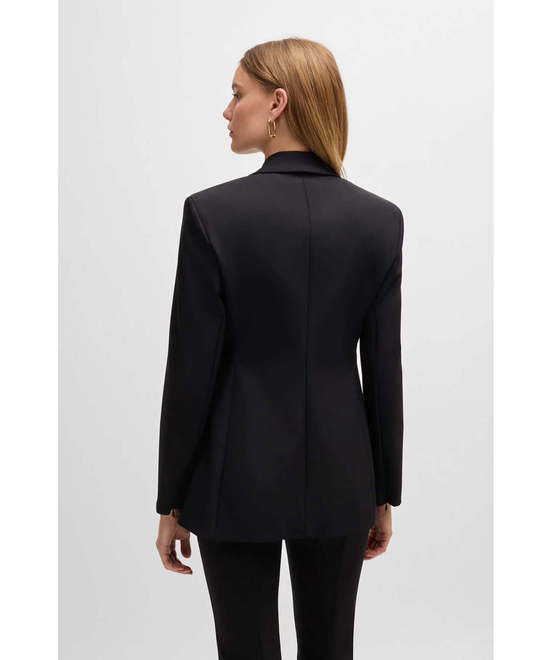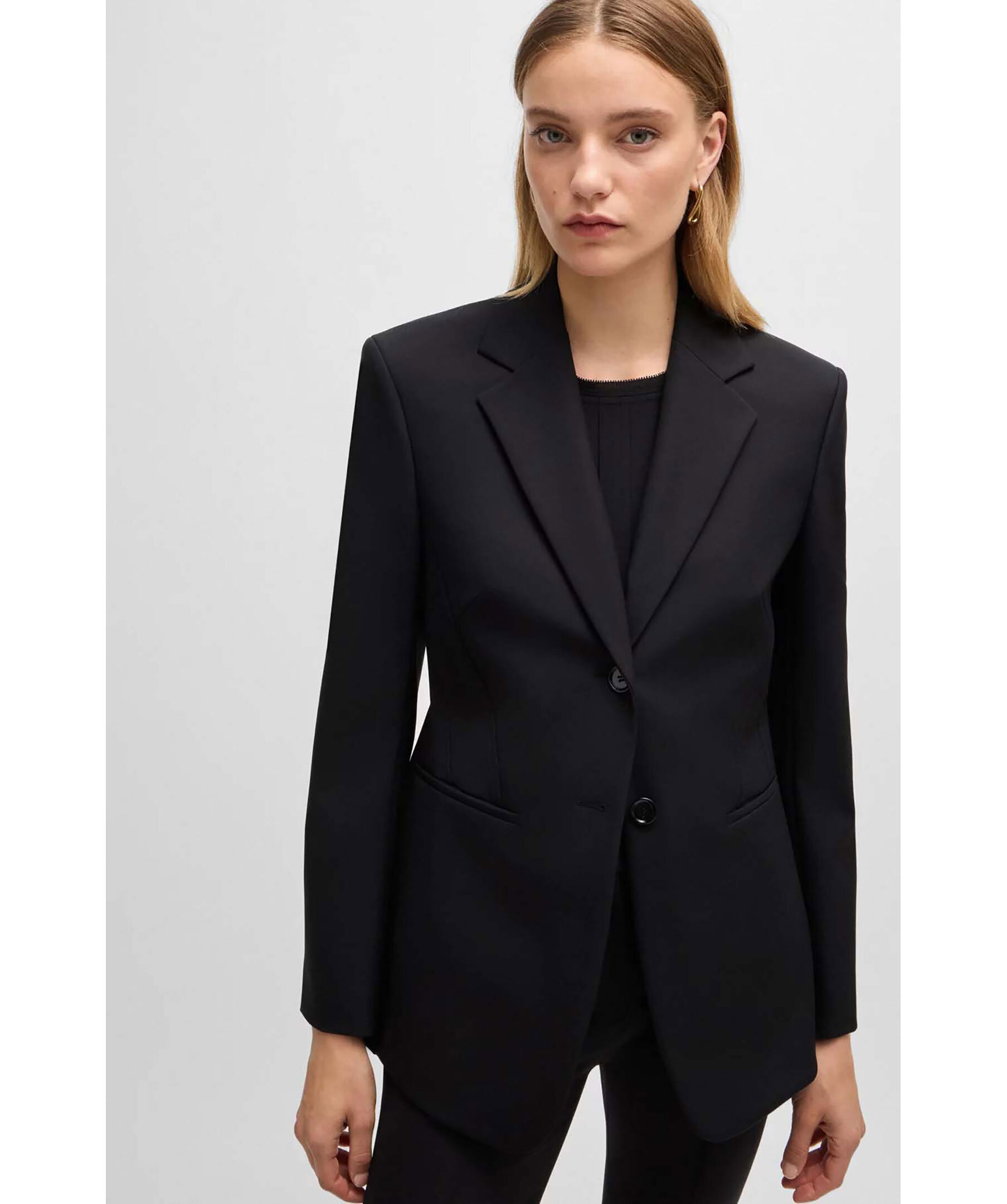 Svart kavaj från Boss Black. Kavajen har en längre och feminin skärning, stängs med knappar. Kavajen har två passpoalfickor, med dekorativa sömmar som löper från fickorna upp till armhålan på kavajen. Samt en innerficka med knapp. Tillverkad av en polyamidblandning.