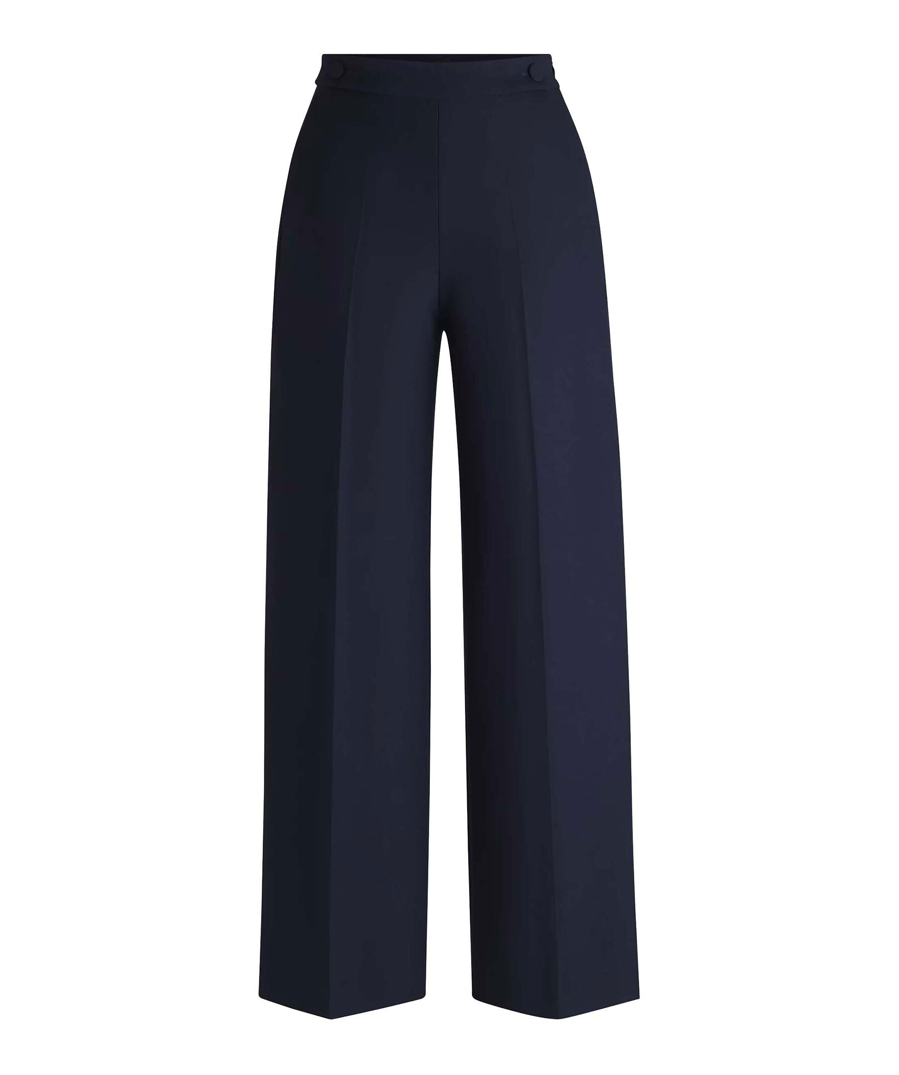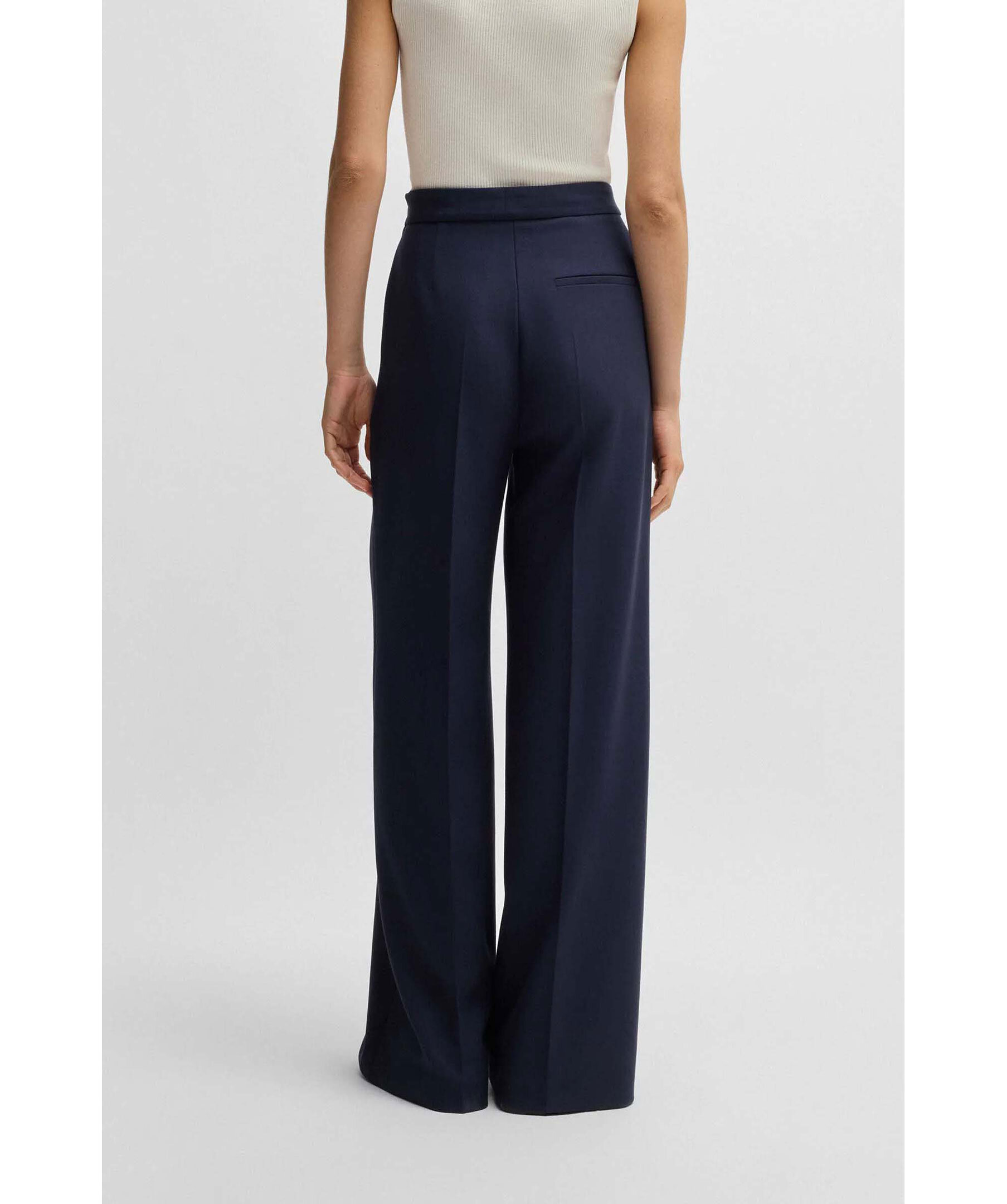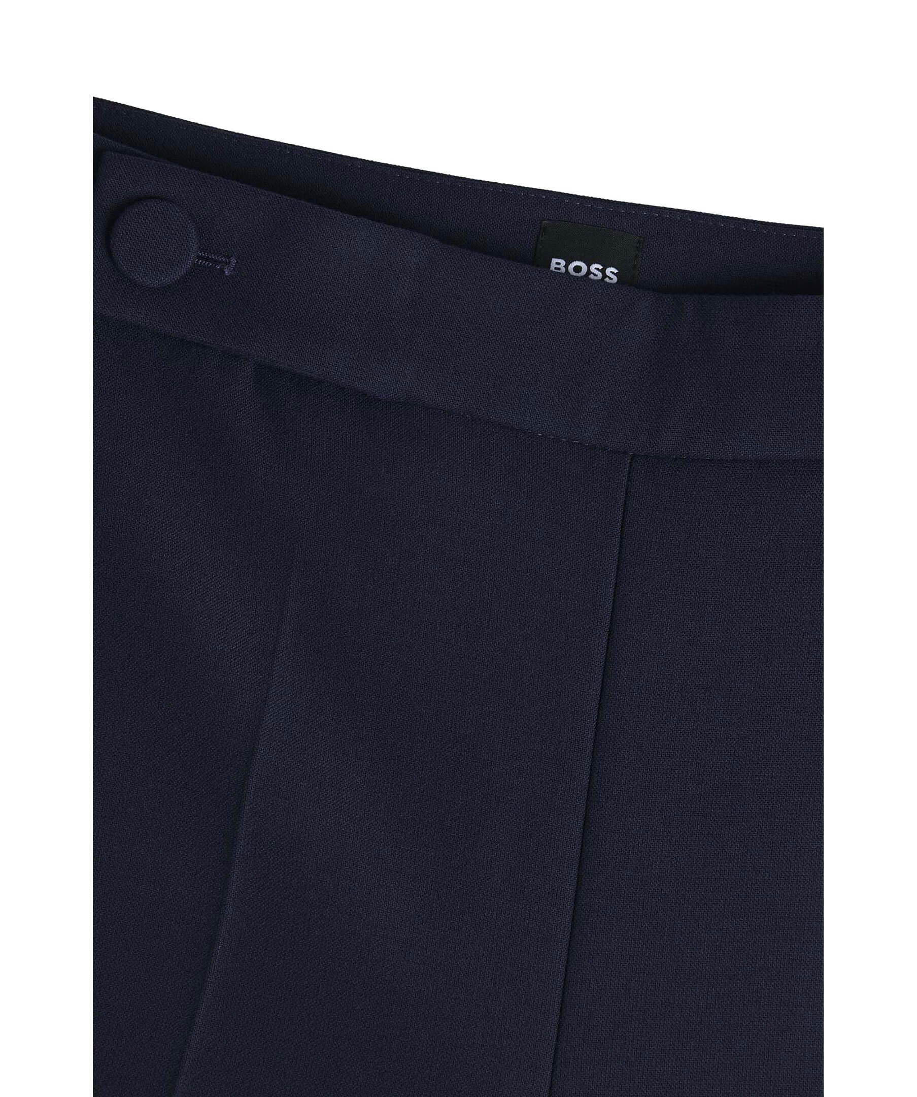 Mörkblåa kostymbyxor från BOSS Black. Byxorna har vida ben, två täckta knappar på midjebandet, två sidfickor samt en weltficka baktill. Tillverkade i en viskosblandning.