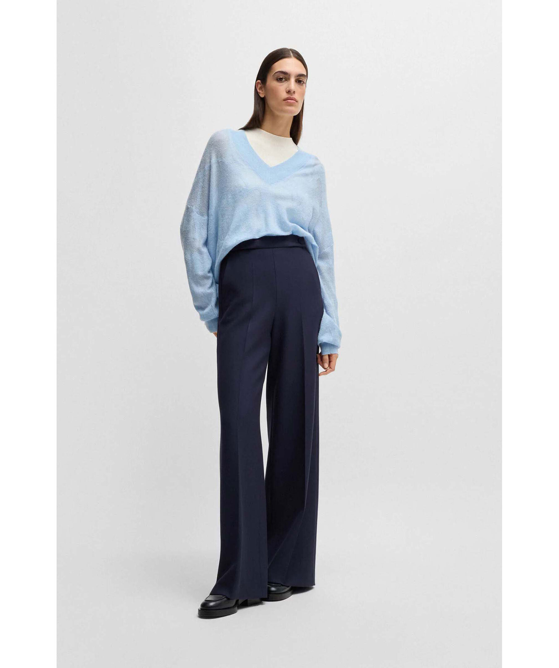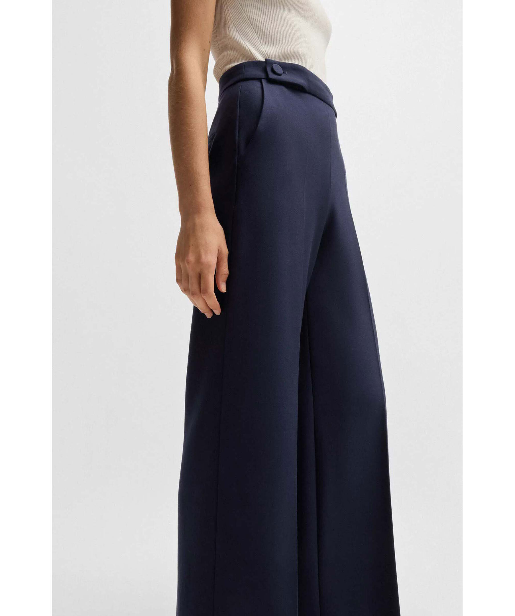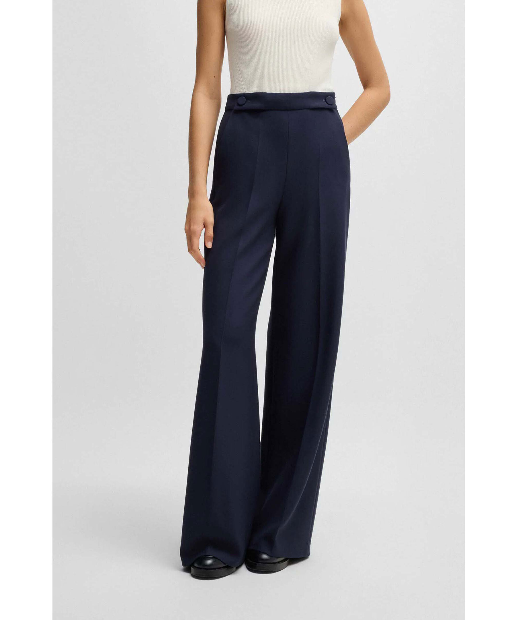 Mörkblåa kostymbyxor från BOSS Black. Byxorna har vida ben, två täckta knappar på midjebandet, två sidfickor samt en weltficka baktill. Tillverkade i en viskosblandning.