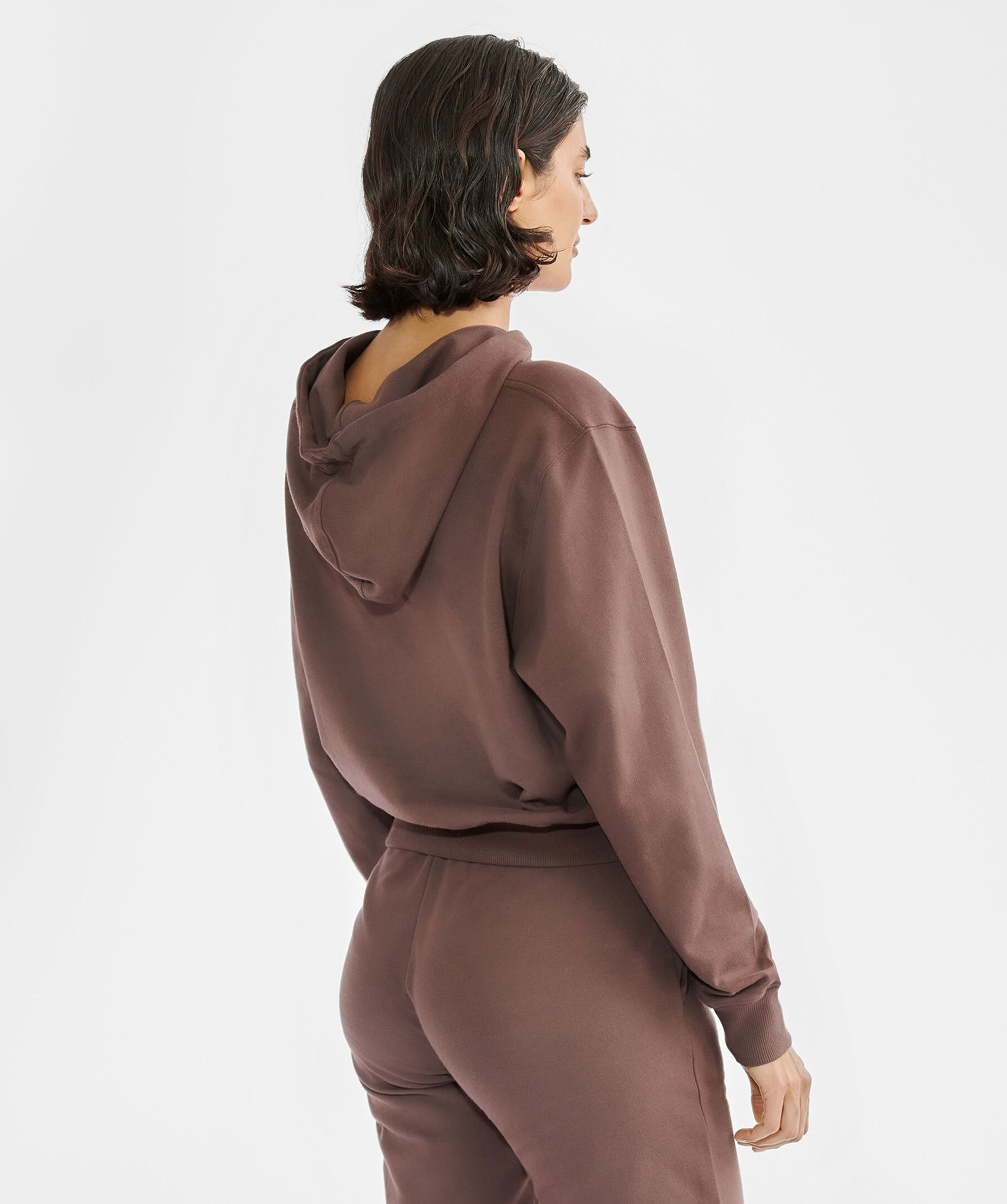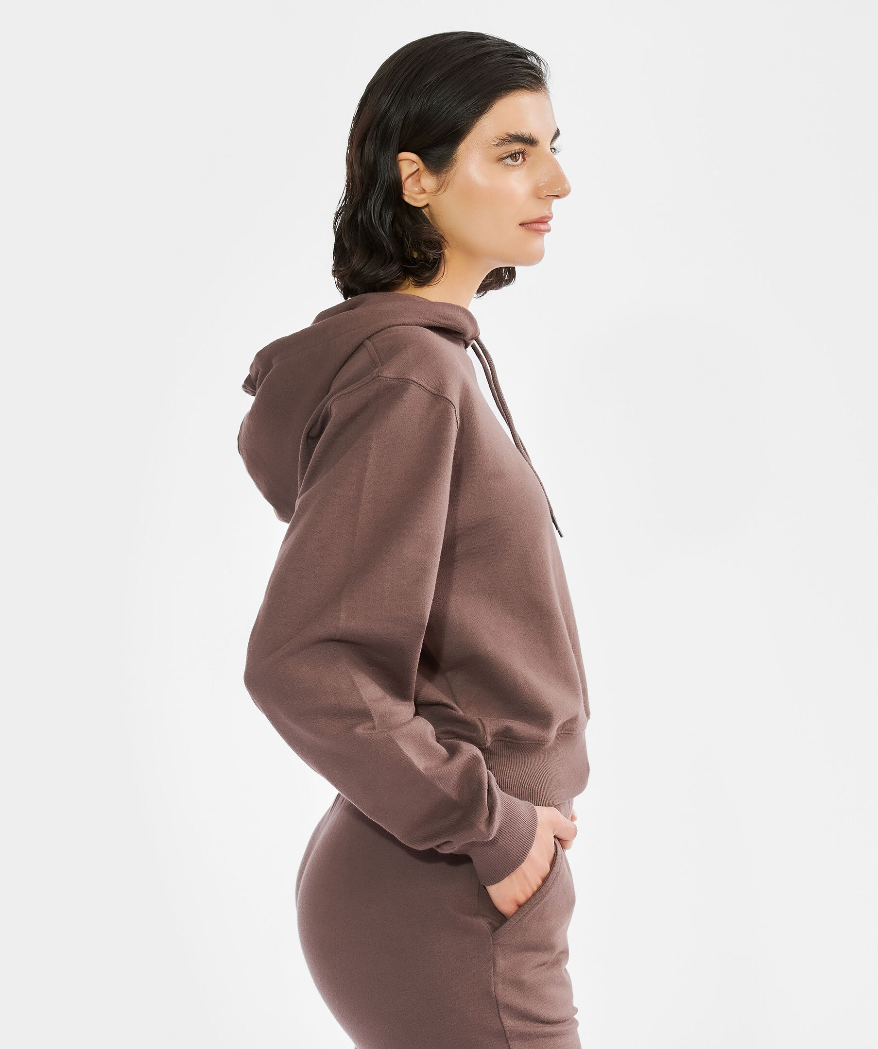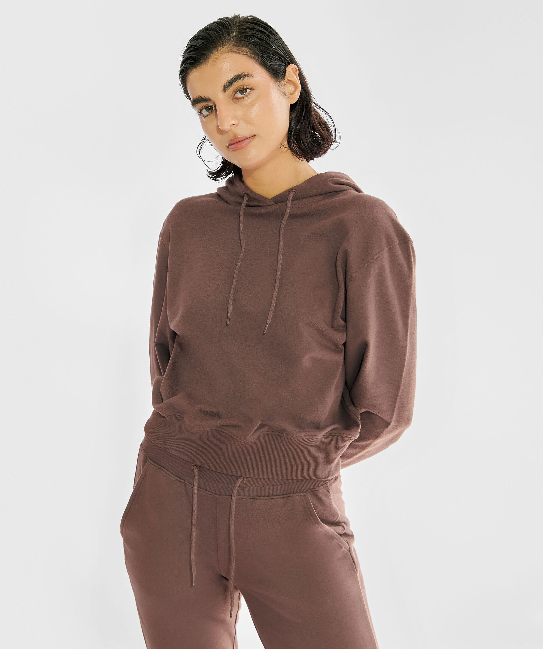 Brun hoodie från Bread & Boxers. Tillverkad i 100% ekologisk bomull. Kort boxig modell, luva med snören i bomull. Ribbad mudd i midje- och ärmslut.