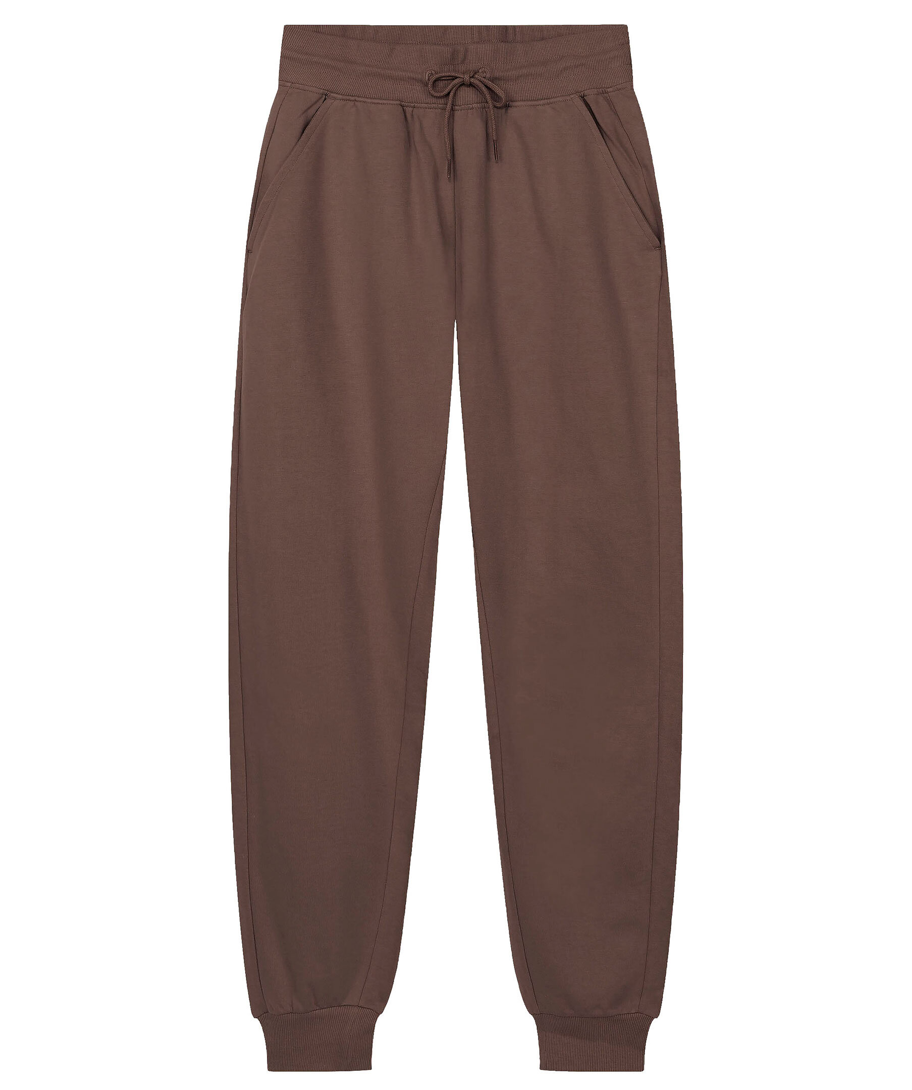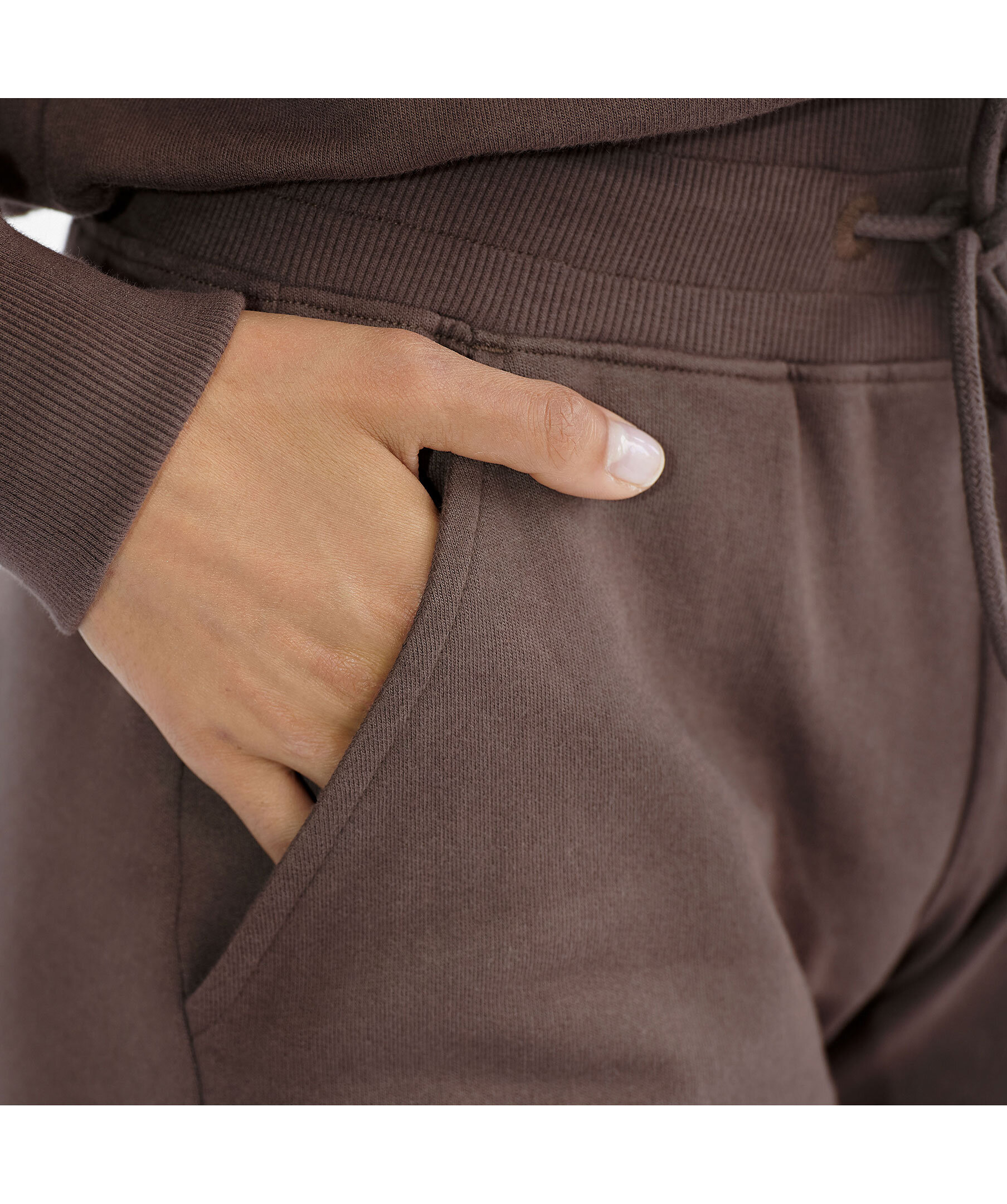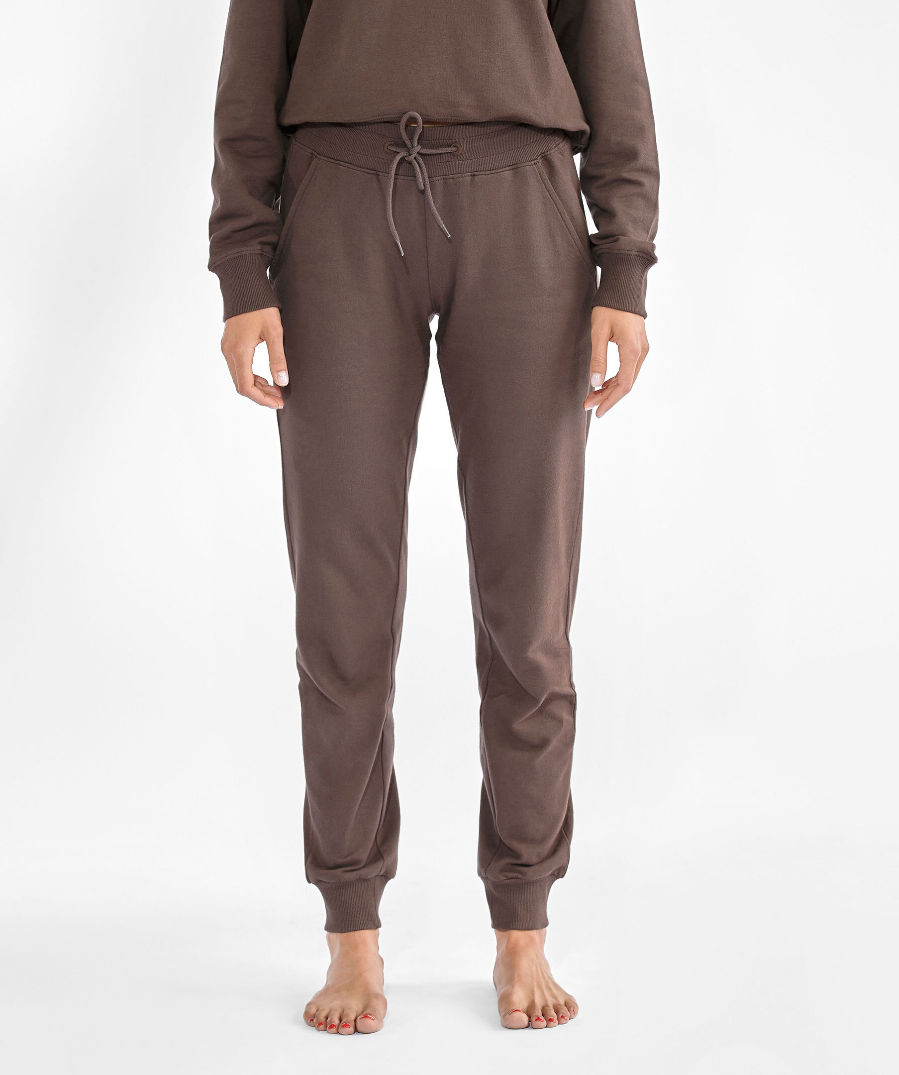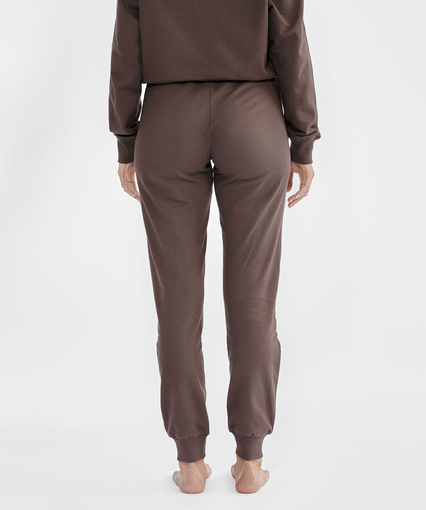 Bruna mjukisbyxor från Bread&Boxers. Tillverkade i 100% ekologisk bomull. Ribbad midja med med snören i bomull. Ribbad mudd i benslut och snedställda, öppna framfickor.