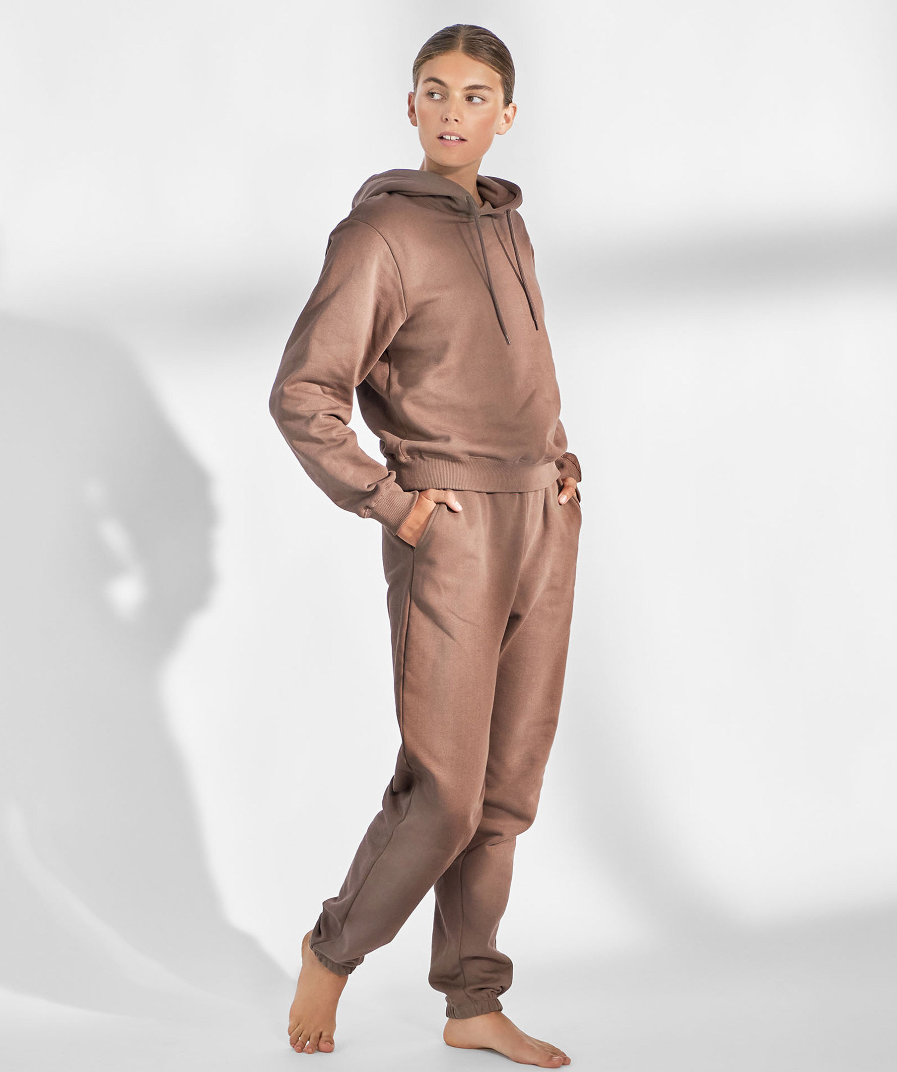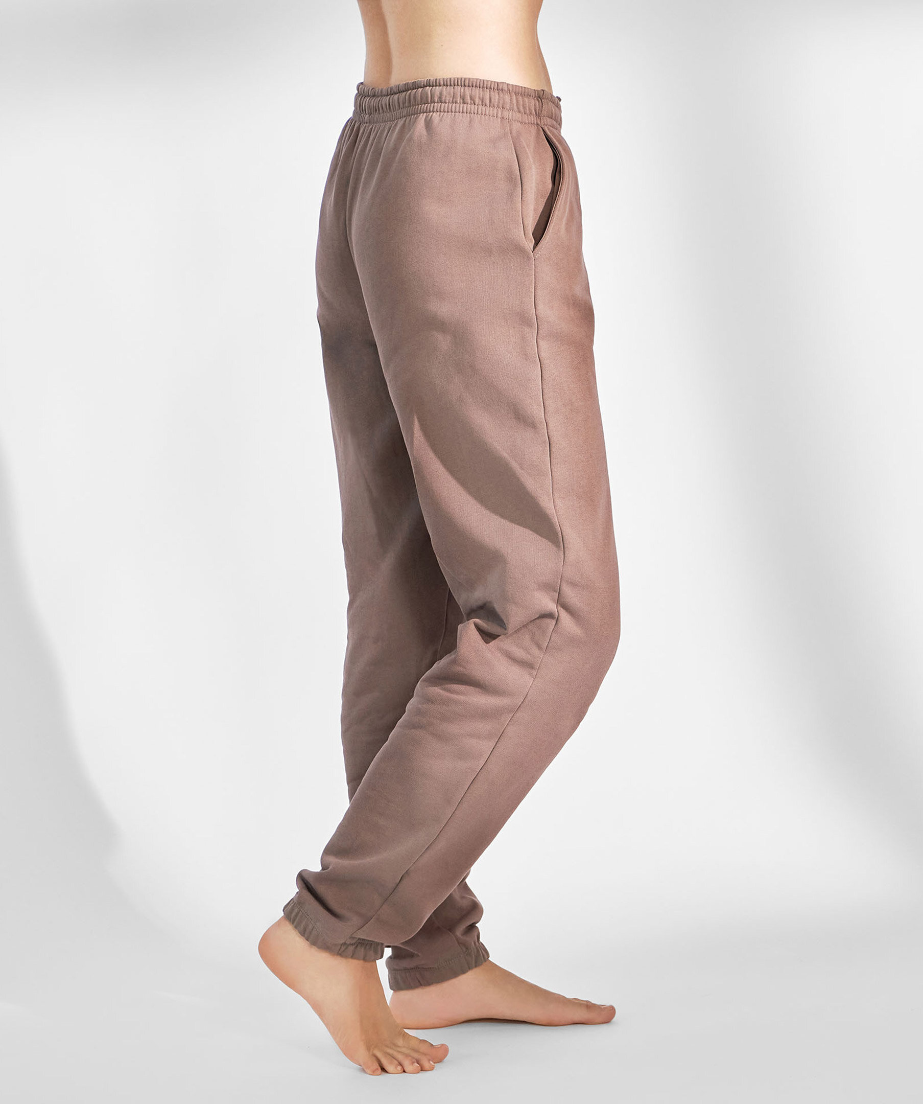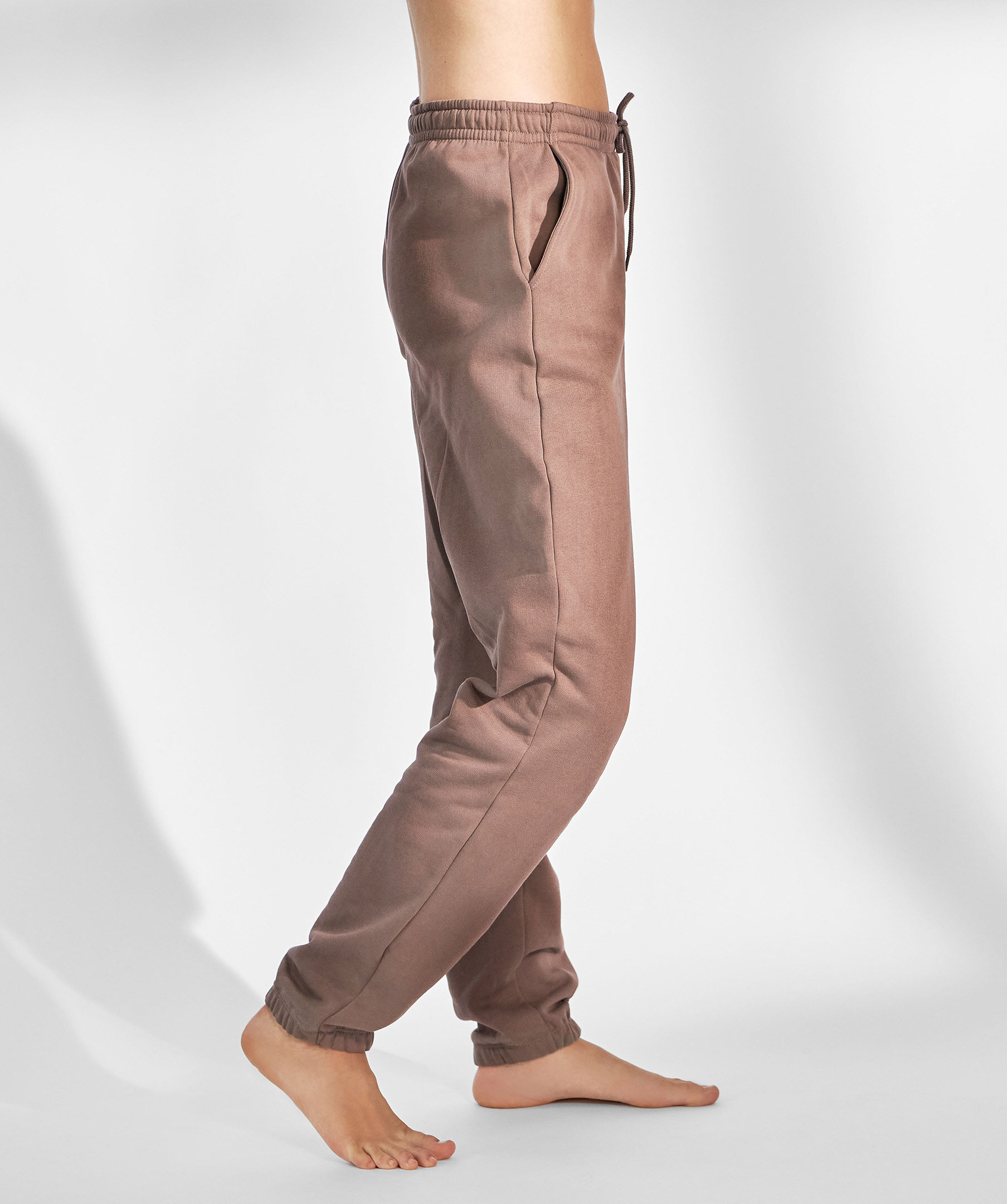 Bruna mjukisbyxor från Bread & Boxers. Tillverkade i en tjock ekologisk bomull vilket ger härlig stadga och fint fall. Den borstade insidan påminner om fleece och gör plagget mjukt mot huden. Byxorna har högre midja och smal passform, snedställda fickor, dragsko i midjan och ribbstickade muddar i bensluten. Ett mångsidigt plagg som passar lika fint hemma som till matchande hoodie och sneakers på väg till gymmet.Modellen på bilden är 173 cm lång och bär storlek S.